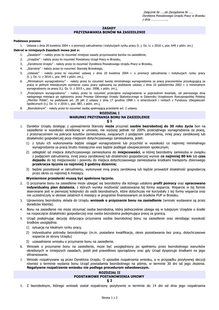 Załącznik Nr …..do Zarządzenia Nr ….. Dyrektora Powiatowego Urzędu Pracy w Brzesku z dnia ………………... ZASADY PRZYZNAWANIA BONÓW NA ZASIEDLENIE Podstawa prawna: 1. Ustawa z dnia 20 kwietnia 2004 r. o promocji zatrudnienia i instytucjach rynku pracy (t. j. Dz. U. z 2016 r., poz. 645 z późn. zm.) Ilekroć w niniejszych Zasadach mowa jest o: 1. „Zasadach" – należy przez to rozumieć niniejsze zasady przyznawania bonów na zasiedlenie, 2. „Urzędzie” - należy przez to rozumieć Powiatowy Urząd Pracy w Brzesku, 3. „Dyrektorze Urzędu” - należy przez to rozumieć Dyrektora Powiatowego Urzędu Pracy w Brzesku, 4. „Staroście” - należy przez to rozumieć Starostę Brzeskiego, 5. „Ustawie” - należy przez to rozumieć ustawę z dnia 20 kwietnia 2004 r. o promocji zatrudnienia i instytucjach rynku pracy (t. j. Dz. U. z 2016 r., poz. 645 z późn. zm.), 6. „Minimalnym wynagrodzeniu” - należy przez to rozumieć kwotę minimalnego wynagrodzenia za pracę pracowników przysługującą za pracę w pełnym miesięcznym wymiarze czasu pracy ogłaszaną na podstawie ustawy z dnia 10 października 2002 r. o minimalnym wynagrodzeniu za pracę (t.j. Dz. U. z 2015 r., poz. 2008, z późn. zm.), 7. „Przeciętnym wynagrodzeniu” - należy przez to rozumieć przeciętne wynagrodzenie w poprzednim kwartale, od pierwszego dnia następnego miesiąca po ogłoszeniu przez Prezesa Głównego Urzędu Statystycznego w Dzienniku Urzędowym Rzeczpospolitej Polskiej „Monitor Polski”, na podstawie art. 20 pkt 2 ustawy z dnia 17 grudnia 1998 r. o emeryturach i rentach z Funduszu Ubezpieczeń Społecznych (t.j. Dz. U. z 2016 r., poz. 887, z późn. zm.), 8. „Bezrobotnym” - należy przez to rozumieć osobę spełniającą przesłanki art. 2 ustawy. ROZDZIAŁ I WARUNKI PRZYZNANIA BONU NA ZASIEDLENIE §1 1. Dyrektor Urzędu działając z upoważnienia Starosty może przyznać osobie bezrobotnej do 30 roku życia bon na zasiedlenie w wysokości określonej w umowie, nie wyższej jednak niż 200% przeciętnego wynagrodzenia za pracę, z przeznaczeniem na pokrycie kosztów zamieszkania, związanych z podjęciem zatrudnienia, innej pracy zarobkowej lub działalności gospodarczej poza miejscem dotychczasowego zamieszkania, jeżeli: 1) z tytułu ich wykonywania będzie osiągał wynagrodzenie lub przychód w wysokości co najmniej minimalnego wynagrodzenia za pracę brutto miesięcznie oraz będzie podlegał ubezpieczeniom społecznym; 2) odległość od miejsca dotychczasowego zamieszkania do miejscowości, w której bezrobotny zamieszka w związku z podjęciem zatrudnienia, innej pracy zarobkowej lub działalności gospodarczej wynosi co najmniej 80 km lub czas dojazdu do tej miejscowości i powrotu do miejsca dotychczasowego zamieszkania środkami transportu zbiorowego przekracza łącznie co najmniej 3 godziny dziennie; 3) będzie pozostawał w zatrudnieniu, wykonywał inną pracę zarobkową lub będzie prowadził działalność gospodarczą przez okres co najmniej 6 miesięcy. Wymienione przesłanki muszą być spełnione łącznie. 2. O przyznanie bonu na zasiedlenie może ubiegać się bezrobotny dla którego ustalono profil pomocy oraz opracowano indywidualny plan działania, z których wynika możliwość zastosowania tej formy wsparcia. Wsparcie w tej formie skierowane jest w pierwszej kolejności do osób bezrobotnych, które dotychczas nie korzystały z tej formy wsparcia oraz nie uczestniczyły w okresie ostatnich 6 miesięcy w programie finansowanym ze środków PUP w Brzesku. 3. Uprawniony bezrobotny składa do Urzędu wniosek o przyznanie bonu na zasiedlenie (wnioski wydawane są przez doradców klienta). 4. Bonu na zasiedlenie nie może otrzymać osoba bezrobotna, która jednocześnie ubiega się w tutejszym Urzędzie o środki na rozpoczęcie działalności gospodarczej oraz osoba bezrobotna podejmująca pracę za granicą. 5. Urząd podejmując decyzję dotycząca przyznania osobie bezrobotnej bonu na zasiedlenie oraz określając wysokość środków uwzględnia: 1) sytuację na lokalnym rynku pracy, 2) indywidualne potrzeby bezrobotnego (m.in. posiadane kwalifikacje, okres pozostawania bez pracy, dotychczasowe wsparcie ze strony Urzędu) 3) uzasadnienie wniosku o przyznanie bonu na zasiedlenie. 6. Wniosek o przyznanie bonu na zasiedlenie, może być uwzględniony po spełnieniu przez bezrobotnego warunków określonych w niniejszych zasadach, jeżeli jest prawidłowo sporządzony oraz gdy Urząd dysponuje środkami na jego sfinansowanie. 7. Wnioski rozpatrywane są przez Dyrektora Urzędu. O sposobie rozpatrzenia wniosku, a w przypadku pozytywnej decyzji również o terminie wydania bonu Urząd powiadamia bezrobotnego na piśmie, w terminie 30 dni od jego złożenia. Negatywne rozpatrzenie wniosku nie podlega procedurom odwoławczym. ROZDZIAŁ II PODSTAWOWE POSTANOWIENIA UMOWY §2 1. Z bezrobotnym, którego wniosek został rozpatrzony pozytywnie w terminie do 14 dni od dnia jego rozpatrzenia Strona 1 z 2 podpisywana jest stosowna umowa. Dzień podpisania umowy jest równoznaczny z datą przyznania bonu. 2. Środki finansowe wypłacane są jednorazowo na wskazany rachunek bankowy bezrobotnego niezwłocznie po przyznaniu bonu. 3. Bezrobotny, który otrzymał bon na zasiedlenie, jest zobowiązany w terminie: 1) do 30 dni od dnia otrzymania bonu na zasiedlenie dostarczyć do Urzędu dokument potwierdzający podjęcie zatrudnienia, innej pracy zarobkowej lub działalności gospodarczej oraz oświadczenie o spełnieniu warunku o którym mowa w § 1 ust. 1 pkt 2, 2) do 7 dni, odpowiednio od dnia utraty zatrudnienia, innej pracy zarobkowej lub zaprzestania wykonywania działalności gospodarczej i od dnia podjęcia nowego zatrudnienia, innej pracy zarobkowej lub działalności gospodarczej, przedstawić Urzędowi oświadczenie o utracie zatrudnienia, innej pracy zarobkowej lub zaprzestaniu wykonywania działalności gospodarczej i podjęciu nowego zatrudnienia