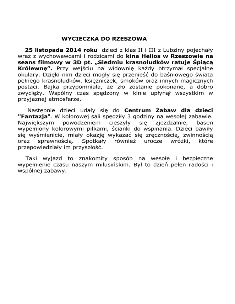 WYCIECZKA DO RZESZOWA 25 listopada 2014 roku dzieci z klas II i III z Lubziny pojechały wraz z wychowawcami i rodzicami do kina Helios w Rzeszowie na seans filmowy w 3D pt. „Siedmiu krasnoludków ratuje Śpiącą Królewnę”. Przy wejściu na widownię każdy otrzymał specjalne okulary. Dzięki nim dzieci mogły się przenieść do baśniowego świata pełnego krasnoludków, księżniczek, smoków oraz innych magicznych postaci. Bajka przypomniała, że zło zostanie pokonane, a dobro zwycięży. Wspólny czas spędzony w kinie upłynął wszystkim w przyjaznej atmosferze. Następnie dzieci udały się do Centrum Zabaw dla dzieci "Fantazja". W kolorowej sali spędziły 3 godziny na wesołej zabawie. Największym powodzeniem cieszyły się zjeżdżalnie, basen wypełniony kolorowymi piłkami, ścianki do wspinania. Dzieci bawiły się wyśmienicie, miały okazję wykazać się zręcznością, zwinnością oraz sprawnością. Spotkały również urocze wróżki, które przepowiedziały im przyszłość. Taki wyjazd to znakomity sposób na wesołe i bezpieczne wypełnienie czasu naszym milusińskim. Był to dzień pełen radości i wspólnej zabawy.