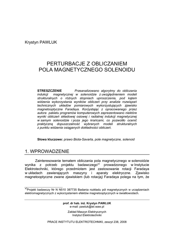 Krystyn PAWLUK PERTURBACJE Z OBLICZANIEM POLA MAGNETYCZNEGO SOLENOIDU STRESZCZENIE Przeanalizowano algorytmy do obliczania indukcji magnetycznej w solenoidzie z uwzględnieniem modeli strukturalnych o róŜnych stopniach uproszczenia, pod kątem widzenia wykorzystania wyników obliczeń przy analizie rozwiązań technicznych układów pomiarowych wykorzystujących zjawisko magnetooptyczne Faradaya. Korzystając z opracowanego przez autora pakietu programów komputerowych zaprezentowano niektóre wyniki obliczeń składowej osiowej i radialnej indukcji magnetycznej w samym solenoidzie i poza jego krańcami, co pozwoliło ocenić praktyczną dopuszczalność wybranych modeli strukturalnych z punktu widzenia osiąganych dokładności obliczeń. Słowa kluczowe: prawo Biota-Savarta, pole magnetyczne, solenoid 1. WPROWADZENIE Zainteresowanie tematem obliczania pola magnetycznego w solenoidzie wynika z potrzeb projektu badawczego*) prowadzonego w Instytucie Elektrotechniki, którego przedmiotem jest zastosowanie rotacji Faradaya w układach zawierających maszyny i aparaty elektryczne. Zjawisko magnetooptyczne zwane zjawiskiem (lub rotacją) Faradaya polega na tym, Ŝe *)Projekt badawczy Nr N N510 387735 Badania rozkładu pól magnetycznych w urządzeniach elektromagnetycznych z wykorzystaniem efektów magnetooptycznych w światłowodach. prof. dr hab. inŜ. Krystyn PAWLUK e-mail: [email protected] Zakład Maszyn Elektrycznych Instytut Elektrotechniki PRACE INSTYTUTU ELEKTROTECHNIKI, zeszyt 238, 2008 6 K. Pawluk gdy na liniowo spolaryzowany strumień świetlny w środowisku dielektrycznym oddziałuje stacjonarne pole magnetyczne, którego wektor indukcji jest skierowany zgodnie z kierunkiem strumienia świetlnego, to jego płaszczyzna polaryzacji ulega skręceniu o kąt: β=V Bd (1) gdzie B – indukcja magnetyczna, d – długość obszaru pola magnetycznego działającego na strumień świetlny, V – stała Verdeta, wyraŜona w rad/(T·m). Kierunek skręcenia płaszczyzny polaryzacji moŜe być zgodny z ruchem wskazówek zegara lub przeciwny, w zaleŜności od tego, czy kierunki strumienia świetlnego i wektora indukcji magnetycznej są równo- czy antyrównoległe. Na zjawisku Faradaya opiera się działanie pewnych przyrządów pomiarowych. W Instytucie Elektrotechniki prowadzi się aktualnie prace badawcze co do moŜliwości jego wykorzystania w maszynach i aparatach elektrycznych [8]. Odpowiednie konstrukcje mogą polegać na usytuowaniu światłowodu wewnątrz solenoidu wytwarzającego pole magnetyczne. Przez światłowód przepuszcza się liniowo spolaryzowany strumień świetlny i mierzy się skręcenie kąta polaryzacji po drugiej stronie solenoidu. Niniejsza praca jest poświęcona technice obliczania indukcji magnetycznej w prostoliniowym solenoidzie, zarówno w jego wnętrzu jak i w obszarach poza właściwym solenoidem, tj. wszędzie tam, gdzie miałby być usytuowany światłowód. Indukcja magnetyczna wewnątrz solenoidu nie jest stała w poszczególnych punktach solenoidu, lecz wykazuje charakterystyczną zmienność osiową i promieniową. śeby na podstawie zmierzonego skręcenia kąta polaryzacji promienia świetlnego moŜna było wnioskować o wartości indukcji magnetycznej, jej rozkład przestrzenny w samym solenoidzie i poza jego krańcami powinien być ilościowo rozpoznany i obliczony z wystarczającą dokładnością. Klasyczna elektrotechnika zajmowała się problemem pola magnetycznego w solenoidzie juŜ od bardzo dawna dostarczając szeregu wzorów matematycznych na obliczanie indukcji magnetycznej w solenoidzie, patrz [3] i [6]. Poszczególne wyraŜenia podawane przez róŜnych autorów róŜnią się między sobą przyjmowanymi załoŜeniami upraszczającymi, co skutkuje pewnymi rozbieŜnościami w dokładności obliczanych wyników. Przystępując do zreferowania tego problemu wprowadzimy podstawowe oznaczenia: Ns – liczba zwojów cewki solenoidu, przy czym ograniczamy się tutaj do uzwojenia jednowarstwowego1), 1) Uzwojenie wielowarstwowe uwzględnia się w drodze prostej superpozycji wyników. Perturbacje z obliczaniem pola magnetycznego solenoidu 7 L s – długość solenoidu, którą traktujemy jako równą: ps (Ns – 1), gdzie p s reprezentuje poskok osiowy uzwojenia równy szerokości przewodu liczonej wraz z izolacją plus odstęp międzyuzwojeniowy, Rs – średni promień solenoidu liczony od jego osi do środka przekroju przewodu cewki, Is – prąd solenoidu. Przytoczymy tu uproszczenia przyjmowane przez róŜnych autorów w teorii pola magnetycznego solenoidu [3], [6], [7]. Według zasadniczej idei tych uproszczeń rozmiar przekroju przewodu tworzącego solenoid jest zaniedbywany. WyróŜnimy tu 3 podstawowe warianty: 1. Działanie magnetyzujące cewki sprowadza się do działania okładu prądu kreślonego jako τ s = N s I s Ls . Okład ten traktuje się jako rozłoŜony równomiernie: obwodowo na promieniu R s i osiowo na całej długości Ls solenoidu; wymiar geometryczny przekroju przewodu jest w tym modelu zaniedbywany. 2. Cewka solenoidu jest modelowana przez układ Ns współosiowych cewek o promieniu R s, usytuowanych w odstępach p s i wiodących prąd I s, przy czym prąd ten traktuje się jako skupiony w środku przekroju przewodu. Tak jak w poprzednim modelu wymiar przekroju przewodu jest tu więc teŜ pomijany. Zaniedbuje się takŜe wpływ prądu w połączeniach poszczególnych cewek, który nota bene moŜe podlegać oddzielnemu obliczeniu. 3. Cewka solenoidu tworzy linię spiralną o promieniu R s i o poskoku p s, co odpowiada rzeczywistej strukturze cewki solenoidu, lecz prąd Is jest tu równieŜ traktowany jako skupiony w środku powierzchni przekroju przewodu. Wszystkie trzy wymienione tu modele mogą mieć zastosowanie do obliczenia indukcji magnetycznej w solenoidzie w tych przypadkach, gdy stosunek wymiarów przekroju przewodu do promienia solenoidu R s jest dostatecznie mały. Gdy to nie zachodzi, to obliczanie pola w s