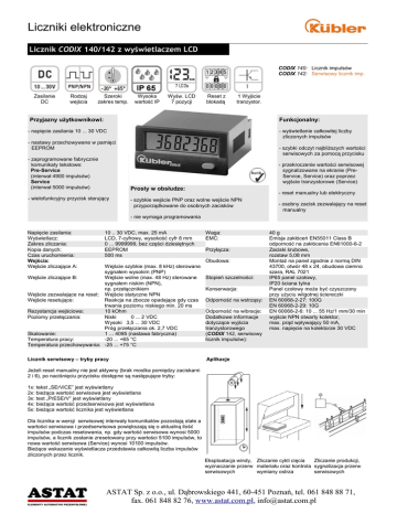 Liczniki elektroniczne Licznik CODIX 140/142 z wyświetlaczem LCD CODIX 140: Licznik impulsów CODIX 142: Serwisowy licznik imp. Zasilanie DC Rodzaj wejścia Szeroki zakres temp. Wysoka wartość IP Wyśw. LCD 7 pozycji Reset z blokadą 1 Wyjście tranzystor. Przyjazny użytkownikowi: Funkcjonalny: - napięcie zasilania 10 ... 30 VDC - wyświetlanie całkowitej liczby zliczonych impulsów - nastawy przechowywane w pamięci EEPROM - zaprogramowane fabrycznie komunikaty tekstowe: Pre-Service (interwał 4900 impulsów) Service (interwał 5000 impulsów) - szybki odczyt najbliższych wartości serwisowych za pomocą przycisku - przekroczenie wartości serwisowej sygnalizowane na ekranie (PreService, Service) oraz poprzez wyjście tranzystorowe (Service) Prosty w obsłudze: - wielofunkcyjny przycisk sterujący - reset manualny lub elektryczny - szybkie wejście PNP oraz wolne wejście NPN przyporządkowane do osobnych zacisków - osobny zacisk zezwalający na reset manualny - nie wymaga programowania Napięcie zasilania: Wyświetlacz: Zakres zliczania: Kopia danych: Czas uruchomienia: Wejścia: Wejście zliczające A: 10 .. 30 VDC, max. 25 mA LCD, 7-cyfrowy, wysokość cyfr 8 mm 0 ... 9999999, bez części dziesiętnych EEPROM 500 ms Waga: EMC: Przyłącza: Obudowa: Wejście szybkie (max. 8 kHz) sterowane sygnałem wysokim (PNP) Wejście zliczające B: Wejście wolne (max. 48 Hz) sterowane sygnałem niskim (NPN), np. przełącznikiem Wejście zezwalające na reset: Wejście statyczne NPN Wejście resetujące: Reakcja na zbocze opadające gdy czas trwania poziomu niskiego min. 20 ms Rezystancja wejściowa: 10 kOhm Poziomy przełączania: Niski 0 ... 2 VDC Wysoki 3,5 ... 30 VDC Próg przełączania ok. 2,7 VDC Skalowanie: 1 ... 4095 (nastawa fabryczna) Temperatura pracy: -20 ... +65 °C Temperatura przechowywania: -25 ... +75 °C Licznik serwisowy – tryby pracy Stopień szczelności: Konserwacja: Odporność na wstrząsy: Odporność na wibracje: Dodatkowe informacje dotyczące wyjścia tranzystorowego (CODIX 142, serwisowy licznik impulsów): 40 g Emisja zakłóceń EN55011 Class B odporność na zakłócenia EN61000-6-2 Zaciski śrubowe, rozstaw 5,08 mm Montaż na panel zgodnie z normą DIN 43700, otwór 48 x 24, obudowa ciemno szara, RAL 7021 IP65 panel czołowy, IP20 ściana tylna Panel czołowy może być czyszczony przy użyciu wilgotnej ściereczki EN 60068-2-27: 100G EN 60068-2-29: 10G EN 60068-2-6: 10 ... 55 Hz/1 mm/30 min wyjście NPN otwarty kolektor, max. prąd wpływający 50 mA, max. napięcie na kolektorze 30 VDC Aplikacje Jeżeli reset manualny nie jest aktywny (brak mostka pomiędzy zaciskami 2 i 6), po naciśnięciu przycisku dostępne są następujące tryby: 1x: tekst „SErViCE” jest wyświetlany 2x: bieżąca wartość serwisowa jest wyświetlana 3x: test „PrESErV” jest wyświetlany 4x: bieżąca wartość przedserwisowa jest wyświetlana 5x: bieżąca wartość licznika jest wyświetlana Dla licznika w wersji serwisowej interwały komunikatów pozostają stałe a wartości serwisowa i przedserwisowa powiększają się o aktualną ilość impulsów podczas resetowania, np. gdy wartość serwisowa wynosi 5000 impulsów, a licznik zostanie zresetowany przy wartości 5100 impulsów, to nowa wartość serwisowa (Service) wynosi 10100 impulsów. Bieżące wskazanie wyświetlacza przedstawia całkowitą liczba impulsów zliczonych przez licznik. Eksploatacja windy, Zliczanie cykli cięcia Zliczanie produkcji, wyznaczanie przerw materiału oraz kontrola sygnalizacja przerw wymiany ostrza serwisowych serwisowych ASTAT Sp. z o.o., ul. Dąbrowskiego 441, 60-451 Poznań, tel. 061 848 88 71, fax. 061 848 82 76, www.astat.com.pl, [email protected] Liczniki elektroniczne Licznik CODIX 140/142 z wyświetlaczem LCD Wymiary: Zawartość opakowania: - licznik - ramka dociskowa - adapter do montażu w otworze 50 x 25 mm - uszczelki - wielojęzyczna instrukcja użytkowania Schemat podłączenia: Pin Opis Licznik impulsów CODIX 140 Serwisowy licznik impulsów CODIX 142 Zasilanie 1 2 10 ... 30 VDC GND 10 ... 30V DC GND Wejścia 3 0 VDC, GND GND GND 4 INP PNP INP PNP INP NPN INP NPN 5 6 +Ub 0 VDC, GND Szybkie wejście zliczające Wolne wejście zliczające Zezwolenie na reset MANUAL RESET ENABLE Wejście resetujące RESET * zacisk 8 jest wykorzystywany tylko 7 w liczniku CODIX 142 (wyjście tranzystorowe NPN OC) Wyjście 8 Wyjście NPN n.d. Wyjście NPN, otwarty kolektor dla CODIX 142 MANUAL RESET ENABLE RESET OUT Kod zamówienia – Licznik impulsów: 6.140.012.300.0001 Opcja 1* Dzielnik 2 ... 4095 Jeżeli dzielnik ma wynosić 1 pomijamy ostatnie 4 cyfry Kod zamówienia – Serwisowy licznik impulsów: 6.142.011.300.005K.00.0001 Opcja 1* Dzielnik 2 ... 4095 Jeżeli dzielnik ma wynosić 1 pomijamy ostatnie 4 cyfry *Uwaga: przedstawiono przykładową konfigurację. Opcje 1 – 3 mogą zostać zaprogramowane wedle potrzeb klienta. Wykonanie z dzielnikiem innym niż 1 oraz interwałami wybranymi przez klienta dostępne przy zamówieniu min. 500 sztuk Opcja 2* 00 = Interwał 100 pomiędzy komunikatami PrESErV i SErViCE Opcja 3* Interwał serwisowy 005K => 5000 ASTAT Sp. z o.o., ul. Dąbrowskiego 441, 60-451 Poznań, tel. 061 848 88 71, fax. 061 848 82 76, www.astat.com.pl, [email protected]