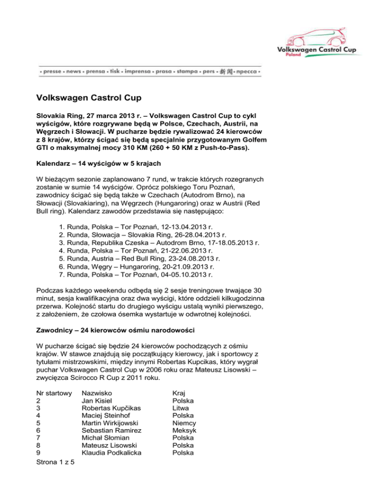 Volkswagen Castrol Cup Slovakia Ring, 27 marca 2013 r. – Volkswagen Castrol Cup to cykl wyścigów, które rozgrywane będą w Polsce, Czechach, Austrii, na Węgrzech i Słowacji. W pucharze będzie rywalizować 24 kierowców z 8 krajów, którzy ścigać się będą specjalnie przygotowanym Golfem GTI o maksymalnej mocy 310 KM (260 + 50 KM z Push-to-Pass). Kalendarz – 14 wyścigów w 5 krajach W bieżącym sezonie zaplanowano 7 rund, w trakcie których rozegranych zostanie w sumie 14 wyścigów. Oprócz polskiego Toru Poznań, zawodnicy ścigać się będą także w Czechach (Autodrom Brno), na Słowacji (Slovakiaring), na Węgrzech (Hungaroring) oraz w Austrii (Red Bull ring). Kalendarz zawodów przedstawia się następująco: 1. Runda, Polska – Tor Poznań, 12-13.04.2013 r. 2. Runda, Słowacja – Slovakia Ring, 26-28.04.2013 r. 3. Runda, Republika Czeska – Autodrom Brno, 17-18.05.2013 r. 4. Runda, Polska – Tor Poznań, 21-22.06.2013 r. 5. Runda, Austria – Red Bull Ring, 23-24.08.2013 r. 6. Runda, Węgry – Hungaroring, 20-21.09.2013 r. 7. Runda, Polska – Tor Poznań, 04-05.10.2013 r. Podczas każdego weekendu odbędą się 2 sesje treningowe trwające 30 minut, sesja kwalifikacyjna oraz dwa wyścigi, które oddzieli kilkugodzinna przerwa. Kolejność startu do drugiego wyścigu ustalą wyniki pierwszego, z założeniem, że czołowa ósemka wystartuje w odwrotnej kolejności. Zawodnicy – 24 kierowców ośmiu narodowości W pucharze ścigać się będzie 24 kierowców pochodzących z ośmiu krajów. W stawce znajdują się początkujący kierowcy, jak i sportowcy z tytułami mistrzowskimi, między innymi Robertas Kupcikas, który wygrał puchar Volkswagen Castrol Cup w 2006 roku oraz Mateusz Lisowski – zwycięzca Scirocco R Cup z 2011 roku. Nr startowy 2 3 4 5 6 7 8 9 Strona 1 z 5 Nazwisko Jan Kisiel Robertas Kupčikas Maciej Steinhof Martin Wirkijowski Sebastian Ramirez Michał Słomian Mateusz Lisowski Klaudia Podkalicka Kraj Polska Litwa Polska Niemcy Meksyk Polska Polska Polska 10 11 12 14 15 16 17 18 19 20 21 22 23 24 25 26 Maciej Dreszer Fernando Mendez Aleksandra Furgał Krystian Korzeniowski Strahinja Ivosevic Marcus Fluch Philipp Bartos Łukasz Tyszkiewicz Mateusz Tyszkiewicz Patrik Nemec Jakub Litwin Aleksandra Bursiak Herman Berger Adam Rzepecki Paweł Krężelok Rasmus Marthen Polska Meksyk Polska Polska Czechy Szwecja Austria Polska Polska Słowacja Polska Polska Austria Polska Polska Szwecja Paweł Krężelok rozpocznie starty od rundy na Red Bull Ring ponieważ dopiero wtedy będzie miał ukończone 16 lat. Dodatkową atrakcją podczas rywalizacji na torze będzie udział w wyścigach specjalnie zaproszonych kierowców tzw. VIP Drivers. Będą to osoby ze świata mediów, sportu i show businessu, jednakże z doświadczeniem w motorsporcie. Zainteresowanie startem w wyścigu Volkswagen Castrol Cup wykazali m.in. rajdowcy, żużlowcy oraz piłkarze. Adam Gładysz, który dziś odpowiada za organizację Volskwagen Castrol Cup, w minionych latach za kierownicą pucharowego Scirocco R, walczył na torze z gościnnie startującymi „legendami” motorsportu, m.in. Rajdowymi Mistrzami Świata: Carlosem Sainzem, Juha Kankkunenem czy też kierowcami Formuły 1: Johnym Herbertem i Damonem Hillem. Dziś Adam wspomina tą rywalizację z dużym sentymentem: „Doskonale pamiętam wyścig na Hockenheim w 2010 roku. Startowałem z 7 pozycji, walcząc o lepsze lokaty stoczyłem kilka pojedynków z Carlosem Sainzem, ostatecznie pokonałem wielokrotnego mistrza w bezpośredniej walce, minąłem linię mety przed nim kończąc wyścig na piątym miejscu. Są to wspaniałe wspomnienia.” Obecność sportowców, możliwość rywalizacji z nimi, przysparza młodym kierowcom wielu emocji. Nawet, jeżeli są to sportowcy z tytułami zdobytymi w innych dyscyplinach, ich obecność pozwala początkującym zawodnikom zdobyć wiele cennych doświadczeń, np. podczas rozmów z mediami. Testy i treningi Pucharowe Golfy GTI zostały zbudowane w siedzibie spółki Volkswagen Racing Polska przy dużym wsparciu inżynierów z Volkswagen Motorsport. Jeszcze w 2012 roku rozpoczęły się testy wyścigówki. Sprawdzano poszczególne elementy silnika i zawieszenia. W lutym tego roku, pucharowy Golf GTI poddany został testowi na wytrzymałość, dwa samochody na hiszpańskim torze w Calafat przejechały w sumie 3.000 kilometrów zużywając 30 kompletów opon. Podczas testu nie zanotowano żadnych usterek. W dniach 26 i 27 marca zawodnicy Volkswagen Castrol Cup po raz pierwszy mieli okazję zasiąść za kierownicą wyścigowych Golfów i Strona 2 z 5 pokonać kilkadziesiąt kilometrów na torze Slovakia Ring. Wcześniej kierowcy zostali przeszkoleni przez instruktorów z Volkswagen Motorsport. Ćwiczono procedurę startu i najbardziej efektywnego ruszania, wyjaśniono wszystkim jak należy czytać i wykorzystywać zapisy telemetrii, omówiono także zasady stosowania systemu Push-to-Pass. Jazda samochodem osiągającym moc 310 KM wzbudzała sporo emocji. Najważniejsze punkty regulaminu Nowością w polskich pucharach jest sposób zabezpieczenia i serwisowania samochodów. Przez cały sezon pozostaną one w gestii organizatora, to on będzie odpowiadał za ich przygotowanie do startów oraz dostarczenie na wyścigi. Kierowca na tor wyścigowy przyjedzie tylko z kaskiem i kombinezonem. Dozwolona będzie tylko i wyłącznie regulacja ustawień fotela i ciśnienia w oponach. Żadna ingerencja w samochody przygotowane przez organizatora nie będzie możliwa. Punkty za wyścig przyznawane będą dla pierwszej dwudziestki zawodników. Punktacja pierwszej rundy będzie o połowę mniejsza: miejsce 1 2 3 4 5 6 7 8 9 10 11 12 13 14 15 16 17 18 19 20 pierwsza runda 30 pkt 24 pkt 20 pkt 17 pkt 16 pkt 15 pkt 14 pkt 13 pkt 12 pkt 11 pkt 10 pkt 9 pkt 8 pkt 7 pkt 6 pkt 5 pkt 4 pkt 3 pkt 2 pkt 1 pkt pozostałe rundy 60 pkt 48 pkt 40 pkt 34 pkt 32 pkt 30 pkt 28 pkt 26 pkt 24 pkt 22 pkt 20 pkt 18 pkt 16