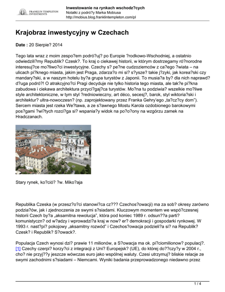 Inwestowanie na rynkach wschodz?cych Notatki z podró?y Marka Mobiusa http://mobius.blog.franklintempleton.com/pl Krajobraz inwestycyjny w Czechach Date : 20 Sierpie? 2014 Tego lata wraz z moim zespo?em podró?uj? po Europie ?rodkowo-Wschodniej, a ostatnio odwiedzili?my Republik? Czesk?. To kraj o ciekawej historii, w którym dostrzegamy ró?norodne interesuj?ce mo?liwo?ci inwestycyjne. Czechy s? pe?ne cudzoziemców z ca?ego ?wiata – na ulicach pi?knego miasta, jakim jest Praga, zdarza?o mi si? s?ysze? takie j?zyki, jak korea?ski czy mandary?ski, a w naszym hotelu by?a grupa turystów z Japonii. To musia?a by? dla nich naprawd? d?uga podró?! O atrakcyjno?ci Pragi decyduje nie tylko historia tego miasta, ale tak?e pi?kna zabudowa i ciekawa architektura przyci?gaj?ca turystów. Mo?na tu podziwia? wszelkie mo?liwe style architektoniczne, w tym styl ?redniowieczny, art déco, secesj?, barok, styl wiktoria?ski i architektur? ultra-nowoczesn? (np. zaprojektowany przez Franka Gehry’ego „ta?cz?cy dom”). Sercem miasta jest rzeka We?tawa, a ze s?awnego Mostu Karola ozdobionego barokowymi pos?gami ?wi?tych rozci?ga si? wspania?y widok na po?o?ony na wzgórzu zamek na Hradczanach. Stary rynek, ko?ció? ?w. Miko?aja Republika Czeska (w przesz?o?ci stanowi?ca cz??? Czechos?owacji) ma za sob? okresy zarówno podzia?ów, jak i zjednoczenia ze swymi s?siadami. Kluczowym momentem we wspó?czesnej historii Czech by?a „aksamitna rewolucja”, która pod koniec 1989 r. odsun??a parti? komunistyczn? od w?adzy i wprowadzi?a kraj w now? er? demokracji i gospodarki rynkowej. W 1993 r. nast?pi? pokojowy „aksamitny rozwód” i Czechos?owacja podzieli?a si? na Republik? Czesk? i Republik? S?owack?. Populacja Czech wynosi dzi? prawie 11 milionów, a S?owacja ma ok. pi?ciomilionow? populacj?. [1] Czechy czerpi? korzy?ci z integracji z Uni? Europejsk? (UE), do której do??czy?y w 2004 r., cho? nie przyj??y jeszcze wówczas euro jako wspólnej waluty. Czesi utrzymuj? bliskie relacje ze swymi zachodnimi s?siadami – Niemcami. Wyniki badania przeprowadzonego niedawno przez 1/4 Inwestowanie na rynkach wschodz?cych Notatki z podró?y Marka Mobiusa http://mobius.blog.franklintempleton.com/pl Czesko-Niemieck? Izb? Handlow? (?NOPK) pokazuj?, ?e Czechy ust?puj? tylko Polsce pod wzgl?dem atrakcyjno?ci dla niemieckich inwestorów w?ród 15 krajów Europy ?rodkowoWschodniej. [2] 88% niemieckich inwestorów deklaruje sk?onno?? do ponownego wyboru Czech jako miejsca na inwestycje. [3] Poznawszy te dane, oczywi?cie musia?em si? dowiedzie? dlaczego! Widok wzd?u? We?tawy Powi?zania z Niemcami bywaj? broni? obosieczn?, poniewa? ewentualne pogorszenie si? warunków ekonomicznych w Niemczech (jak mia?o to miejsce w 2009 r.) ma niekorzystny wp?yw na kondycj? czeskiej gospodarki. W ostatnim czasie, dobra koniunktura w Niemczech jest jednak czynnikiem korzystnym, a prognozy Mi?dzynarodowego Funduszu Walutowego dla Czech przewiduj? wzrost rz?du 1,9% w 2014 r. i 2,0% w 2015 r.[4] Krajobraz inwestycyjny w Czechach Nasza wizyta w Czechach oczywi?cie nie mia?a na celu wy??cznie podziwiania widoków – naszym g?ównym zamiarem by?a ocena mo?liwo?ci inwestycyjnych. Wraz z moim zespo?em odwiedzi?em jedno z najwi?kszych przedsi?biorstw w Europie. Spó?ka stawia obecnie czo?a wyzwaniom zwi?zanym z niskimi cenami energii w efekcie nadpoda?y w Niemczech i spadków cen w?gla, które ograniczaj? ceny energii elektrycznej w Europie ?rodkowej. ?rodkowoeuropejski rynek energii elektrycznej jest coraz bardziej zintegrowany, a elektryczno?? jest swobodnie przesy?ana pomi?dzy ró?nymi krajami, tworz?c zr?by wspólnego rynku energetycznego. Spotkali?my si? tak?e z przedstawicielami regionalnego organizatora zak?adów sportowych, prowadz?cego dzia?alno?? równie? w Polsce. Podobnie jak przedsi?biorstwo energetyczne, ta firma tak?e walczy o zrównowa?one zyski w warunkach ostrej konkurencji. Przedstawiciele spó?ki powiedzieli nam, ?e wraz z konkurentami staraj? si? sk?oni? polskie w?adze do ?cigania zagranicznych bukmacherów internetowych, którzy nie maj? licencji na tak? dzia?alno??, a w 2/4 Inwestowanie na rynkach wschodz?cych Notatki z podró?y Marka Mobiusa http://mobius.blog.franklintempleton.com/pl konsekwencji nie p?ac? podatków. Podatek od hazardu w Polsce nale?y do najwy?szych na ?wiecie – stawka podatku wynosi 12% od ka?dego zak?adu. To oczywi?cie stawia przedsi?biorstwa prowadz?ce legaln? dzia?alno?? w bardzo niekorzystnej sytuacji w stosunku do firm dzia?aj?cych bez licencji. Szacuje si?, ?e rynek zagranicznych podmiotów prowadz?cych dzia?alno?? bukmachersk? bez licencji w Polsce jest dziewi?ciokrotnie wi?kszy ni? rynek licencjonowanych bukmacherów. Potencjalne korzy?ci dla polskiego skarbu pa?stwa p?yn?ce z opodatkowania rynku zagranicznego s? zatem oczywiste. Pomimo tych problemów, przedstawiciele firmy, z którymi si? spotkali?my, mówili o znakomitej koniunkturze w czasie zimowych igrzysk olimpijskich w Rosji, wynikaj?cej z du?ej popularno?ci hokeja w Czechach. W tym roku hokej cieszy si? nawet wi?kszym zainteresowaniem ni? pi?ka no?na, poniewa? Czesi nie zakwalifikowali si? do mistrzostw ?wiata w Brazylii. Odwiedzili?my tak?e firm? produkuj?c? polipropylenowe w?ókna u?ywane do produkcji pieluch. Zapytani o ich sposób na utrzymanie konkurencyjno?ci w bran?y w du?ej mierze zale?nej od surowców, przedstawiciele spó?ki powiedzieli, ?e po?wi?caj? wiele czasu i pieni?dzy na innowacje oraz wspó?pracuj? ze swymi najwa?niejszymi odbiorcami prowadz?c prace nad nowymi typami w?ókien. Ogólnie rzecz bior?c, nasza wizyta w Czechach by?a udana. Zamierzamy nadal poszukiwa? mo?liwo?ci inwestycyjnych w tym kraju. Komentarze, opinie i analizy dr. Mobiusa s? przedstawione wy??cznie w celach informacyjnych i nie stanowi? indywidualnych porad inwestycyjnych ani zach?ty do zainwestowania w jakiekolwiek papiery warto?ciowe czy stosowania jakiejkolwiek strategii inwestycyjnej. Bior?c pod uwag? zmienno?? warunków rynkowych i ekonomicznych,