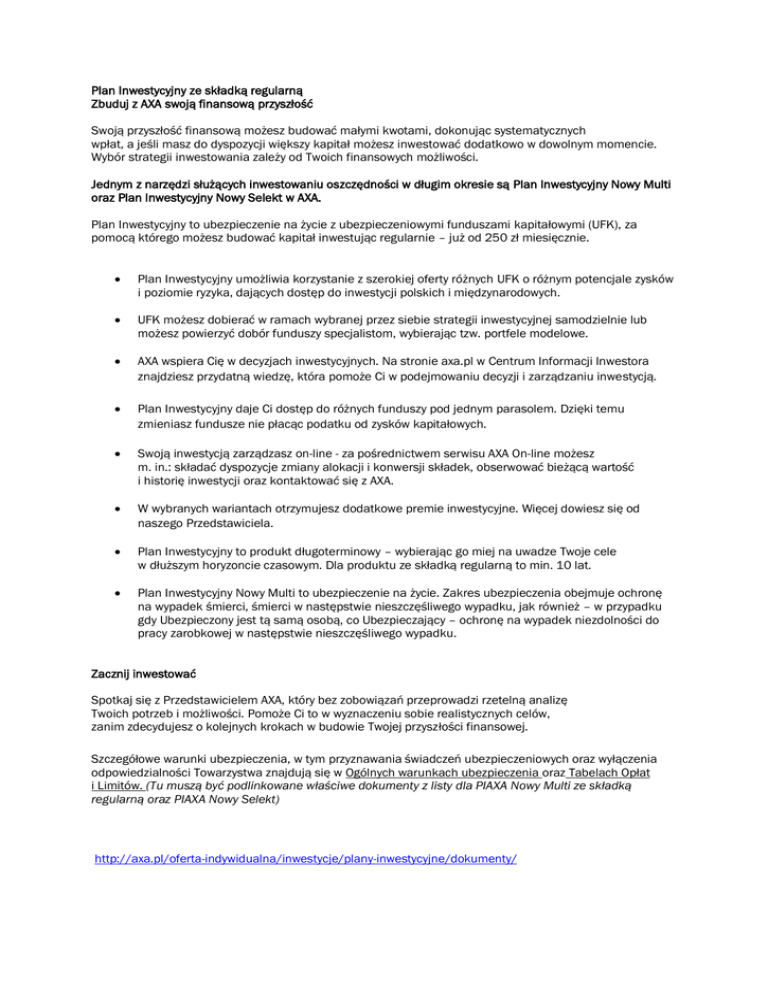Plan Inwestycyjny ze składką regularną Zbuduj z AXA swoją finansową przyszłość Swoją przyszłość finansową możesz budować małymi kwotami, dokonując systematycznych wpłat, a jeśli masz do dyspozycji większy kapitał możesz inwestować dodatkowo w dowolnym momencie. Wybór strategii inwestowania zależy od Twoich finansowych możliwości. Jednym z narzędzi służących inwestowaniu oszczędności w długim okresie są Plan Inwestycyjny Nowy Multi oraz Plan Inwestycyjny Nowy Selekt w AXA. Plan Inwestycyjny to ubezpieczenie na życie z ubezpieczeniowymi funduszami kapitałowymi (UFK), za pomocą którego możesz budować kapitał inwestując regularnie – już od 250 zł miesięcznie. Plan Inwestycyjny umożliwia korzystanie z szerokiej oferty różnych UFK o różnym potencjale zysków i poziomie ryzyka, dających dostęp do inwestycji polskich i międzynarodowych. UFK możesz dobierać w ramach wybranej przez siebie strategii inwestycyjnej samodzielnie lub możesz powierzyć dobór funduszy specjalistom, wybierając tzw. portfele modelowe. AXA wspiera Cię w decyzjach inwestycyjnych. Na stronie axa.pl w Centrum Informacji Inwestora znajdziesz przydatną wiedzę, która pomoże Ci w podejmowaniu decyzji i zarządzaniu inwestycją. Plan Inwestycyjny daje Ci dostęp do różnych funduszy pod jednym parasolem. Dzięki temu zmieniasz fundusze nie płacąc podatku od zysków kapitałowych. Swoją inwestycją zarządzasz on-line - za pośrednictwem serwisu AXA On-line możesz m. in.: składać dyspozycje zmiany alokacji i konwersji składek, obserwować bieżącą wartość i historię inwestycji oraz kontaktować się z AXA. W wybranych wariantach otrzymujesz dodatkowe premie inwestycyjne. Więcej dowiesz się od naszego Przedstawiciela. Plan Inwestycyjny to produkt długoterminowy – wybierając go miej na uwadze Twoje cele w dłuższym horyzoncie czasowym. Dla produktu ze składką regularną to min. 10 lat. Plan Inwestycyjny Nowy Multi to ubezpieczenie na życie. Zakres ubezpieczenia obejmuje ochronę na wypadek śmierci, śmierci w następstwie nieszczęśliwego wypadku, jak również – w przypadku gdy Ubezpieczony jest tą samą osobą, co Ubezpieczający – ochronę na wypadek niezdolności do pracy zarobkowej w następstwie nieszczęśliwego wypadku. Zacznij inwestować Spotkaj się z Przedstawicielem AXA, który bez zobowiązań przeprowadzi rzetelną analizę Twoich potrzeb i możliwości. Pomoże Ci to w wyznaczeniu sobie realistycznych celów, zanim zdecydujesz o kolejnych krokach w budowie Twojej przyszłości finansowej. Szczegółowe warunki ubezpieczenia, w tym przyznawania świadczeń ubezpieczeniowych oraz wyłączenia odpowiedzialności Towarzystwa znajdują się w Ogólnych warunkach ubezpieczenia oraz Tabelach Opłat i Limitów. (Tu muszą być podlinkowane właściwe dokumenty z listy dla PIAXA Nowy Multi ze składką regularną oraz PIAXA Nowy Selekt) http://axa.pl/oferta-indywidualna/inwestycje/plany-inwestycyjne/dokumenty/