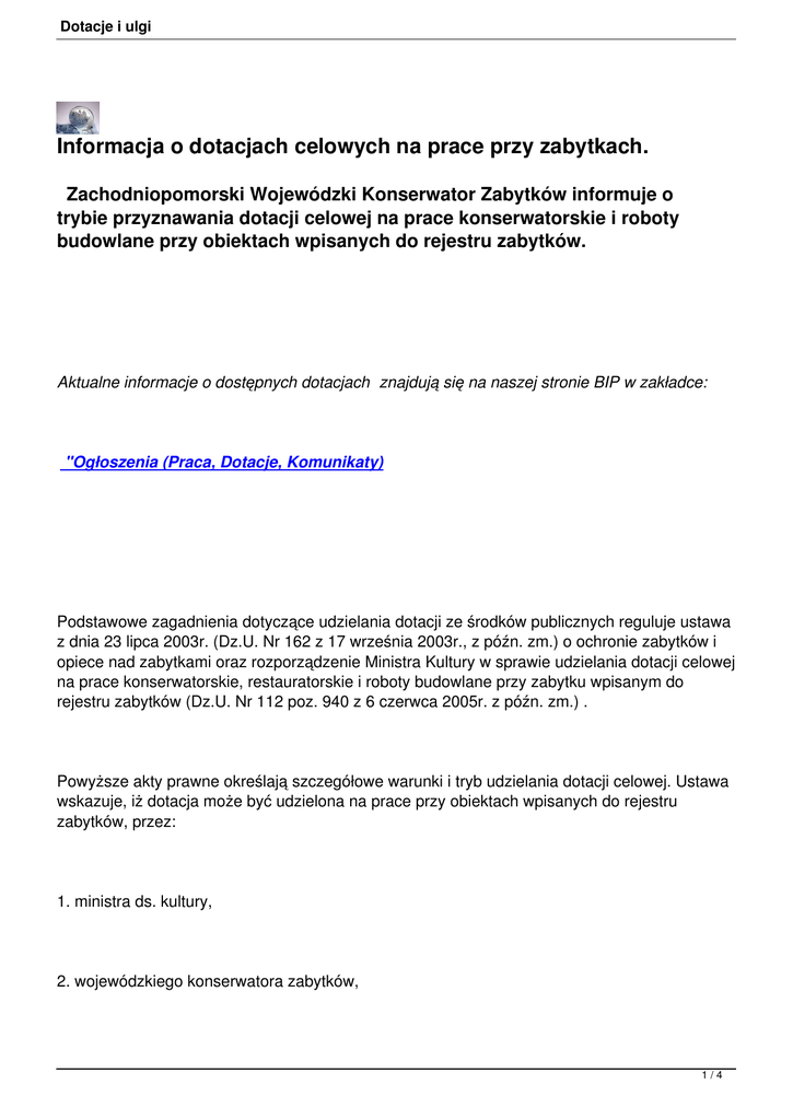 Dotacje i ulgi Informacja o dotacjach celowych na prace przy zabytkach. Zachodniopomorski Wojewódzki Konserwator Zabytków informuje o trybie przyznawania dotacji celowej na prace konserwatorskie i roboty budowlane przy obiektach wpisanych do rejestru zabytków. Aktualne informacje o dostępnych dotacjach znajdują się na naszej stronie BIP w zakładce: "Ogłoszenia (Praca, Dotacje, Komunikaty) Podstawowe zagadnienia dotyczące udzielania dotacji ze środków publicznych reguluje ustawa z dnia 23 lipca 2003r. (Dz.U. Nr 162 z 17 września 2003r., z późn. zm.) o ochronie zabytków i opiece nad zabytkami oraz rozporządzenie Ministra Kultury w sprawie udzielania dotacji celowej na prace konserwatorskie, restauratorskie i roboty budowlane przy zabytku wpisanym do rejestru zabytków (Dz.U. Nr 112 poz. 940 z 6 czerwca 2005r. z późn. zm.) . Powyższe akty prawne określają szczegółowe warunki i tryb udzielania dotacji celowej. Ustawa wskazuje, iż dotacja może być udzielona na prace przy obiektach wpisanych do rejestru zabytków, przez: 1. ministra ds. kultury, 2. wojewódzkiego konserwatora zabytków, 1/4 Dotacje i ulgi 3. organ stanowiący województwa, powiatu lub gminy. Dla każdego obiektu położonego na terenie województwa zachodniopomorskiego, wpisanego do rejestru zabytków, możliwe jest udzielenie dotacji na prace remontowe i konserwatorskie, przez Zachodniopomorskiego Wojewódzkiego Konserwatora Zabytków, Ministra Kultury i Dziedzictwa Narodowego, Sejmik Województwa Zachodniopomorskiego oraz odpowiednią Radę Powiatu i Radę Gminy. Dotacje udzielane przez Ministra Kultury i Dziedzictwa Narodowego oraz Zachodniopomorskieg o Wojewódzkiego Konserwatora Zabytków i MKIDN pochodzą z budżetu państwa, zaś organy jednostek samorządu terytorialnego wydzielają środki finansowe z własnych budżetów. Zakres prac uprawniający do ubiegania się o dotację szczegółowo określony jest w ustawie (art. 77 pkt. 1-17). Przepisy precyzują, iż dotacja dotyczy prac dokumentacyjnych i badawczych, prac przy zabytkowej substancji budowlanej i obiekcie zabytkowym, w tym odtworzenia jego części składowych, nie dotyczy zaś prac adaptacyjnych czy modernizacyjnych. Dotacja tego rodzaju może dotyczyć zabytków nieruchomych (budynków i budowli), zabytków ruchomych, zieleni zabytkowej (parki, cmentarze) ? z wyłączeniem zabytków archeologicznych. Dotacje mogą być udzielane na prace planowane do wykonania lub jako refundacje poniesionych wcześniej nakładów. Szczegółowe zasady udzielania dotacji określają poszczególne organy w przyjętych uchwałach lub regulaminach. Warunkiem koniecznym uzyskania dotacji jest zawsze złożenie przez właściciela lub użytkownika zabytku formalnego wniosku w sprawie, zgodnego z wymaganiami organu udzielającego dotacji. Konieczne jest dołączenie stosownych dokumentów (np. pozwolenia na budowę, pozwolenia WKZ na prowadzenie prac, kosztorysów prac z przedmiarem robót. Przy refundacjach części poniesionych nakładów ? m.in. pozwolenia na budowę, pozwolenia WKZ na przeprowadzone prace, protokołu odbioru prac przez WKZ, kosztorysów powykonawczych z obmiarem robót,). Wnioski do Zachodniopomorskiego Wojewódzkiego Konserwatora Zabytków na prace planowane należy składać do 28 lutego roku, w którym ma być udzielona dotacja. Wielkość udzielanych dotacji zależy od ilości zgłoszonych wniosków i wartości środków przyznanych 2/4 Dotacje i ulgi WKZ na ten cel, zwykle nie przekracza 50 % wartości całości prac (wykaz udzielonych dotacji w ubiegłych latach dostępny na stronie internetowej Urzędu). Wnioski o refundację poniesionych nakładów na prace wykonane w ciągu trzech ubiegłych lat można składać do 30 czerwca każdego roku - po zakończeniu wszystkich prac wymienionych w zezwoleniu WKZ. Szczegółowe zasady określone są w Procedurach ZWKZ. Większymi środkami finansowymi dysponuje Minister Kultury i Dziedzictwa Narodowego, udzielający dotacji w ramach własnych Programów, zwłaszcza Programu Dziedzictwo Kulturowe, priorytet Ochrona zabytków. Aktualnie obowiązujące terminy przyjmowania wniosków to 30 października i (w miarę posiadania środków finansowych ) 31 marca. Wnioski składa się w formie elektronicznej, za pomocą platformy Elektronicznego Biura Obsługi Interesanta. Szczegółowe informacje i dostęp do EBOI dostępne są na stronach internetowych Ministerstwa: www.mkidn.gov.pl Podstawa prawna: - USTAWA Z DNIA 23 LIPCA 2003 r. o ochronie zabytków i opiece nad zabytkami (Dz.U.Nr 162 z 17 września 2003r. z późn. zm.) - ROZPORZĄDZENIE MINISTRA KULTURY Z DNIA 6 CZERWCA 2005 r. w sprawie udzielania dotacji celowej na prace konserwatorskie, restauratorskie i roboty budowlane przy zabytku wpisanym do rejestru zabytków (Dz. U. Nr 112 poz. 940 z poźn. zm.) - ROZPORZĄDZENIE MINISTRA KULTURY Z DNIA 28 STYCZNIA 2005 r. w sprawie szczegółowych warunków uzyskiwania dofinansowania realizacji zadań z zakresu kultury, trybu składania wniosków oraz przekazywania środków z Funduszu Promocji Kultury (Dz. U. z 10 lutego 2005 r. Nr 24 poz. 200 z późn. zm.). 3/4 Dotacje i ulgi więcej: http://www.wkz.bip.alfatv.pl/strony/menu/12.dhtml opracowała: Aleksandra Hamberg Federowicz 4/4