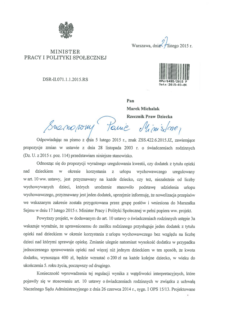I Warszawa, dnitego 2015 r. MINISTER PRACY I POLITYKI SPOŁECZNEJ - RPLJ/6495/2@15 F Data 215—— Pan Marek Michalak Rzecznik Praw Dziecka Odpowiadając na pismo z cJ”nia 5 lutego 2015 r., znak ZSS.422.6.2015.JZ, zawierające propozycje zmian w ustawie z dnia 28 listopada 2003 r. o świadczeniach rodzinnych (Dz. U. z 2015 r. poz. 114) przedstawiam niniejsze stanowisko. Odnosząc się do propozycji wyraźnego uregulowania kwestii, czy dodatek z tytułu opieki nad dzieckiem w okresie korzystania z urlopu wychowawczego uregulowany wart. 10 ww. ustawy, jest przyznawany na każde dziecko, czy też, niezależnie od liczby wychowywanych dzieci, których urodzenie stanowiło podstawę udzielenia urlopu wychowawczego, przyznawany jest jeden dodatek, uprzejmie informuję, że nowelizacja przepisów we wskazanym zakresie została przygotowana przez grupę posłów i wniesiona do Marszałka Sejmu w dniu 17 lutego 2015 r. Minister Pracy i Polityki Społecznej w pełni popiera ww. projekt. Powyższy projekt, w dodawanym do art. 10 ustawy o świadczeniach rodzinnych ustępie 3a wskazuje wyraźnie, że uprawnionemu do zasiłku rodzinnego przysługuje jeden dodatek z tytułu opieki nad dzieckiem w okresie korzystania z urlopu wychowawczego bez względu na liczbę dzieci nad którymi sprawuje opiekę. Zmianie ulegnie natomiast wysokość dodatku w przypadku jednoczesnego sprawowania opieki nad więcej niż jednym dzieckiem w ten sposób, że kwota dodatku, wynosząca 400 zł, będzie wzrastać o 200 zł na każde kolejne dziecko, w wieku do ukończenia 5. roku życia, począwszy od drugiego. Konieczność wprowadzenia tej regulacji wynika z wątpliwości interpretacyjnych, które pojawiły się w stosowaniu art. 10 ustawy o świadczeniach rodzinnych w związku z uchwałą Naczelnego Sądu Administracyjnego z dnia 26 czerwca 2014 r., sygn. I OPS 15/13. Projektowane rozwiązanie pozwała ujednolicić stosowanie ww. przepisów przez organy realizujące ustawę o świadczeniach rodzinnych. Jednocześnie projekt ten uwzględnia potrzebę zwiększonego wsparcia rodziców ponoszących większe wydatki w związku z wychowaniem więcej niż jednego dziecka poprzez wysokości omawianego dodatku od liczby dzieci nad którymi sprawowana jest opieka w okresie korzystania z urlopu wychowawczego. uzależnienie Odnosząc się do proponowanej zmiany art. 11 a ustawy o świadczeniach rodzinnych poprzez zniesienie maksyn-iatnych wymiarów dodatku z tytułu samotnego wychowywania dziecka, wyjaśniam, że w opinii Ministra Pracy i Polityki Społecznej postulat nie znajduje dostatecznego uzasadnienia w świetle całokształtu udzielanego przez Państwo wsparcia dla rodzin wielodzietnych oraz niepełnych. Oceny poziomu wsparcia rodzin wielodzietnych i niepełnych, w tym wychowujących dzieci niepełnosprawne, nie należy dokonywać w oderwaniu od innych form wsparcia dostępnych w danej sytuacji faktycznej na podstawie innych przepisów prawa, w szczególności ustawy o świadczeniach rodzinnych. Zgodnie z poglądem wyrażonym przez Trybunał Konstytucyjny w orzeczeniu z dnia 25 lutego 1997 r., sygn. akt K 21/95, porównywanie sytuacji socjalnej różnych kategorii osób nie może ograniczać się do jednego tylko elementu, rozpatrywanego w izolacji od pozostałych, lecz musi brać pod uwagę całokształt uprawnień i sytuacji faktycznej tych podmiotów. Selektywność pewnych uprawnień w ramach polityki socjalnej może bowiem służyć wyrównywaniu sytuacji faktycznej pewnej grupy obywateli w stosunku do innych. Tak zastosowana selektywność może więc być niekiedy metodą realizacji konstytucyjnej zasady równości. Istotnym jest, że świadczenia rodzinne są pozaubezpieczeniowymi świadczeniami socjalnymi finansowanymi w całości z budżetu państwa, co wiąże się z koniecznością równoważenia potrzeb socjalnych z dyscypliną budżetową. Ustawa o świadczeniach rodzinnych, przewiduje wiele rodzajów powiązanych ze sobą świadczeń rodzinnych, w szczególności zasiłek rodzinny wraz z dodatkami. Pozwała to na sprawiedliwe społecznie, zgodne z konstytucyjnymi zasadami, rozdysponowanie środków publicznych na wsparcie rodzin znajdujących się w różnych sytuacjach. Dla przykładu, dodatkowym świadczeniem przysługuj ącym rodzinom wielodzietnym, uzupełniającym wsparcie dostępne w przedstawionych powyżej okolicznościach jest, uregulowany w art. 1 2a ustawy o świadczeniach rodzinnych dodatek z tytułu wychowywania dziecka w rodzinie wielodzietnej. Zgodnie z art. 12a ust. 2 przysługuje on w wysokości 50,00 zł miesięcznie na trzecie i na następne dzieci uprawnione do zasiłku rodzinnego. Funkcję wspierania rodzin z dziećmi 2 niepełnosprawnymi pełni m.in. dodatek z tytułu kształcenia i rehabilitacji dziecka niepełnosprawnego określony w art. 13. Minister Pracy i Polityki Społecznej dostrzega niewątpliwe potrzeby rodzin wielodzietnych i podejmuje inicjatywy mające na celu dalsze, zwiększenie udzielanego im wsparcia, chociażby poprzez opracowaną ustawę z dnia 5 grudnia 2014 r. o Karcie Dużej Rodziny (Dz. U. poz. 1863). Niemniej jednak socjalny charakter świadczeń rodzinnych, kierowanych z ograniczonych środków budżetu państwa uniemożliwia aktualnie zmiany zasad przyznawania dodatku z tytułu wychowywania dziecka w rodzinie wielodzietnej. Mając na uwadze powyższe, Minister Pracy i Polityki Społecznej nie prowadzi prac nad zmianami zasad przyznawania dodatku do zasiłku rodzinnego z tytułu samotnego wychowywania dziecka. Przypomnieć należy, że Trybunał Konstytucyjny potwierdził już zgodność z Konstytucją dotychczasowych rozwiązań we wskazanym wyżej zakresie. W wyroku z dnia 20 grudnia 2012 r. Trybunał Konstytucyjny orzekł, że art. 1 la ust. 3 oraz 1 la ust. 4 ustawy o świadczeniach rodzinnych w części jakiej ograniczają wysokość dodatku z tytułu samotnego wychowywania dziecka oraz jego zwiększenia są zgodne z art. 32 ust. I w związku z art. 71 ust.