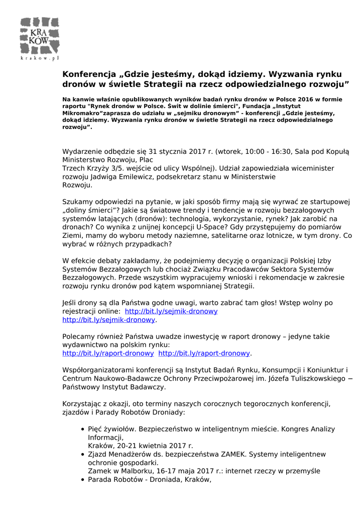 Konferencja „Gdzie jesteśmy, dokąd idziemy. Wyzwania rynku dronów w świetle Strategii na rzecz odpowiedzialnego rozwoju” Na kanwie właśnie opublikowanych wyników badań rynku dronów w Polsce 2016 w formie raportu "Rynek dronów w Polsce. Świt w dolinie śmierci", Fundacja „Instytut Mikromakro”zaprasza do udziału w „sejmiku dronowym” - konferencji „Gdzie jesteśmy, dokąd idziemy. Wyzwania rynku dronów w świetle Strategii na rzecz odpowiedzialnego rozwoju”. Wydarzenie odbędzie się 31 stycznia 2017 r. (wtorek, 10:00 - 16:30, Sala pod Kopułą Ministerstwo Rozwoju, Plac Trzech Krzyży 3/5. wejście od ulicy Wspólnej). Udział zapowiedziała wiceminister rozwoju Jadwiga Emilewicz, podsekretarz stanu w Ministerstwie Rozwoju. Szukamy odpowiedzi na pytanie, w jaki sposób firmy mają się wyrwać ze startupowej „doliny śmierci”? Jakie są światowe trendy i tendencje w rozwoju bezzałogowych systemów latających (dronów): technologia, wykorzystanie, rynek? Jak zarobić na dronach? Co wynika z unijnej koncepcji U-Space? Gdy przystępujemy do pomiarów Ziemi, mamy do wyboru metody naziemne, satelitarne oraz lotnicze, w tym drony. Co wybrać w różnych przypadkach? W efekcie debaty zakładamy, że podejmiemy decyzję o organizacji Polskiej Izby Systemów Bezzałogowych lub chociaż Związku Pracodawców Sektora Systemów Bezzałogowych. Przede wszystkim wypracujemy wnioski i rekomendacje w zakresie rozwoju rynku dronów pod kątem wspomnianej Strategii. Jeśli drony są dla Państwa godne uwagi, warto zabrać tam głos! Wstęp wolny po rejestracji online: http://bit.ly/sejmik-dronowy http://bit.ly/sejmik-dronowy. Polecamy również Państwa uwadze inwestycję w raport dronowy – jedyne takie wydawnictwo na polskim rynku: http://bit.ly/raport-dronowy http://bit.ly/raport-dronowy. Współorganizatorami konferencji są Instytut Badań Rynku, Konsumpcji i Koniunktur i Centrum Naukowo-Badawcze Ochrony Przeciwpożarowej im. Józefa Tuliszkowskiego − Państwowy Instytut Badawczy. Korzystając z okazji, oto terminy naszych corocznych tegorocznych konferencji, zjazdów i Parady Robotów Droniady: Pięć żywiołów. Bezpieczeństwo w inteligentnym mieście. Kongres Analizy Informacji, Kraków, 20-21 kwietnia 2017 r. Zjazd Menadżerów ds. bezpieczeństwa ZAMEK. Systemy inteligentnew ochronie gospodarki. Zamek w Malborku, 16-17 maja 2017 r.: internet rzeczy w przemyśle Parada Robotów - Droniada, Kraków, 16-18 czerwca 2017 r.: drony + bikony + warsztaty reagowania kryzysowego Rejestrację na te konferencje rozpoczniemy 30 stycznia 2017 r. Prezentację poszczególnych konferencji znajdą Państwo na stronie 5zywiolow.pl lub bezpośrednio tu: bit.ly/Mikromakro2017 <http://bit.ly/Mikromakro2017> . Źródło: Fundacja „Instytut Mikromakro” Powered by TCPDF (www.tcpdf.org)