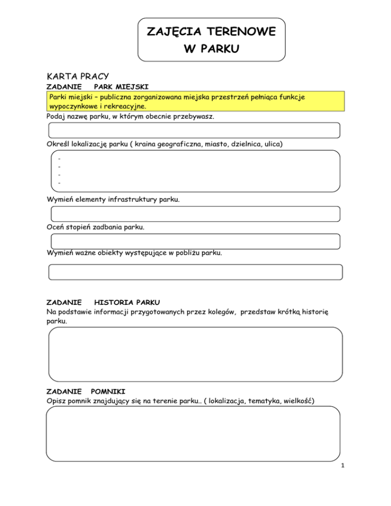 ZAJĘCIA TERENOWE W PARKU KARTA PRACY ZADANIE PARK MIEJSKI Parki miejski – publiczna zorganizowana miejska przestrzeń pełniąca funkcje wypoczynkowe i rekreacyjne. Podaj nazwę parku, w którym obecnie przebywasz. Określ lokalizację parku ( kraina geograficzna, miasto, dzielnica, ulica) Wymień elementy infrastruktury parku. Oceń stopień zadbania parku. Wymień ważne obiekty występujące w pobliżu parku. ZADANIE HISTORIA PARKU Na podstawie informacji przygotowanych przez kolegów, przedstaw krótką historię parku. ZADANIE POMNIKI Opisz pomnik znajdujący się na terenie parku.. ( lokalizacja, tematyka, wielkość) 1 ZADANIE ZAGĘSZCZENIE DRZEW Zagęszczenie – liczba osobników przypadająca na określoną jednostkę powierzchni (m2,ha). Powierzchnia parku, w którym przebywasz wynosi obecnie 1,8ha. Podaj liczbę drzew rosnących na terenie parku. Liczba drzew = Oblicz zagęszczenie drzew na terenie parku. Zagęszczenie drzew = Zadanie GATUNKI DRZEW Gatunek – podstawowa jednostka klasyfikacji organizmów. Nazwa gatunkowa składa się z dwóch podstawowych elementów: - nawy rodzaju np. Salix (wierzba) - epitetu gatunkowego np. alba (biała) Wybierz trzy drzewa, które podobają się Tobie najbardziej i oznacz je posługując się kluczem do oznaczania drzew. („mały” klucz TABLICA nr1) oraz podaj ich nazwę gatunkową (w języku polskim) Zadanie DRZEWOSTAN Drzewostan – zespół drzew występujący na danym terenie. Podaj liczbę drzew wybranego gatunku np. klonu pospolitego Liczba drzew = Oblicz i podaj procentowy udział wybranego przez Ciebie gatunku drzewa w drzewostanie parku. procentowy udział …………………… ……………………….w drzewostanie parku = ZADANIE WIEK DRZEWA Wiek drzewa najdokładniej można określić licząc liczbę pierścieni przyrostów rocznych w ściętym drzewie. Można też oszacować wiek drzewa mierząc jego obwód na wysokości ramion. Zmierz obwód wybranego drzewa ( np. największego) za pomocą taśmy mierniczej i odczytaj jego wiek w podanej w tabeli ( Tablica nr 2) 2 Zadanie BARWY ŚWIATA Światło słoneczne, czyli białe jest mieszaniną różnych kolorów zwanych widmem. Widmo to zespół kolorów występujących w określonej kolejności . Barwy widma widać np. w tęczy. Wyjaśnij jaki jest udział światła w widzeniu przez nas kolorów różnych obiektów. np. dlaczego pierś rudzika jest ceglasta. Zadanie BARWY ROŚLIN Barwniki w komórkach roślinnych występują w chloroplastach, chromoplastach i wodniczkach. Wymień barwniki występujące w komórce roślinnej. chloroplasty – chromoplasty wodniczki ZADANIE BARWY LIŚCI Liście mogą mieć różne barwy, które się zmieniają : zielony, żółty, bordowy… Barwa liści zależ od czynników środowiska zewnętrznego oraz zmian zachodzących w komórkach liści. Wskaż czynnik zewnętrzny i wewnętrzny wpływający na zmiany barwy liści. Wymień barwy liści drzew rosnącym w twoim parku. ZADANIE PROMIENIOWANIE Słońce emituje światło, które nazywamy widzialnym. Słońce emituje dwa inne rodzaje promieniowania, którego nie możemy zobaczyć : ultrafiolet i podczerwień. Podaj w jaki sposób odczuwamy obecność promieniowania podczerwonego Wyjaśnij jak promieniowanie ultrafioletowe wpływa na kolor naszej skóry. 3 ZADANIE CHEMIA ROŚLIN Garbniki – grupa związków organicznych o dużej masie cząsteczkowej, występujących naturalnie w niektórych roślinach np. w liściach herbaty i jeżyny, nasionach kakao, kłączu wężownika. Wskaż gatunek drzewa, w którego korze występują garbniki. Określ jaki smak mają garbniki. Podaj znaczenie garbników dla roślin. Wymień 2 przykłady wykorzystania garbników przez człowieka ZADANIE PARK W MIEŚCIE Przedstaw znaczenie parków dla mieszkańców miasta. ZADANIE MÓJ PARK Podaj co najbardziej podoba się Tobie w parku, w którym obecnie przebywasz. Wymień nazwę parku, w którym najczęściej bywasz oraz uzasadnij dlaczego. Podaj liczbę parków miejskich w Poznaniu. ZADANIE NATURA W SZTUCE. Elementy przyrody często są inspiracją dla twórców. Wymień przykłady dziedzin sztuki, w której można znaleźć motyw DRZEWA. Zadanie domowe; na następne zajęcia przygotuj przykłady potwierdzające twoje przykłady. 4