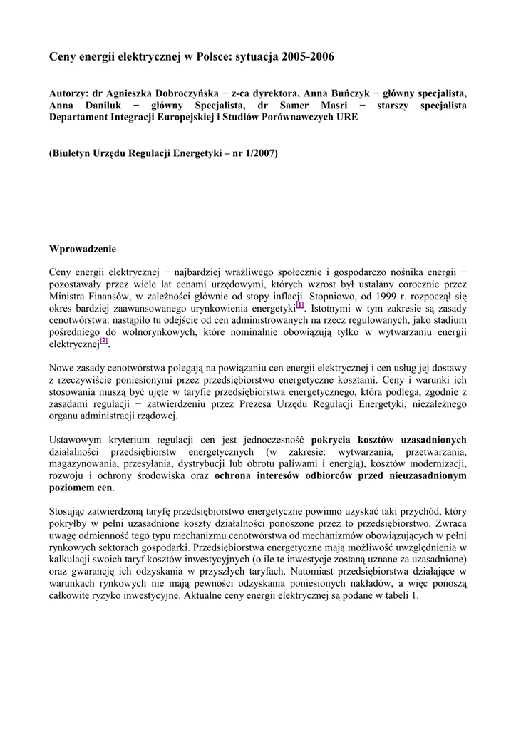 Ceny energii elektrycznej w Polsce: sytuacja 2005-2006 Autorzy: dr Agnieszka Dobroczyńska − z-ca dyrektora, Anna Buńczyk − główny specjalista, Anna Daniluk − główny Specjalista, dr Samer Masri − starszy specjalista Departament Integracji Europejskiej i Studiów Porównawczych URE (Biuletyn Urzędu Regulacji Energetyki – nr 1/2007) Wprowadzenie Ceny energii elektrycznej − najbardziej wraŜliwego społecznie i gospodarczo nośnika energii − pozostawały przez wiele lat cenami urzędowymi, których wzrost był ustalany corocznie przez Ministra Finansów, w zaleŜności głównie od stopy inflacji. Stopniowo, od 1999 r. rozpoczął się okres bardziej zaawansowanego urynkowienia energetyki[1]. Istotnymi w tym zakresie są zasady cenotwórstwa: nastąpiło tu odejście od cen administrowanych na rzecz regulowanych, jako stadium pośredniego do wolnorynkowych, które nominalnie obowiązują tylko w wytwarzaniu energii elektrycznej[2]. Nowe zasady cenotwórstwa polegają na powiązaniu cen energii elektrycznej i cen usług jej dostawy z rzeczywiście poniesionymi przez przedsiębiorstwo energetyczne kosztami. Ceny i warunki ich stosowania muszą być ujęte w taryfie przedsiębiorstwa energetycznego, która podlega, zgodnie z zasadami regulacji − zatwierdzeniu przez Prezesa Urzędu Regulacji Energetyki, niezaleŜnego organu administracji rządowej. Ustawowym kryterium regulacji cen jest jednoczesność pokrycia kosztów uzasadnionych działalności przedsiębiorstw energetycznych (w zakresie: wytwarzania, przetwarzania, magazynowania, przesyłania, dystrybucji lub obrotu paliwami i energią), kosztów modernizacji, rozwoju i ochrony środowiska oraz ochrona interesów odbiorców przed nieuzasadnionym poziomem cen. Stosując zatwierdzoną taryfę przedsiębiorstwo energetyczne powinno uzyskać taki przychód, który pokryłby w pełni uzasadnione koszty działalności ponoszone przez to przedsiębiorstwo. Zwraca uwagę odmienność tego typu mechanizmu cenotwórstwa od mechanizmów obowiązujących w pełni rynkowych sektorach gospodarki. Przedsiębiorstwa energetyczne mają moŜliwość uwzględnienia w kalkulacji swoich taryf kosztów inwestycyjnych (o ile te inwestycje zostaną uznane za uzasadnione) oraz gwarancję ich odzyskania w przyszłych taryfach. Natomiast przedsiębiorstwa działające w warunkach rynkowych nie mają pewności odzyskania poniesionych nakładów, a więc ponoszą całkowite ryzyko inwestycyjne. Aktualne ceny energii elektrycznej są podane w tabeli 1. Tabela 1. Ceny sprzedaŜy energii elektrycznej dla odbiorców końcowych Źródło: URE na podstawie: Sytuacja w elektroenergetyce I i II kwartał 2006 i 2005, ARE SA Zmiany zasad cenotwórstwa z administracyjnych na regulacyjne, spowodowało, Ŝe ceny energii elektrycznej zaczęły szybko rosnąć, potem dynamika była coraz wolniejsza, ale praktycznie cały czas w ponad inflacyjnym tempie (Consumption Price Index − CPI). Graficzne ujęcie tych tendencji dobitnie ilustruje rysunek 1. Największy wzrost cen energii elektrycznej w stosunku do inflacji odnotowano w 2001 r. W tym roku ceny energii elektrycznej wzrosły aŜ o 14,1%, podczas gdy inflacja wyniosła 5,5%. Wynikało to z metody kształtowania i kalkulacji taryf w obrocie energią elektryczną w tym okresie, która bazowała na średniorocznym wskaźniku cen towarów i usług konsumpcyjnych w roku kalendarzowym poprzedzającym rok obowiązywania taryfy (wskaźnik ten w 2000 r. wyniósł 110,1) oraz opodatkowania części obiektów uŜytkowanych przez przedsiębiorstwa energetyczne. Natomiast odchylenie od tego układu w 2004 r. było spowodowane tym, Ŝe nastąpiła zmiana okresu taryfowania z 1 lipca na 1 stycznia. W okresie styczeń-lipiec 2006 r. w porównaniu z analogicznym okresem ub. roku wzrost CPI wyniósł 0,7%. Jeszcze wyŜszy był w przypadku PPI i wyniósł 1,8%, a w przypadku energii elektrycznej wzrost ceny wyniósł 4,2% i był sześciokrotnie wyŜszy od CPI. Rysunek 1. Dynamika cen: energii elektrycznej, produkcji sprzedanej przemysłu (PPI) oraz towarów i usług konsumpcyjnych (CPI) [analogiczny okres poprzedniego roku = 100] Źródło: URE na podstawie biuletynów statystycznych GUS Poczynione wyŜej obserwacje moŜna takŜe odnieść do innych podstawowych nośników energii. Przedstawione na rysunku 2 relacje wzrostu ich cen wobec CPI pokazują, Ŝe od 2001 r. ich tempo było na ogół wyŜsze. Rysunek 2. Dynamika cen wybranych nośników energii oraz CPI [analogiczny okres poprzedniego roku = 100] Źródło: URE na podstawie biuletynów statystycznych GUS Zmniejszająca się amplituda wahań ceny energii elektrycznej i wskaźników PPI a takŜe powolnie następująca zbieŜność ich dynamik świadczyłaby, Ŝe czynniki kosztotwórcze coraz wolniej rosną i rynek hurtowy jest w równowadze. Jakie są zatem powody, Ŝe nastąpiła zmiana trendu ceny energii elektrycznej? Poszukiwanie odpowiedzi wymaga przeanalizowania zarówno poszczególnych rodzajów kosztów, jak i sytuacji rynkowej, czy nie pojawiają się uzasadnione przesłanki zmiany dotychczasowych tendencji i ceny energii elektrycznej ponownie znacząco miałyby wzrosnąć. Produkcja i sprzedaŜ energii elektrycznej Produkcja energii elektrycznej w pierwszym półroczu 2006 r. w porównaniu z analogicznym okresem roku ubiegłego była większa o 6,2%, z czego w źródłach zawodowych, w których odbywa się około 95% krajowej produkcji energii elektrycznej (elektrownie i elektrociepłownie), wyprodukowano o ponad 6,3% więcej[3]. Źródła zawodowe wytwarzają energię elektryczną praktycznie w całości ze spalania węgla kamiennego i brunatnego. Znaczące zwiększenie produkcji energii elektrycznej w analizowanym okresie pochodziło przede wszystkim z elektrowni na węglu kamiennym. Produkcja energii elektrycznej z węgla kamiennego była większa o 10,8%, a z węgla brunatnego o 1,2%. Tabela 2. Wolumen i struktura produkcji energii elektrycznej w I półr