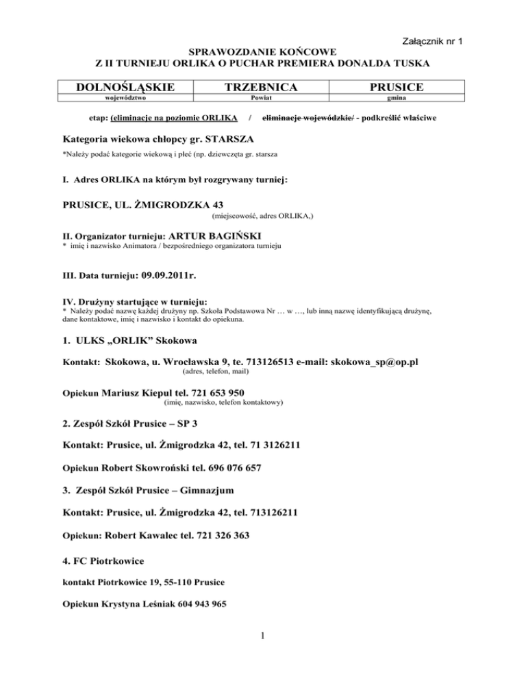 Załącznik nr 1 SPRAWOZDANIE KOŃCOWE Z II TURNIEJU ORLIKA O PUCHAR PREMIERA DONALDA TUSKA DOLNOŚLĄSKIE TRZEBNICA PRUSICE województwo Powiat gmina etap: (eliminacje na poziomie ORLIKA eliminacje wojewódzkie/ - podkreślić właściwe / Kategoria wiekowa chłopcy gr. STARSZA *Należy podać kategorie wiekową i płeć (np. dziewczęta gr. starsza I. Adres ORLIKA na którym był rozgrywany turniej: PRUSICE, UL. ŻMIGRODZKA 43 (miejscowość, adres ORLIKA,) II. Organizator turnieju: ARTUR BAGIŃSKI * imię i nazwisko Animatora / bezpośredniego organizatora turnieju III. Data turnieju: 09.09.2011r. IV. Drużyny startujące w turnieju: * Należy podać nazwę każdej drużyny np. Szkoła Podstawowa Nr … w …, lub inną nazwę identyfikującą drużynę, dane kontaktowe, imię i nazwisko i kontakt do opiekuna. 1. ULKS „ORLIK” Skokowa Kontakt: Skokowa, u. Wrocławska 9, te. 713126513 e-mail: [email protected] (adres, telefon, mail) Opiekun Mariusz Kiepul tel. 721 653 950 (imię, nazwisko, telefon kontaktowy) 2. Zespół Szkół Prusice – SP 3 Kontakt: Prusice, ul. Żmigrodzka 42, tel. 71 3126211 Opiekun Robert Skowroński tel. 696 076 657 3. Zespół Szkół Prusice – Gimnazjum Kontakt: Prusice, ul. Żmigrodzka 42, tel. 713126211 Opiekun: Robert Kawalec tel. 721 326 363 4. FC Piotrkowice kontakt Piotrkowice 19, 55-110 Prusice Opiekun Krystyna Leśniak 604 943 965 1 V. Schemat rozgrywek/ Wyniki: *. Należy podać wyniki wszystkich meczów rozgrywanych w turnieju Mecze rozgrywane systemem „każdy z każdym” ORLIK – FC PIOTRKOWICE 2:2 SP 3 – GIMNAZJUM 0:5 ORLIK – GIMNAZJUM 2:1 FC PIOTRKOWICE – SP 3 0:5 GIMNAZJUM – FC PIOTRKOWICE 7:1 ORLIK – SP 3 1:0 VI. Klasyfikacja końcowa: *.. Należy podać nazwy drużyn, w przypadku drużyn, które zajęły miejsca I, II, III należy podać dane zawodników – imiona i nazwiska. (przy pierwszym, drugim i trzecim miejscu prosimy o podanie imienia i nazwiska i telefonu kontaktowego) I miejsce – ULKS „ORLIK” SKOKOWA w składzie: 1 DOMINIK FIGURA 2 KACPER GOŁAŚ 3 ADRIAN HOVAGYMYAN 4 MARCIN MACIOCHA 5 MATEUSZ MAĆKIEWICZ 6 KAMIL POSPUŁA 7 KACPER SZKUDLAREK 8 MARCIN TOMASZEWSKI 9 PRZEMYSŁAW ŻUK 10 HUBERT LIZAK Opiekun MARIUSZ KIEPUL tel. Kontaktowy 721 653 950 II miejsce – ZESPÓŁ SZKÓŁ PRUSICE – GIMNAZJUM w składzie: 1 DANIEL KRAMARZ 2 SEBASTIAN SZEMIEL 3 JAKUB WOLSKI 4 KAROL BĄK 5 MICHAŁ GAJDULEWICZ 6 TOMASZ SZEWCZYK 7 SZYMON DOMAGAŁA 8 ADAM KOZAN 9 JAKUB KOWALCZYK 10 MARTIN HOJACZYK Opiekun ROBERT KAWALEC tel. kontaktowy 721 326 363 2 III miejsce – ZESPÓŁ SZKÓŁ PRUSICE – SP 3 w składzie: 1 GRZEGORZ KULAWIAK 2 PRZEMYSŁAW ZDYBEL 3 KAMIL BONKE 4 DAMIAN TOKARZ 5 SZYMON KAWALEC 6 OSKAR SOBIERAJ 7 MAREK ABRAHAMOWICZ 8 ŁUKASZ DZIURNY 9 JAKUB ADAMCZYK 10 ADRIAN GAJDULEWICZ Opiekun ROBERT SKOWROŃSKI tel. Kontaktowy 696 076 657 IV miejsce – FC PIOTRKOWICE w składzie: 1 GRZEGORZ KWOLIK 2 KAMIL GRABOWSKI 3 MACIEJ HAJDZIONY 4 ROBERT LEWANDOWSKI 5 DOMINIK BESZCZYŃSKI 6 PAWEŁ BUCZEK 7 PATRYK ZBOROWSKI 8 KORNEL ZIELIŃSKI 9 PATRYK SEKUŁA 10 MATEUSZ OWSIANY Opiekun KRYSTYNA LEŚNIAK tel. Kontaktowy 604 943 965 3 Opis turnieju: *.. Prosimy o kilka zdań opisujących przebieg turnieju, informacje o patronatach, o przebiegu ceremonii wręczenia nagród, można dołączyć zdjęcia itd. Turniej został zorganizowany 9 września 2011 roku. W turnieju uczestniczyły 4 drużyny mecze rozgrywano system rozgrywek „każdy z każdym”. Burmistrz Gminy Prusice Igor Bandrowicz oraz Starosta Powiatu Trzebnickiego wręczyli na zakończenie turnieju każdej drużynie pamiątkowy puchar oraz dyplom. Artur Bagiński Podpis Animatora / Organizatora turnieju 4