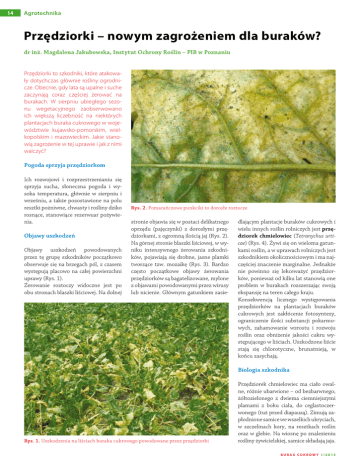 14 Agrotechnika Przędziorki – nowym zagrożeniem dla buraków? dr inż. Magdalena Jakubowska, Instytut Ochrony Roślin – PIB w Poznaniu Przędziorki to szkodniki, które atakowały dotychczas głównie rośliny ogrodnicze. Obecnie, gdy lata są upalne i suche zaczynają coraz częściej żerować na burakach. W sierpniu ubiegłego sezonu wegetacyjnego zaobserwowano ich większą liczebność na niektórych plantacjach buraka cukrowego w województwie kujawsko-pomorskim, wielkopolskim i mazowieckim. Jakie stanowią zagrożenie w tej uprawie i jak z nimi walczyć? Pogoda sprzyja przędziorkom Ich rozwojowi i rozprzestrzenianiu się sprzyja sucha, słoneczna pogoda i wysoka temperatura, głównie w sierpniu i wrześniu, a także pozostawione na polu resztki pożniwne, chwasty i rośliny dziko rosnące, stanowiące rezerwuar pożywienia. Objawy uszkodzeń Objawy uszkodzeń powodowanych przez tę grupę szkodników początkowo obserwuje się na brzegach pól, z czasem występują placowo na całej powierzchni uprawy (Rys. 1). Żerowanie roztoczy widoczne jest po obu stronach blaszki liściowej. Na dolnej Rys. 2. Pomarańczowe punkciki to dorosłe roztocze stronie objawia się w postaci delikatnego oprzędu (pajęczynki) z dorosłymi przędziorkami, z ogromną ilością jaj (Rys. 2). Na górnej stronie blaszki liściowej, w wyniku intensywnego żerowania szkodników, pojawiają się drobne, jasne plamki tworzące tzw. mozaikę (Rys. 3). Bardzo często początkowe objawy żerowania przędziorków są bagatelizowane, mylone z objawami powodowanymi przez wirusy lub nicienie. Głównym gatunkiem zasie- dlającym plantacje buraków cukrowych i wielu innych roślin rolniczych jest przędziorek chmielowiec (Tetranychus urticae) (Rys. 4). Żywi się on wieloma gatunkami roślin, a w uprawach rolniczych jest szkodnikiem okolicznościowym i ma najczęściej znaczenie marginalne. Jednakże nie powinno się lekceważyć przędziorków, ponieważ od kilku lat stanowią one problem w burakach rozszerzając swoją ekspansję na teren całego kraju. Konsekwencją licznego występowania przędziorków na plantacjach buraków cukrowych jest zakłócenie fotosyntezy, ograniczenie ilości substancji pokarmowych, zahamowanie wzrostu i rozwoju roślin oraz obniżenie jakości cukru występującego w liściach. Uszkodzone liście stają się chlorotyczne, brunatnieją, w końcu zasychają. Biologia szkodnika Rys. 1. Uszkodzenia na liściach buraka cukrowego powodowane przez przędziorki Przędziorek chmielowiec ma ciało owalne, różnie ubarwione – od bezbarwnego, żółtozielonego z dwiema ciemniejszymi plamami z boku ciała, do ceglastoczerwonego (tuż przed diapauzą). Zimują zapłodnione samice we wszelkich ukryciach, w szczelinach kory, na resztkach roślin oraz w glebie. Na wiosnę po znalezieniu rośliny żywicielskiej, samice składają jaja. BURAK CUKROWY 1/2014 Agrotechnika Przędziorki w sprzyjających warunkach, czyli przy wysokiej temperaturze i niskiej wilgotności szybko zwiększają swoją liczebność, żerując intensywnie na dolnej stronie liści (pod osłonką z przędzy), co powoduje marmurkowate przebarwienia liści i ich deformacje (Rys. 5). Monitoring plantacji Ważną rolę w systemie ochrony plantacji spełnia monitoring prowadzony przez służby surowcowe cukrowni, jak również przez specjalistów instytucji naukowych. Doświadczenia lat ubiegłych nad występowaniem przędziorków na burakach wymusiły na plantatorach prowadzenie monitoringu tych roztoczy. Szczególnie ważne jest wskazanie najbardziej optymalnego terminu pierwszego zabiegu. Najwyższą efektywną ochronę uzyskuje się wtedy, gdy jest on wykonany w początkowych fazach rozwoju szkodnika. Zatem, zlekceważenie przez plantatora pierwszych objawów żerowania na plantacji równe będzie przegraniu walki z agrofagiem i grozi poważnymi stratami w plonie buraków. Walka z tymi szkodnikami jest trudna i nie zawsze przynosi zadowalające efekty. Obecnie nie ma żadnych zarejestrowanych akarycydów na przędziorka chmielowca w buraku cukrowym. Od roku 2013 Instytut Ochrony Roślin – PIB wraz z koncernem Pfeifer & Langen prowadzi doświadczenia nad skutecznością wybranych preparatów roztoczobójczych w walce z tymi szkodnikami. Rys. 3. Żółknięcia i mozaika na liściach buraka powodowane żerowaniem przędziorków Rys. 4. Przędziorek chmielowiec Jak zwalczać przędziorki Przędziorki w uprawach polowych zwalcza się zwykle jeden lub dwa razy w sezonie wegetacyjnym. W pierwszej kolejności zaleca się stosowanie preparatów zawierających oleje parafinowe, np. Promanal 60 EC, które utrudniają wylęganie się larw lub uniemożliwiają im oddychanie. Później można użyć akarycydów: Apollo 500 S.C. (s.a. chlofentezyna), Nissorun 050 EC (hexithiazoks), Magus 200 SC (fenazachin), Sanmite 20 WP (pirydaben), Ortus 05 SC (fenpiroksymat), Omite 30 WP (propargit), Vermitec 018 EC (abamektyna) oraz Envidor 240 SC (spirodiclofen). Stosowanie wyłącznie chemicznej ochrony nie zawsze jest skuteczne, między innymi, dlatego, że przędziorki bardzo 1/2014 BURAK CUKROWY Rys. 5. Pole zaatakowane przez przędziorki, zahamowanie wzrostu roślin, żółknięcie liści 15 16 Ochrona roślin szybko wykształcają odporność. Dlatego w przypadku tej grupy szkodników ważne jest naprzemienne stosowanie środków o różnych mechanizmach działania. Alternatywą są środki biologiczne Do zwalczania przędziorków w uprawach można także stosować czynniki biologiczne, które są skuteczne i bez- pieczne dla uprawianych roślin oraz dla ludzi i zwierząt. Oprócz występujących w środowisku naturalnych wrogów, można stosować środki biologiczne dostępne na naszym rynku, np.: Phytoseiulus System, Spidex, Fitopak, Phytoline P, Therodiplosis System, Feltiline, Spidend, Mirical-N, Miripak, Spiral, Amblyline Cal, Anderline A, Andersoni System do zwalczania przędziorków. Biorąc pod uwagę coraz częstsze występowanie w n