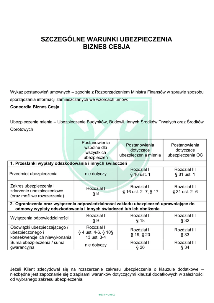 SZCZEGÓLNE WARUNKI UBEZPIECZENIA BIZNES CESJA Wykaz postanowień umownych – zgodnie z Rozporządzeniem Ministra Finansów w sprawie sposobu sporządzania informacji zamieszczanych we wzorcach umów: Concordia Biznes Cesja Ubezpieczenie mienia – Ubezpieczenie Budynków, Budowli, Innych Środków Trwałych oraz Środków Obrotowych Postanowienia Postanowienia wspólne dla dotyczące wszystkich ubezpieczenia mienia ubezpieczeń 1. Przesłanki wypłaty odszkodowania i innych świadczeń Rozdział II Przedmiot ubezpieczenia nie dotyczy § 16 ust. 1 Zakres ubezpieczenia i zdarzenie ubezpieczeniowe (oraz możliwe rozszerzenia) Rozdział I §8 Rozdział II § 16 ust. 2- 7, § 17 Postanowienia dotyczące ubezpieczenia OC Rozdział III § 31 ust. 1 Rozdział III § 31 ust. 2- 6 2. Ograniczenia oraz wyłączenia odpowiedzialności zakładu ubezpieczeń uprawniające do odmowy wypłaty odszkodowania i innych świadczeń lub ich obniżenia Wyłączenia odpowiedzialności Obowiązki ubezpieczającego / ubezpieczonego i konsekwencje ich niewykonania Suma ubezpieczenia / suma gwarancyjna Rozdział I §9 Rozdział II § 18 Rozdział III § 32 Rozdział I § 4 ust. 4-6, § 10§ 13 ust. 3-4 Rozdział II § 19, § 20 Rozdział III § 33 nie dotyczy Rozdział II § 26 Rozdział III § 34 Jeżeli Klient zdecydował się na rozszerzenie zakresu ubezpieczenia o klauzule dodatkowe – niezbędne jest zapoznanie się z zapisami warunków dotyczącymi klauzul dodatkowych w zależności od wybranego zakresu ubezpieczenia. BIZC/SWU/16/02 SZCZEGÓLNE WARUNKI UBEZPIECZENIA BIZNES CESJA Oznaczenie klauzuli Klauzula ubezpieczenia mienia od dewastacji Klauzula ubezpieczenia mienia od przepięć Klauzula ubezpieczenia mienia od katastrofy budowlanej Klauzula ubezpieczenia środków obrotowych od rozmrożenia Klauzula ubezpieczenia dokumentów niezbędnych do refundacji leków Klauzula ubezpieczenia sprzętu elektronicznego Klauzula ubezpieczenia pojazdów wolnobieżnych niepodlegających rejestracji Klauzula ubezpieczenia mienia w transporcie Klauzula ubezpieczenia maszyn od awarii i uszkodzeń BIZC/SWU/16/02 Przesłanki wypłaty odszkodowania i innych świadczeń Ograniczenia oraz wyłączenia odpowiedzialności zakładu ubezpieczeń uprawniające do odmowy wypłaty odszkodowania i innych świadczeń lub ich obniżenia Ust. 1, ust. 3 Ust. 2 Ust. 1 Ust. 2, ust. 3 Ust. 1 Ust. 2, ust. 3 Ust. 1, ust. 2 Ust. 3, ust. 4 Ust. 1, ust. 2, ust. 3 Ust. 4, ust. 5 Ust. 1, ust. 2, ust. 3 Ust. 4, ust. 5 Ust. 1, ust. 2, ust. 3 Ust. 4 Ust. 1, ust. 2, ust. 3, ust. 4 Ust. 5, ust. 6, ust. 7, ust. 8 Ust. 1, ust. 2 Ust. 3, ust. 4, ust. 5 BIZNES CESJA 2 z 12 SZCZEGÓLNE WARUNKI UBEZPIECZENIA BIZNES CESJA ROZDZIAŁ I POSTANOWIENIA OGÓLNE (MAJĄCE ZASTOSOWANIE DO WSZYSTKICH UBEZPIECZEŃ) 1. 2. 3. 4. 5. §1 Zastosowanie SWU Niniejsze Szczególne Warunki Ubezpieczenia (zwane dalej SWU) mają zastosowanie do umów ubezpieczenia zawieranych przez Concordia Polska Towarzystwo Ubezpieczeń Wzajemnych, zwane dalej Ubezpieczycielem, z osobami fizycznymi prowadzącymi działalność gospodarczą, osobami prawnymi albo jednostkami nieposiadającymi osobowości prawnej, zwanymi dalej Ubezpieczającymi. Postanowienia Rozdziału I SWU mają zastosowanie do wszystkich ubezpieczeń regulowanych przez niniejsze SWU. Postanowienia Rozdziału II oraz Rozdziału III mają zastosowanie wyłącznie do ubezpieczeń regulowanych w tych Rozdziałach SWU. Umowa ubezpieczenia może regulować prawa i obowiązki stron w sposób odbiegający od niniejszych SWU. Wprowadzenie do Umowy ubezpieczenia postanowień dodatkowych lub odmiennych od niniejszych SWU wymaga przyjęcia tych postanowień przez obie strony Umowy w formie pisemnej pod rygorem nieważności. Jeżeli dokument ubezpieczenia zawiera postanowienia, które odbiegają na niekorzyść Ubezpieczającego od treści złożonego przez niego wniosku ubezpieczeniowego lub od SWU, Ubezpieczyciel przedstawi Ubezpieczającemu te różnice na piśmie przy doręczeniu tego dokumentu, wyznaczając mu co najmniej 7 dniowy termin do zgłoszenia sprzeciwu. W pr zypadku braku sprzeciwu albo w razie zgłoszenia sprzeciwu po upływie wyznaczonego terminu uważa się, że Umowa została zawarta zgodnie z treścią dokumentu ubezpieczenia następnego dnia po upływie tego terminu. Zgłoszenie sprzeciwu w terminie oznacza, że Umowa ubezpieczenia nie została zawarta; w takiej sytuacji opłacona składka ubezpieczeniowa podlega zwrotowi bez potrąceń. W sprawach nieuregulowanych w niniejszych SWU mają zastosowanie przepisy ustawy o działalności ubezpieczeniowej, przepisy Kodeksu cywilnego oraz inne bezwzględnie obowiązujące przepisy prawa. §2 Definicje Terminom użytym w niniejszych SWU nadaje się następujące znaczenie: 1) budowla - trwale związany z gruntem obiekt budowlany inny niż budynki, wraz z instalacjami i urządzeniami, stanowiący całość techniczną i użytkową; 2) budynek - obiekt budowlany, który jest trwale związany z gruntem, wydzielony z przestrzeni za pomocą przegród budowlanych, posiadający fundamenty i dach, wraz z wbudowanymi instalacjami, urządzeniami technicznymi oraz zainstalowanymi na stałe elementami wykończeniowymi, stanowiący całość techniczną i użytkową; 3) budynek I klasy palności - budynek, którego ściany zewnętrzne są wykonane z materiałów niepalnych, mający pokrycie dachowe z materiału niepalnego lub niezapalnego; do tego rodzaju budynków zalicza się w szczególności budynki o ścianach zewnętrznych z cegły, pustaków, kamienia i pokryciu dachowym z blachy, dachówki, eternitu, łupka, jak również budynki o ścianach monolitycznych, z wielkiej płyty, z elementów wielkoblokowych, o konstrukcji szkieletowej, stalowej lub żelbetowej z wypełnieniem (dopuszczalna jest płyta warstwowa wypełniona wyłącznie wełną mineralną), których ściany zewnętrzne wykonane są z materiałów niepalnych, mające pokrycie dachowe z materiału niepalnego lub niez