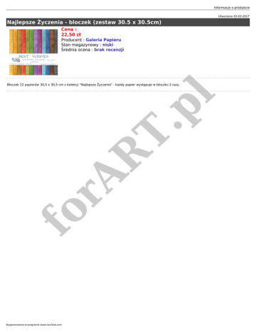 Informacje o produkcie Utworzono 03-03-2017 Najlepsze Życzenia - bloczek (zestaw 30.5 x 30.5cm) Cena : 22,50 zł Producent : Galeria Papieru Stan magazynowy : niski Średnia ocena : brak recenzji fo rA R T. pl Bloczek 12 papierów 30,5 x 30,5 cm z kolekcji "Najlepsze Życzenia" - każdy papier występuje w bloczku 2 razy. Wygenerowano w programie www.oscGold.com