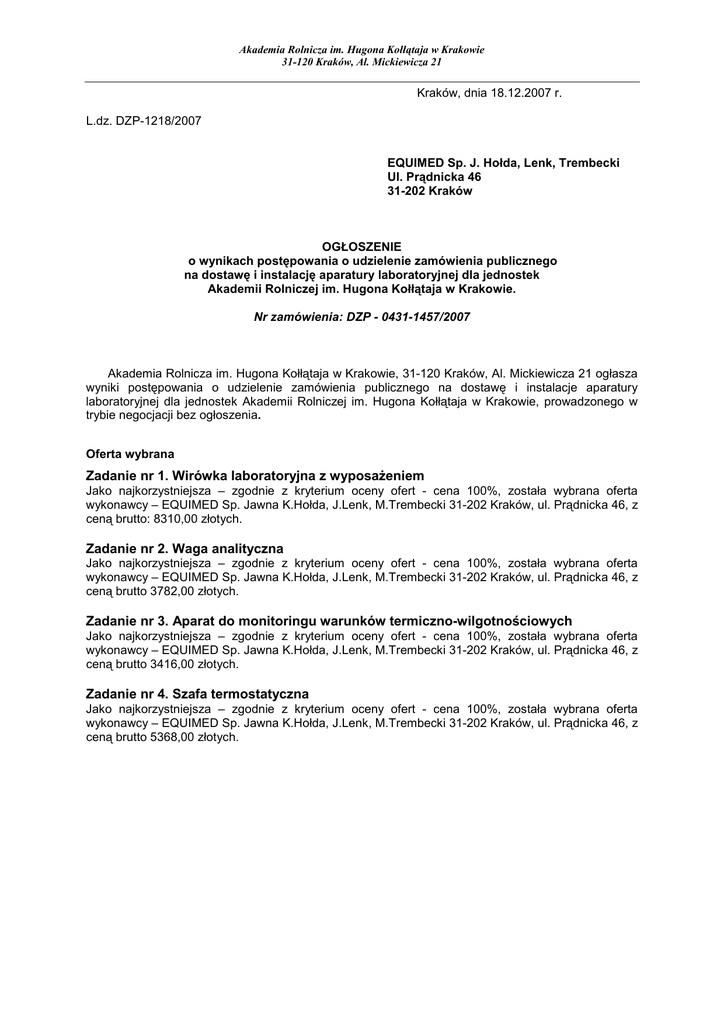 Akademia Rolnicza im. Hugona Kołłątaja w Krakowie 31-120 Kraków, Al. Mickiewicza 21 Kraków, dnia 18.12.2007 r. L.dz. DZP-1218/2007 EQUIMED Sp. J. Hołda, Lenk, Trembecki Ul. Prądnicka 46 31-202 Kraków OGŁOSZENIE o wynikach postępowania o udzielenie zamówienia publicznego na dostawę i instalację aparatury laboratoryjnej dla jednostek Akademii Rolniczej im. Hugona Kołłątaja w Krakowie. Nr zamówienia: DZP - 0431-1457/2007 Akademia Rolnicza im. Hugona Kołłątaja w Krakowie, 31-120 Kraków, Al. Mickiewicza 21 ogłasza wyniki postępowania o udzielenie zamówienia publicznego na dostawę i instalacje aparatury laboratoryjnej dla jednostek Akademii Rolniczej im. Hugona Kołłątaja w Krakowie, prowadzonego w trybie negocjacji bez ogłoszenia. Oferta wybrana Zadanie nr 1. Wirówka laboratoryjna z wyposaŜeniem Jako najkorzystniejsza – zgodnie z kryterium oceny ofert - cena 100%, została wybrana oferta wykonawcy – EQUIMED Sp. Jawna K.Hołda, J.Lenk, M.Trembecki 31-202 Kraków, ul. Prądnicka 46, z ceną brutto: 8310,00 złotych. Zadanie nr 2. Waga analityczna Jako najkorzystniejsza – zgodnie z kryterium oceny ofert - cena 100%, została wybrana oferta wykonawcy – EQUIMED Sp. Jawna K.Hołda, J.Lenk, M.Trembecki 31-202 Kraków, ul. Prądnicka 46, z ceną brutto 3782,00 złotych. Zadanie nr 3. Aparat do monitoringu warunków termiczno-wilgotnościowych Jako najkorzystniejsza – zgodnie z kryterium oceny ofert - cena 100%, została wybrana oferta wykonawcy – EQUIMED Sp. Jawna K.Hołda, J.Lenk, M.Trembecki 31-202 Kraków, ul. Prądnicka 46, z ceną brutto 3416,00 złotych. Zadanie nr 4. Szafa termostatyczna Jako najkorzystniejsza – zgodnie z kryterium oceny ofert - cena 100%, została wybrana oferta wykonawcy – EQUIMED Sp. Jawna K.Hołda, J.Lenk, M.Trembecki 31-202 Kraków, ul. Prądnicka 46, z ceną brutto 5368,00 złotych.