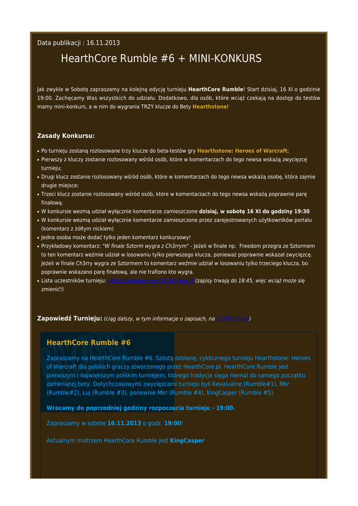 Data publikacji : 16.11.2013 HearthCore Rumble #6 + MINI-KONKURS Jak zwykle w Sobotę zapraszamy na kolejną edycję turnieju HearthCore Rumble! Start dzisiaj, 16 XI o godzinie 19:00. Zachęcamy Was wszystkich do udziału. Dodatkowo, dla osób, które wciąż czekają na dostęp do testów mamy mini-konkurs, a w nim do wygrania TRZY klucze do Bety Hearthstone! Zasady Konkursu: ● Po turnieju zostaną rozlosowane trzy klucze do beta-testów gry Hearthstone: Heroes of Warcraft; ● Pierwszy z kluczy zostanie rozlosowany wśród osób, które w komentarzach do tego newsa wskażą zwycięzcę turnieju; ● Drugi klucz zostanie rozlosowany wśród osób, które w komentarzach do tego newsa wskażą osobę, która zajmie drugie miejsce; ● Trzeci klucz zostanie rozlosowany wśród osób, które w komentarzach do tego newsa wskażą poprawnie parę finałową. ● W konkursie wezmą udział wyłącznie komentarze zamieszczone dzisiaj, w sobotę 16 XI do godziny 19:30 ● W konkursie wezmą udział wyłącznie komentarze zamieszczone przez zarejestrowanych użytkowników portalu (komentarz z żółtym nickiem) ● Jedna osoba może dodać tylko jeden komentarz konkursowy! ● Przykładowy komentarz: "W finale Sztorm wygra z Ch3rrym" - Jeżeli w finale np. Freedom przegra ze Sztormem to ten komentarz weźmie udział w losowaniu tylko pierwszego klucza, ponieważ poprawnie wskazał zwycięzcę. Jeżeli w finale Ch3rry wygra ze Sztormem to komentarz weźmie udział w losowaniu tylko trzeciego klucza, bo poprawnie wskazano parę finałową, ale nie trafiono kto wygra. ● Lista uczestników turnieju: http://challonge.com/HC_Rumble_6 (zapisy trwają do 18:45, więc wciąż może się zmienić!) Zapowiedź Turnieju: (ciąg dalszy, w tym informacje o zapisach, na hearthcore.pl) HearthCore Rumble #6 Zapraszamy na HearthCore Rumble #6. Szóstą odsłonę, cyklicznego turnieju Hearthstone: Heroes of Warcraft dla polskich graczy stworzonego przez HearthCore.pl. HearthCore Rumble jest pierwszym i największym polskim turniejem, którego tradycja sięga niemal do samego początku zamkniętej bety. Dotychczasowymi zwycięzcami turnieju byli Kevalvaine (Rumble#1), Mkr (Rumble#2), Luj (Rumble #3), ponownie Mkr (Rumble #4), KingCasper (Rumble #5). Wracamy do poprzedniej godziny rozpoczęcia turnieju - 19:00. Zapraszamy w sobotę 16.11.2013 o godz. 19:00! Aktualnym mistrzem HearthCore Rumble jest KingCasper 18:45 Zamknięcie zapisów w systemie Challonge 18:50 Sprawdzenie obecności na TS 18:55 Rozlosowanie pierwszej rundy 19:00 Rozpoczęcie turnieju 1. Posiadanie konta w Europejskiej wersji Hearthstone: Heroes of Warcraft Beta 2. Obecność na kanale TeamSpeak (TS) 3 (info dotyczące kanału poniżej) 3. Podczas rejestracji w turnieju za pomocą portalu Challonge (www.challonge.com) użycie swojego battlenet tag oraz zamieszczenie logo swojej klasy jako avatar w profilu ustawień portalu challonge (pod tym linkiemznajdziecie odpowiednie grafiki). Jeżeli w momencie zapisu nie wiecie jaką będziecie grali klasą, nie ma sprawy, musicie jednak zaktualizować swój profil przed rozpoczęciem turnieju. 1. Formuła STANDARD (żadnych ograniczeń w deckach - możecie darować sobie NOZDORMU gdyż systemie gier towarzyskich nie działa) dopuszczalne zmiany w deckach pomiędzy spotkaniami. Niedopuszczalna zmiana Hero (Jeden Hero w turnieju) 2. Runda eliminacyjna – System szwajcarski (Best of 1) 3. Ilość Rund Swiss - 5 (do 24 uczestników) lub 7 (pow. 24 uczestników) 4. Jeżeli w momencie rozpoczęcia danej rundy Swiss jeden z zawodników jest niedostępny lub z dala od klawiatury, to ma 60 sekund na powrót. W przeciwnym wypadku zostaje skreślony z listy uczestników a jego przeciwnik otrzymuje wygraną (poprzednie wyniki zawodnika skreślonego nie są weryfikowane). 5. Każda runda trwa do momentu zakończenia ostatniego pojedynku. W momencie wprowadzenia do systemu ostatniego wyniku rozlosowana jest runda kolejna. 6. Awans do turnieju finałowego - top 8 systemu szwajcarskiego (jeżeli liczba uczestników < 54) lub top 16 turnieju szwajcarskiego (jeżeli liczba uczestników => 54) 7. Pomiędzy turniejem szwajcarskim, a rundą finałową odbędzie się przerwa minimum 20 minut, o której zainteresowani (finaliści) zostaną poinformowani na TS. 8. W turnieju finałowym rozstawienie wg wyników z turnieju szwajcarskiego. 9. W turnieju finałowym wszystkie spotkania rozgrywane są w systemie Best of 3 (do dwóch wygranych) za wyjątkiem finału, który rozgrywany jest w systemie Best of 5 (do 3 wygranych). 10. Jeżeli dana para jest już pewna może rozgrywać swoje spotkania pomimo faktu, że poprzednia runda nie została zakończona. Autor: Ch3rry Liczba wyświetleń strony: 2945 Data publikacji : 16.11.2013 Data modyfikacji : 16.11.2013 Tagi: konkurs, turniej, HearthCore, Rumble Komentarz (87) dodaj komentarz Devizz2472 wygra !!!~bonasforza 2013/11/16 17:57 Devizz2472 zajmie 2 miejsce ;-)~bonasforza 2013/11/16 17:59 Devizz2472 wygra !!!~Isen 2013/11/16 17:59 Devizz2472 wygra~Melcma 2013/11/16 18:03 1. KingCasper 2. Devizz2472~Cantona 2013/11/16 18:08 Wygra mkr z KingCasper~atraM1988 2013/11/16 18:09 Devizz2472 wygra !!!~bonasforza 2013/11/16 18:11 Devizz2472~Isen 2013/11/16 18:12 mkrr i KingCasper para finałowa~eMka 2013/11/16 18:18 Mkrr3 wygra z Devizz2472~greebo4 2013/11/16 18:21 W finale wygra KingCasper z mkr#2874 . Ps. Dokonałem rejestracji :)~Radnev 2013/11/16 18:33 Devizz2472 zajmie 1 lub 2 miejsce~Malpka999 2013/11/16 18:39 W finale mkr wygra z Sztorm~invictus97 2013/11/16 18:55 1. mkr 2. KingCasper~FyTqE 2013/11/16 18:56 mkrr3 i Devizz2472 - para finałowa~Małcin 2013/11/16 19:12 Devizz2472 wygra~Małcin 2013/11/16 19:12 mkrr3 zajmie 2 miejsce~Małcin 2013/11/16 19:13 W finale Devizz2472 wygra z mkrr3~Małcin 2013/11/16 19:15 Devizz2472 wygra z mkrr3~Macore 2013/11/16 19:25 W finale Devizz2472 wygra z mkrr3~Blunt 2013/11/16 19:26 W finale wygra KingCasper ze Sztormem~Vesna 2013/11/16 19:26 w final