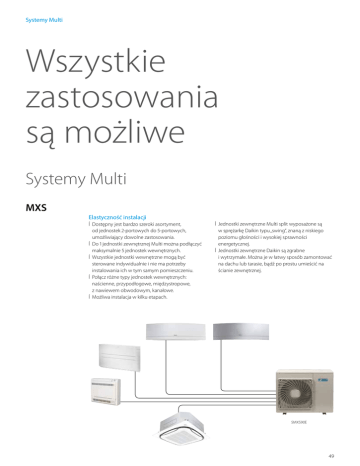 Systemy Multi Wszystkie zastosowania są możliwe Systemy Multi MXS Elastyczność instalacji ŰŰ Dostępny jest bardzo szeroki asortyment, od jednostek 2-portowych do 5-portowych, umożliwiający dowolne zastosowania. ŰŰ Do 1 jednostki zewnętrznej Multi można podłączyć maksymalnie 5 jednostek wewnętrznych. ŰŰ Wszystkie jednostki wewnętrzne mogą być sterowane indywidualnie i nie ma potrzeby instalowania ich w tym samym pomieszczeniu. ŰŰ Połącz różne typy jednostek wewnętrznych: naścienne, przypodłogowe, międzystropowe, z nawiewem obwodowym, kanałowe. ŰŰ Możliwa instalacja w kilku etapach. ŰŰ Jednostki zewnętrzne Multi split wyposażone są w sprężarkę Daikin typu „swing”, znaną z niskiego poziomu głośności i wysokiej sprawności energetycznej. ŰŰ Jednostki zewnętrzne Daikin są zgrabne i wytrzymałe. Można je w łatwy sposób zamontować na dachu lub tarasie, bądź po prostu umieścić na ścianie zewnętrznej. 5MXS90E 49 Systemy Multi RXYSQ Elastyczność instalacji ʯʯ Do 1 jednostki zewnętrznej VRV można podłączyć maksymalnie 9 jednostek wewnętrznych ʯʯ Wszystkie jednostki wewnętrzne mogą być sterowane indywidualnie i nie ma potrzeby instalowania ich w tym samym pomieszczeniu ʯʯ Połącz różne typy jednostek wewnętrznych: naścienne, przypodłogowe, międzystropowe, z nawiewem obwodowym, kanałowe ʯʯ Możliwa instalacja w kilku etapach ʯʯ Maksymalna całkowita długość instalacji rurowej 145 m oferuje dużo większą elastyczność w zakresie doboru pozycji instalacyjnej ʯʯ Skrzynka rozdzielcza (BP) zmienia objętość czynnika chłodniczego, aby spełnić zapotrzebowanie pomieszczenia na ogrzewanie i chłodzenie Seria VRV IV S Rozwiązanie zapewniające oszczędność miejsca bez kompromisów na rzecz efektywności -- W 2015 roku, nasza udana gama mini VRV zostanie zaktualizowana w całości w celu jeszcze lepszego dopasowania do zastosowań mieszkaniowych, gdzie ilość miejsca jest ograniczona a oczekiwania odnośnie sprawności są bardzo wysokie. ›› Zmienna temperatura czynnika chłodniczego ›› Najmniejszy system VRV ›› Niewielka wysokość zapewnia minimalny efekt wizualny ›› Niewielki ciężar, co skraca czas instalacji i zmniejsza ilość osób niezbędnych do jej przeprowadzenia do absolutnego minimum 50 BP BP BP Rozgałęźnik Refnet RXYSQ-P8V1 MXS-E/F/G/H/K System „Multi” ʯʯ Jednostki zewnętrzne do zastosowań multi. ʯʯ Agregaty zewnętrzne wyposażono w sprężarkę typu swing, znaną z niskiego poziomu głośności i wysokiej efektywności energetycznej ʯʯ Do 1 agregatu zewnętrznego multi można podłączyć 5 jednostek wewnętrznych; wszystkie jednostki wewnętrzne są sterowane indywidualnie i nie trzeba ich instalować w tym samym pomieszczeniu, w tym samym czasie; możliwość równoczesnej pracy w trybie chłodzenia lub grzania ʯʯ Możliwość podłączenia różnych typów jednostek wewnętrznych: np. naściennych, przypodłogowych, kanałowych itd. 3MXS52E/4MXS68E 5MXS90E 2MXS40-50H Tabele doboru agregatów Multi dostępne są w formie elektronicznej. Skontaktuj się z dealerem lub sprawdź na stronie www.daikin.pl Jednostka przypodłogowa Jednostka naścienna JEDNOSTKI WEWNĘTRZNE MOŻLIWE DO PODŁĄCZENIA FTXG-L CTXS-K FTXS-K FTXS-G FTX-J3 FVXG-K Kaseta Całkowicie z nawiewem płaska kaseta obwodowym Typ Flexi FVXS-F FLXS-B(9) FCQG-F Jednostka Jednostka przypodłogowa podstropowa (bez obudowy) Jednostka kanałowa FFQ-C FDBQ-B/ FBQ-D FDXS-F(9) FHQ-C FNQ-A 20 25 35 50 15 35 20 25 35 42 50 60 71 20 25 35 25 35 50 25 35 50 25 35 50 60 35 50 60 25 35 50 60 25 35 50 60 25 35 50 60 35 50 60 25 35 50 60 2MXS40H 2MXS50H 3MXS40K 3MXS52E 3MXS68G 4MXS68F 4MXS80E 5MXS90E ● ● ● ● ● ● ● ● ● ● ● ● ● ● ● ● ● ● ● ● ● ● ● ● ● ● ● ● ● ● ● ● ● ● ● ● ● ● ● ● ● ● ● ● ● ● ● ● ● ● ● ● ● ● ● ● ● ● ● ● ● ● ● ● ● ● ● ● ● ● ● ● ● ● ● ● ● ● ● ● ● ● ● ● ● ● ● ● ● ● ● ● ● ● ● ● ● ● ● ● ● ● ● ● ● ● ● ● ● ● ● ● ● ● ● ● ● ● ● ● ● ● ● ● ● ● ● ● ● ● ● ● ● ● ● ● ● ● ● ● ● ● ● ● ● ● ● ● ● ● ● ● ● ● ● ● ● ● ● ● ● ● ● ● ● ● ● ● ● ● ● ● ● ● ● ● ● ● ● ● ● ● ● ● ● ● ● ● ● ● ● ● ● ● ● ● ● ● ● ● ● ● ● ● ● ● ● ● ● ● ● ● ● ● ● ● ● ● ● ● ● ● ● ● ● ● ● ● ● ● ● ● ● ● ● ● ● ● ● ● ● ● ● ● ● ● ● ● ● ● ● ● ● ● ● ● ● ● ● ● ● ● ● ● ● ● ● ● ● ● ● ● ● ● ● ● ● ● ● ● ● ● ● ● ● ● ● ● Uwaga: pola w kolorze niebieskim zawierają dane wstępne Jednostka zewnętrzna Wymiary Jednostka Ciężar Jednostka Poziom mocy Chłodzenie akustycznej Grzanie Poziom ciśnienia Chłodzenie akustycznego Grzanie Zakres pracy Chłodzenie Grzanie Czynnik chłodniczy Typ/Ilość/GWP Połączenia instalacji rurowej Zasilanie Prąd - 50Hz Wys. x Szer. x Głęb. Nom. Nom. Temp. zewn. Min.~Maks. Temp. zewn. Min.~Maks. Ilość Ciecz Śr. zewn. Gaz Śr. zewn. Długość inst. rurowej JZ-JW Maks. Dodatkowy ładunek czynnika chłodniczego Różnice JW- JZ Maks. poziomów JW-JW Maks. Liczba faz/Częstotliwość/Napięcie Maksymalne amperaże bezpiecznika (MFA) 2MXS40H 2MXS50H 3MXS40K 3MXS52E 3MXS68G 4MXS68F 4MXS80E 5MXS90E mm 550x765x285 735x936x300 770 x 900 x 320 kg 38 42 49 58 72 73 dBA 62 63 59 61 62 66 dBA 60 dBA 47 48 46 48 52 dBA 48 50 47 49 52 °CDB 10~46 -10~46 °CWB -15~18 kg R-410A / 1,2 R-410A / 1,6 R-410A / 2,59 R-410A / 2,6 R-410A / 2,99 R-410A / 2,0 / 2.087,5 / 2.087,5 / 2.087,5 / 2.087,5 / 2.087,5 / 2.087,5 2,5 3,3 4,2 5,4 6,2 TCO2Eq mm 6,35 mm 9,5 9,52 m 20 25 kg/m 0,02 (dla