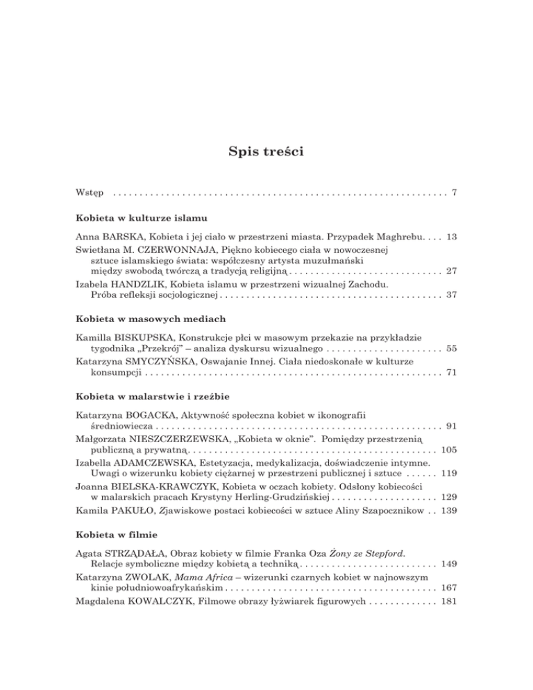 Spis treści Wstęp . . . . . . . . . . . . . . . . . . . . . . . . . . . . . . . . . . . . . . . . . . . . . . . . . . . . . . . . . . . . . . . 7 Kobieta w kulturze islamu Anna Barska, Kobieta i jej ciało w przestrzeni miasta. Przypadek Maghrebu. . . . . 13 Swietłana M. Czerwonnaja, Piękno kobiecego ciała w nowoczesnej sztuce islamskiego świata: współczesny artysta muzułmański między swobodą twórczą a tradycją religijną. . . . . . . . . . . . . . . . . . . . . . . . . . . . . . 27 Izabela Handzlik, Kobieta islamu w przestrzeni wizualnej Zachodu. Próba refleksji socjologicznej. . . . . . . . . . . . . . . . . . . . . . . . . . . . . . . . . . . . . . . . . . . 37 Kobieta w masowych mediach Kamilla Biskupska, Konstrukcje płci w masowym przekazie na przykładzie tygodnika „Przekrój” – analiza dyskursu wizualnego . . . . . . . . . . . . . . . . . . . . . . . 55 Katarzyna Smyczyńska, Oswajanie Innej. Ciała niedoskonałe w kulturze konsumpcji. . . . . . . . . . . . . . . . . . . . . . . . . . . . . . . . . . . . . . . . . . . . . . . . . . . . . . . . . 71 Kobieta w malarstwie i rzeźbie Katarzyna Bogacka, Aktywność społeczna kobiet w ikonografii średniowiecza. . . . . . . . . . . . . . . . . . . . . . . . . . . . . . . . . . . . . . . . . . . . . . . . . . . . . . . 91 Małgorzata Nieszczerzewska, „Kobieta w oknie”. Pomiędzy przestrzenią publiczną a prywatną. . . . . . . . . . . . . . . . . . . . . . . . . . . . . . . . . . . . . . . . . . . . . . . . 105 Izabella Adamczewska, Estetyzacja, medykalizacja, doświadczenie intymne. Uwagi o wizerunku kobiety ciężarnej w przestrzeni publicznej i sztuce . . . . . . . 119 Joanna Bielska-Krawczyk, Kobieta w oczach kobiety. Odsłony kobiecości w malarskich pracach Krystyny Herling-Grudzińskiej. . . . . . . . . . . . . . . . . . . . . 129 Kamila Pakuło, Zjawiskowe postaci kobiecości w sztuce Aliny Szapocznikow . . . 139 Kobieta w filmie Agata Strządała, Obraz kobiety w filmie Franka Oza Żony ze Stepford. Relacje symboliczne między kobietą a techniką. . . . . . . . . . . . . . . . . . . . . . . . . . . 149 Katarzyna Zwolak, Mama Africa – wizerunki czarnych kobiet w najnowszym kinie południowoafrykańskim. . . . . . . . . . . . . . . . . . . . . . . . . . . . . . . . . . . . . . . . . 167 Magdalena Kowalczyk, Filmowe obrazy łyżwiarek figurowych. . . . . . . . . . . . . . 181 Karolina Sikorska, Ona (nie) żyje! O polisemii kobiecości w serialu Czysta krew. . . . . . . . . . . . . . . . . . . . . . . . . . . . . . . . . . . . . . . . . . . . . . . . . . . . . . . . 189 Kobieta w literaturze Barbara Kubis, Kobieta tułacz z perspektywy problemów okupacyjnej literatury dokumentu osobistego. . . . . . . . . . . . . . . . . . . . . . . . . . . . . . . . . . . . . . . 203 Katarzyna R. Łozowska, Współczesna flâneuse. Kobieta w pejzażu miejskim. . . 217 Kobieta w społeczeństwie Magdalena Nawrat, Agnieszka Gawor, Kobiecość – kapitał czy bolączka współczesnej kobiety?. . . . . . . . . . . . . . . . . . . . . . . . . . . . . . . . . . . . . . . . . . . . . . . . 233 Aneta Strzelecka, Emilia Sztabnicka, Obraz kobiety w wybranych podręcznikach do nauczania języka polskiego jako obcego . . . . . . . . . . . . . . . . . . 245 Aleksandra Szlagowska, Późne macierzyństwo – wybór czy konieczność?. . . . . 259 Michał Szewczyk, „Matki” i „córki” na fotografiach – co je łączy, a co dzieli?. . . . 275