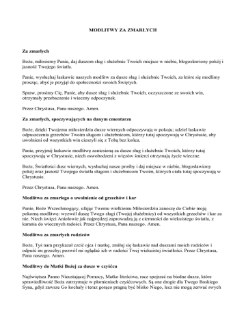 MODLITWY ZA ZMARŁYCH Za zmarłych Boże, miłosierny Panie, daj duszom sług i służebnic Twoich miejsce w niebie, błogosławiony pokój i jasność Twojego światła. Panie, wysłuchaj łaskawie naszych modlitw za dusze sług i służebnic Twoich, za które się modlimy prosząc, abyś je przyjął do społeczności swoich Świętych. Spraw, prosimy Cię, Panie, aby dusze sług i służebnic Twoich, oczyszczone ze swoich win, otrzymały przebaczenie i wieczny odpoczynek. Przez Chrystusa, Pana naszego. Amen. Za zmarłych, spoczywających na danym cmentarzu Boże, dzięki Twojemu miłosierdziu dusze wiernych odpoczywają w pokoju; udziel łaskawie odpuszczenia grzechów Twoim sługom i służebnicom, którzy tutaj spoczywają w Chrystusie, aby uwolnieni od wszystkich win cieszyli się z Tobą bez końca. Panie, przyjmij łaskawie modlitwę zaniesioną za dusze sług i służebnic Twoich, którzy tutaj spoczywają w Chrystusie, niech oswobodzeni z więzów śmierci otrzymają życie wieczne. Boże, Światłości dusz wiernych, wysłuchaj nasze prośby i daj miejsce w niebie, błogosławiony pokój oraz jasność Twojego światła sługom i służebnicom Twoim, których ciała tutaj spoczywają w Chrystusie. Przez Chrystusa, Pana naszego. Amen. Modlitwa za zmarłego o uwolnienie od grzechów i kar Panie, Boże Wszechmogący, ufając Twemu wielkiemu Miłosierdziu zanoszę do Ciebie moją pokorną modlitwę: wyzwól duszę Twego sługi (Twojej służebnicy) od wszystkich grzechów i kar za nie. Niech święci Aniołowie jak najprędzej zaprowadzą ją z ciemności do wiekuistego światła, z karania do wiecznych radości. Przez Chrystusa, Pana naszego. Amen. Modlitwa za zmarłych rodziców Boże, Tyś nam przykazał czcić ojca i matkę, zmiłuj się łaskawie nad duszami moich rodziców i odpuść im grzechy; pozwól mi oglądać ich w radości Twej wiekuistej światłości. Przez Chrystusa, Pana naszego. Amen. Modlitwy do Matki Bożej za dusze w czyśćcu Najświętsza Panno Nieustającej Pomocy, Matko litościwa, racz spojrzeć na biedne dusze, które sprawiedliwość Boża zatrzymuje w płomieniach czyśćcowych. Są one drogie dla Twego Boskiego Syna, gdyż zawsze Go kochały i teraz gorąco pragną być blisko Niego, lecz nie mogą zerwać swych więzów, które je trzymają w palącym ogniu czyśćca. Niech się wzruszy Twe serce, Matko litościwa. Pośpiesz z pociechą dla tych dusz, które Cię zawsze kochały i teraz ślą do Ciebie swe westchnienia. Wszak są to Twoje dzieci, bądź więc im pomocą, nawiedzaj je, osładzaj ich męki, skróć ich cierpienia i nie zwlekaj z ich wybawieniem. Amen. Koronka za zmarłych W imię Ojca i Syna i Ducha Świętego. Amen. Na trzech początkowych paciorkach mówimy: Boże mój, wierzę w Ciebie, boś jest prawdą nieomylną. Mam nadzieję w Tobie, boś jest nieskończenie dobry. Kocham Cię, Panie, boś jest godzien nieskończonej miłości. Na małych paciorkach 10 razy: Słodkie Serce Maryi, bądź moim zbawieniem. Zakończyć znakiem krzyża i modlitwą: Boże mój, przez Najsłodsze Serce Maryi ofiaruję Ci tę modlitwę i proszę, abyś ją przyjął za dusze w czyśćcu cierpiące. Litania za zmarłych Kyrie elejson. Chryste elejson. Kyrie elejson. Chryste, usłysz nas. Chryste, wysłuchaj nas. Ojcze z nieba Boże, zmiłuj się nad nami. Synu, Odkupicielu świata, Boże, zmiłuj się nad nami. Duchu Święty, Boże, zmiłuj się nad nami. Święta Trójco, jedyny Boże, zmiłuj się nad nami. Święta Maryjo, módl się za nami. Wszyscy święci Aniołowie i Archaniołowie, módlcie się za nimi. Wszystkie święte niebieskie duchy, Wszyscy święci Patriarchowie i Prorocy, Wszyscy święci Apostołowie i Ewangeliści, Wszyscy święci niewinni Młodziankowie, Wszyscy święci Męczennicy, Wszyscy święci Biskupi i Wyznawcy, Wszyscy święci Doktorzy Kościoła, Wszyscy święci Kapłani i Lewici, Wszyscy święci Zakonnicy i Pustelnicy, Wszystkie święte panny i wdowy, Wszyscy święci i święte Boże, Bądź im miłościw, przepuść im Panie! Bądź im miłościw, wysłuchaj nas Panie! Od mak czyśćcowych, wybaw ich Panie. Przez Twoje Wcielenie, Przez Twoje Narodzenie, Przez Twój Chrzest i post święty, Przez trudy Twego życia, Przez Krzyż i Mękę Twoja, Przez Śmierć i pogrzeb Twój, Przez Zmartwychwstanie Twoje, Przez Wniebowstąpienie Twoje, Przez Zesłanie Ducha Świętego Pocieszyciela, My grzeszni, Ciebie prosimy za cierpiącymi duszami, wysłuchaj nas Panie. Abyś duszom zmarłych ich winy odpuścić raczył, Abyś im resztę kary za grzechy darować raczył, Abyś je z czyśćca wybawić raczył, Abyś je do życia wiecznego przyjąć raczył. Baranku Boży, który gładzisz grzechy świata, wieczny odpoczynek racz im dać Panie. Baranku Boży, który gładzisz grzechy świata, wieczny odpoczynek racz im dać Panie. Baranku Boży, który gładzisz grzechy świata, wieczny odpoczynek racz im dać Panie. Uwolnij, Panie, dusze wszystkich wiernych zmarłych. Od wszystkich ich więzów. Módlmy się: Boże, Stwórco i Odkupicielu wszystkich wiernych udziel duszom sług i służebnic Twoich odpuszczenia wszystkich grzechów; niech przez pokorne prośby nasze dostąpią zbawienia, którego zawsze pragnęły. Który żyjesz i królujesz przez wszystkie wieki wieków. Amen. Akty strzeliste za zmarłych Boże, miłosierny Panie, daj duszom sług i służebnic Twoich miejsce w niebie, błogosławiony pokój i jasność Twojego światła. Panie, wysłuchaj łaskawie naszych modlitw za dusze sług i służebnic Twoich, za które się modlimy prosząc, abyś je przyjął do społeczności swoich Świętych Spraw, prosimy Cię, Panie, aby dusze sług i służebnic Twoich, oczyszczone ze swoich win, otrzymały przebaczenie i wieczny odpoczynek.