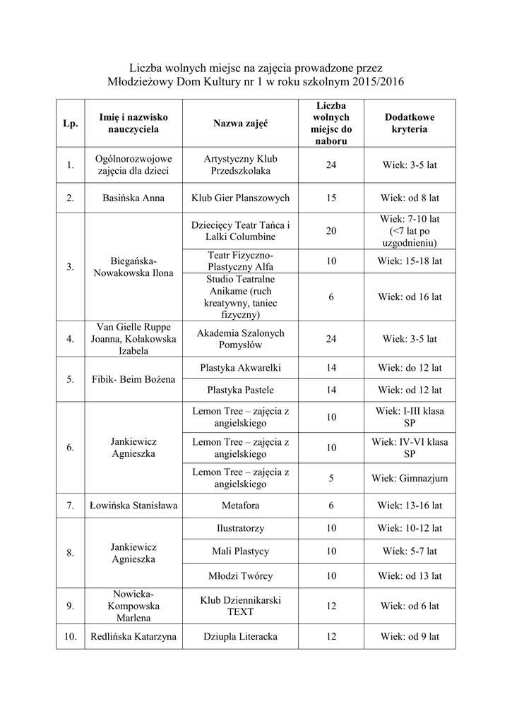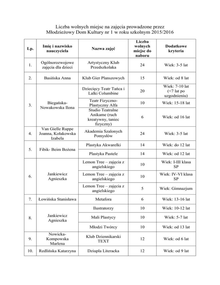 Liczba wolnych miejsc na zajęcia prowadzone przez Młodzieżowy Dom Kultury nr 1 w roku szkolnym 2015/2016 Lp. Imię i nazwisko nauczyciela Nazwa zajęć Liczba wolnych miejsc do naboru 1. Ogólnorozwojowe zajęcia dla dzieci Artystyczny Klub Przedszkolaka 24 Wiek: 3-5 lat 2. Basińska Anna Klub Gier Planszowych 15 Wiek: od 8 lat 20 Wiek: 7-10 lat (<7 lat po uzgodnieniu) 10 Wiek: 15-18 lat 6 Wiek: od 16 lat Akademia Szalonych Pomysłów 24 Wiek: 3-5 lat Plastyka Akwarelki 14 Wiek: do 12 lat Plastyka Pastele 14 Wiek: od 12 lat Lemon Tree – zajęcia z angielskiego 10 Wiek: I-III klasa SP Lemon Tree – zajęcia z angielskiego 10 Wiek: IV-VI klasa SP Lemon Tree – zajęcia z angielskiego 5 Wiek: Gimnazjum Metafora 6 Wiek: 13-16 lat Ilustratorzy 10 Wiek: 10-12 lat Mali Plastycy 10 Wiek: 5-7 lat Młodzi Twórcy 10 Wiek: od 13 lat 9. NowickaKompowska Marlena Klub Dziennikarski TEXT 12 Wiek: od 6 lat 10. Redlińska Katarzyna Dziupla Literacka 12 Wiek: od 9 lat Dziecięcy Teatr Tańca i Lalki Columbine 3. BiegańskaNowakowska Ilona 4. Van Gielle Ruppe Joanna, Kołakowska Izabela 5. Fibik- Beim Bożena 6. 7. 8. Jankiewicz Agnieszka Łowińska Stanisława Jankiewicz Agnieszka Teatr FizycznoPlastyczny Alfa Studio Teatralne Anikame (ruch kreatywny, taniec fizyczny) Dodatkowe kryteria Klub Tańca i Jogi – Tajor 11. Sidor Urszula 12. SkowrońskaSobolewska Katarzyna 13. 14. 15. SobierańskaMatuszewska Dorota Stypa Łukasz Szydłowski Przemysław 10 Wiek: 10-17 lat 15 Wiek: od 6 lat 5 Wiek: 8-14 lat Teatr Bezcenny I 10 Wiek: liceum Teatr Bezcenny II Recenzenci 10 Wiek: od 6 lat Panaceum I 10 Wiek: 6-11 lat Śpiew 5 Wiek: od 13 lat Tenis Stołowy (Ziemny) 10 Siłownia 10 Piłka nożna 10 Fotoplastikon 12 Wiek: 7-11 lat Fotoplastikon I 12 Wiek: od 15 lat (zajęcia rozpoczną się w drugim semestrze) Zespół Pauza- zajęcia wokalne Zespół Antrakt- zajęcia wokalno-instrumentalne (gitara) Wiek: szkoła gimnazjalna i ponadgimnazjalna Wiek: szkoła gimnazjalna i ponadgimnazjalna Wiek: szkoła gimnazjalna i ponadgimnazjalna 16. Woźniak Emilian NTR – NIE TYLKO ROCK 21 Wiek: od 14 lat 17. Woźny Paweł Tenis Stołowy i Ziemny 24 Wiek: od 6 lat Sekcja Piłki Nożnej 16 Wiek: 6-11 lat Klub Spartanina 12 Wiek: od 13 lat 12 Wiek: 10-16 lat 18 Wiek: 10-16 lat 18. 19. Zachara Rafał Anna Basińska, Katarzyna Redlińska Klub Młodego Poznaniaka „Projekt filmowy” Klub Młodego Poznaniaka „Wycieczka po mieście” 20. Rowecka Anna „Wesołe nutki” 4 21. Kozerska Agnieszka, D. SobierańskaMatuszkiewicz Music Dance Junior 25 Wiek: szkoła podstawowa Wiek: rok urodzenia 20002005 22. 23. Music Dance Kids 20 Music Dance Mini 12 Fit Junior 20 Fit Kids 20 YATEY 3 (gr. początkująca) 12 Wiek: 9-11 lat YATEY 4 (gr. początkująca) 12 Wiek: 6-8 lat Kozerska Agnieszka Kornelia ŻeberskaKowalska Wiek: rok urodzenia 20062008 Wiek: rok urodzenia: 20092011 Wiek: rok urodzenia 20042000 Wiek: rok urodzenia 20082005