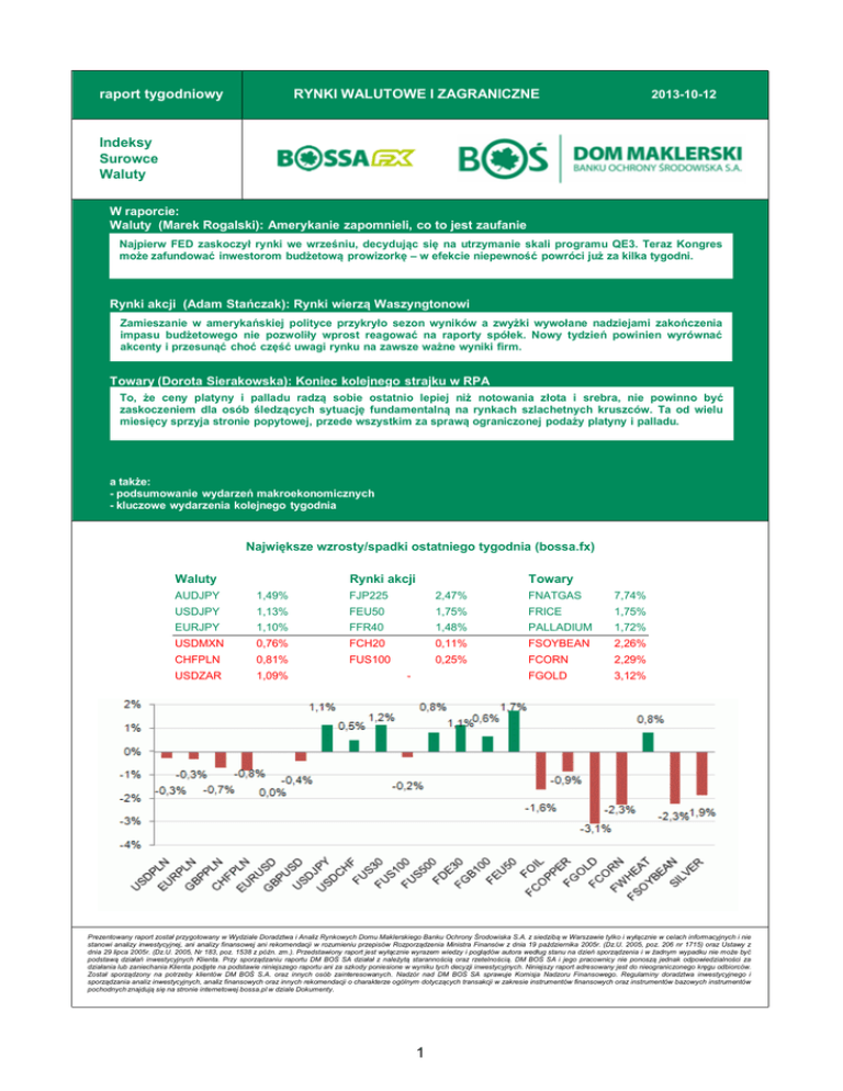 raport tygodniowy RYNKI WALUTOWE I ZAGRANICZNE 2013-10-12 Indeksy Surowce Waluty W raporcie: Waluty (Marek Rogalski): Amerykanie zapomnieli, co to jest zaufanie Najpierw FED zaskoczył rynki we wrześniu, decydując się na utrzymanie skali programu QE3. Teraz Kongres może zafundować inwestorom budżetową prowizorkę – w efekcie niepewność powróci już za kilka tygodni. Rynki akcji (Adam Stańczak): Rynki wierzą Waszyngtonowi Zamieszanie w amerykańskiej polityce przykryło sezon wyników a zwyżki wywołane nadziejami zakończenia 21impasu budżetowego nie pozwoliły wprost reagować na raporty spółek. Nowy tydzień powinien wyrównać akcenty i przesunąć choć część uwagi rynku na zawsze ważne wyniki firm. Towary (Dorota Sierakowska): Koniec kolejnego strajku w RPA To, że ceny platyny i palladu radzą sobie ostatnio lepiej niż notowania złota i srebra, nie powinno być zaskoczeniem dla osób śledzących sytuację fundamentalną na rynkach szlachetnych kruszców. Ta od wielu miesięcy sprzyja stronie popytowej, przede wszystkim za sprawą ograniczonej podaży platyny i palladu. a także: - podsumowanie wydarzeń makroekonomicznych - kluczowe wydarzenia kolejnego tygodnia Największe wzrosty/spadki ostatniego tygodnia (bossa.fx) Waluty Rynki akcji Towary AUDJPY 1,49% FJP225 2,47% FNATGAS 7,74% USDJPY 1,13% FEU50 1,75% FRICE 1,75% EURJPY 1,10% FFR40 1,48% PALLADIUM 1,72% USDMXN 0,76% FCH20 0,11% FSOYBEAN 2,26% CHFPLN 0,81% FUS100 0,25% FCORN 2,29% USDZAR 1,09% FGOLD 3,12% - Prezentowany raport został przygotowany w Wydziale Doradztwa i Analiz Rynkowych Domu Maklerskiego Banku Ochrony Środowiska S.A. z siedzibą w Warszawie tylko i wyłącznie w celach informacyjnych i nie stanowi analizy inwestycyjnej, ani analizy finansowej ani rekomendacji w rozumieniu przepisów Rozporządzenia Ministra Finansów z dnia 19 października 2005r. (Dz.U. 2005, poz. 206 nr 1715) oraz Ustawy z dnia 29 lipca 2005r. (Dz.U. 2005, Nr 183, poz. 1538 z późn. zm.). Przedstawiony raport jest wyłącznie wyrazem wiedzy i poglądów autora według stanu na dzień sporządzenia i w żadnym wypadku nie może być podstawą działań inwestycyjnych Klienta. Przy sporządzaniu raportu DM BOŚ SA działał z należytą starannością oraz rzetelnością. DM BOŚ SA i jego pracownicy nie ponoszą jednak odpowiedzialności za działania lub zaniechania Klienta podjęte na podstawie niniejszego raportu ani za szkody poniesione w wyniku tych decyzji inwestycyjnych. Niniejszy raport adresowany jest do nieograniczonego kręgu odbiorców. Został sporządzony na potrzeby klientów DM BOŚ S.A. oraz innych osób zainteresowanych. Nadzór nad DM BOŚ SA sprawuje Komisja Nadzoru Finansowego. Regulaminy doradztwa inwestycyjnego i sporządzania analiz inwestycyjnych, analiz finansowych oraz innych rekomendacji o charakterze ogólnym dotyczących transakcji w zakresie instrumentów finansowych oraz instrumentów bazowych instrumentów pochodnych znajdują się na stronie internetowej bossa.pl w dziale Dokumenty. 1 raport tygodniowy RYNKI WALUTOWE I ZAGRANICZNE 2013-10-12 Makro-podsumowanie minionego tygodnia Poniedziałek, 7 października: CZECHY: Produkcja przemysłowa 1,6% r/r (Oczek. -1,3% r/r, Poprz. 2,1% r/r), sierpień CZECHY: Bilans handlu zagranicznego 20,59 mld CZK (Oczek. 20,94 mld CZK, Poprz. 27,86 mld CZK), sierpień EUROLAND: Indeks Sentix 61 (Oczek, 8,3, Poprz. 6,5), październik EUROLAND: PKB s.a. - fin. 0.3% k/k -0,6% r/r (Oczek. 0,3% k/k -0,5% r/r, Poprz. -0,2% k/k -1,2% r/r), II kw. KANADA: Pozwolenia na budowę domów -21,2% m/m (Oczek. -7,4% m/m, Poprz. 21,4% m/m), sierpień USA: Kredyt konsumencki 13,63 mld USD (Oczek. 12 mld USD, Poprz. 10,40 mld USD), sierpień NOWA ZELANDIA: Indeks zaufania biznesu 38 (POprz. 32), III kw. Wtorek, 8 października: CHINY: Indeks PMI dla usług 52,4 (Poprz. 52,8), wrzesień AUSTRALIA: Indeks zaufania biznesu 12 (Poprz. 6), wrzesień SZWAJCARIA: Sprzedaż detaliczna s.a. 1,5% m/m (Poprz. -1,0% m/m), sierpień SZWAJCARIA: Inflacja CPI 0,3% m/m -0,1% r/r (Oczek. 0,3% m/m -0,1% r/r, Poprz. -0,1% m/m 0,0% r/r), wrzesień WĘGRY: Produkcja przemysłowa n.s.a. - wst. -1,4% r/r (Oczek. 1,2% r/r, Poprz. 4,8% r/r), sierpień CZECHY: Stopa bezrobocia 7,6% (Oczek. 7,6%, Poprz. 7,5%), wrzesień HISZPANIA: Produkcja przemysłowa w.d.a. -2% r/r (Oczek. -2% r/r, Poprz. -1,4% r/r), sierpień NIEMCY: Zamówienia w przemyśle n.s.a. 0,1% r/r (Poprz. 5% r/r), sierpień NIEMCY: Zamówienia w przemyśle w.d.a. 3,1% r/r (Oczek. 4% r/r, Poprz. 2% r/r), sierpień NIEMCY: Zamówienia w przemyśle s.a. -0,3% m/m (Oczek. 1,3% m/m, Poprz. -2,7% m/m), sierpień KANADA: Bilans handlu zagranicznego -1,31 mld CAD (Oczek. -0,70 mld CAD, Poprz. -0,93 mld CAD), sierpień Środa, 9 października: USA: Janet Yellen dostała oficjalną nominację na szefa FED od prezydenta Baracka Obamy. Teraz musi ją zaakceptować Kongres, co jednak wydaje się być formalnością. CZECHY: Inflacja CPI -0,4% m/m 1% r/r (Oczek. -0,2% m/m 1,2% r/r, Poprz. -0,2% m/m 1,3% r/r), wrzesień SŁOWACJA: Produkcja przemysłowa 4,4% r/r (Oczek. 1,9% r/r, Poprz. 2% r/r), sierpień SŁOWACJA: Bilans handlu zagranicznego 261,0 mln EUR (Oczek. 82 mln EUR, Poprz. 204,3 mln EUR), sierpień WIELKA BRYTANIA: Przetwórstwo przYmysłowe -1,2% m/m -0,2% r/r (Oczek. 0,4% m/m 1,0% r/r, Poprz. 0,2% m/m -0,7% r/r), WIELKA BRYTANIA: Bilans handlu zagranicznego -9,62 mld GBP (Oczek. -9,00 mld GBP, Poprz. -9,853 mld GBP), sierpień WIELKA BRYTANIA: Produkcja przemysłowa -1,1% m/m -1,5% r/r (Oczek. 0,4% m/m -0,6% r/r, Poprz. 0,0% m/m -1,6% r/r), sierpień NIEMCY: Produkcja przemysłowa w.d.a. 0,3% r/r (Oczek. -1% r/r, Poprz. -2,2% r/r), sierpień NIEMCY: Produkcja przemysłowa n.s.a. -3% r/r (Poprz. 1,3% r/r), sierpień NIEMCY: Produkcja przemysłowa s.a. 1,4% m/m (Oczek. 1% m/m, Poprz. -1,7% m/m), sierpień Czwartek, 10 października: USA: USA: Republikanie proponują czasowe podniesienie limitu długu o 6 tygodni – do 22 listopada, ab