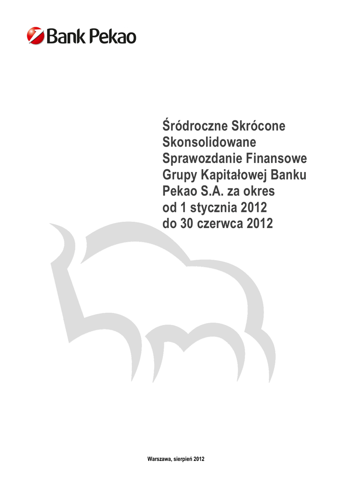 Śródroczne Skrócone Skonsolidowane Sprawozdanie Finansowe Grupy Kapitałowej Banku Pekao S.A. za okres od 1 stycznia 2012 do 30 czerwca 2012 Warszawa, sierpień 2012 Śródroczne Skrócone Skonsolidowane Sprawozdanie Finansowe Grupy Kapitałowej Banku Pekao S.A. za okres od 1 stycznia 2012 do 30 czerwca 2012 Spis treści Skonsolidowany rachunek zysków i strat .....................3 24. Kredyty i pożyczki udzielone klientom .................41 Skonsolidowane sprawozdanie z całkowitych dochodów..........................................................................5 25. Należności z tytułu leasingu finansowego ...........43 Skonsolidowane sprawozdanie z sytuacji finansowej .........................................................................6 27. Inwestycyjne (lokacyjne) papiery wartościowe ....50 Skonsolidowane sprawozdanie ze zmian w kapitale własnym.............................................................................7 26. Rachunkowość zabezpieczeń .............................44 28. Aktywa i zobowiązania przeznaczone do sprzedaży oraz działalność zaniechana ..............51 29. Wartości niematerialne ........................................55 Skonsolidowany rachunek przepływów pieniężnych...9 30. Rzeczowe aktywa trwałe .....................................55 Noty objaśniające ...........................................................11 31. Aktywa stanowiące zabezpieczenie zobowiązań 56 1. Informacje ogólne ..................................................11 32. Zobowiązania wobec innych banków ..................57 2. Skład Grupy ...........................................................11 33. Zobowiązania wobec klientów .............................57 3. Oświadczenie o zgodności ....................................12 34. Zobowiązania z tytułu emisji dłużnych papierów wartościowych .....................................................58 4. Istotne zasady rachunkowości...............................13 5. Zastosowanie szacunków i założeń ......................14 6. Zarządzanie ryzykiem finansowym........................14 7. Informacje dotyczące segmentów działalności .....25 8. Przychody i koszty z tytułu odsetek.......................28 9. Przychody i koszty z tytułu prowizji i opłat.............29 10. Przychody z tytułu dywidend ...............................30 35. Rezerwy ...............................................................59 36. Zobowiązania warunkowe ...................................60 37. Transakcje z jednostkami powiązanymi ..............61 38. Zdarzenia po dacie bilansu..................................69 Załączniki do sprawozdania finansowego ......................I Załącznik nr 1 13. Ogólne koszty administracyjne............................31 Nowe standardy, interpretacje i poprawki do opublikowanych standardów, które zostały opublikowane przez Radę Międzynarodowych Standardów Rachunkowości (RMSR) i oczekują na zatwierdzenie przez Unię Europejską...........................I 14. Pozostałe przychody i koszty operacyjne netto...31 Załącznik nr 2 15. Utrata wartości.....................................................33 Słowniczek.................................................................. V 11. Wynik na instrumentach finansowych przeznaczonych do obrotu ..................................30 12. Zyski (straty) na sprzedaży..................................30 16. Zysk (strata) z jednostek podporządkowanych ...35 17. Podstawowe składniki obciążenia podatkowego w rachunku zysków i strat i kapitale własnym .....35 18. Zysk netto przypadający na jedną akcję .............36 19. Decyzja w sprawie wypłaty dywidendy................36 20. Kasa i operacje z Bankiem Centralnym...............37 21. Należności od banków.........................................38 22. Aktywa oraz zobowiązania finansowe przeznaczone do obrotu ......................................39 23. Aktywa oraz zobowiązania z tytułu pochodnych instrumentów finansowych (przeznaczone do obrotu) .................................................................40 Bank Pekao S.A. 2 Śródroczne Skrócone Skonsolidowane Sprawozdanie Finansowe Grupy Kapitałowej Banku Pekao S.A. za okres od 1 stycznia 2012 do 30 czerwca 2012 Skonsolidowany rachunek zysków i strat (w tys. zł) Skonsolidowany rachunek zysków i strat NOTA Przychody z tytułu odsetek Koszty z tytułu odsetek Wynik z tytułu odsetek Przychody z tytułu prowizji i opłat Koszty z tytułu prowizji i opłat Wynik z tytułu prowizji i opłat Przychody z tytułu dywidend Wynik na instrumentach finansowych przeznaczonych do obrotu Wynik z tytułu rachunkowości zabezpieczeń wartości godziwej Wynik na pozostałych instrumentach finansowych wyznaczonych jako wyceniane w wartości godziwej przez wynik finansowy Zyski (straty) na sprzedaży kredytów i innych należności finansowych 8 8 RAZEM DZIAŁALNOŚĆ KONTYNUOWANA DZIAŁALNOŚĆ ZANIECHANA RAZEM 10 4 138 022 -1 759 488 2 378 534 1 391 496 -261 928 1 129 568 8 749 3 347 667 -1 221 214 2 126 453 1 444 724 -212 977 1 231 747 10 311 106 614 -46 470 60 144 17 885 -7 656 10 229 - 3 454 281 -1 267 684 2 186 597 1 462 609 -220 633 1 241 976 10 311 11 237 636 5 741 243 377 266 013 12 295 278 308 26 -8 737 - -8 737 -7 589 - -7 589 - - - -139 - -139 80 162 - - 80 162 - 4 844 -153 -48 - 4 796 -153 80 138 - 80 138 5 740 -48 5 692 24 3 752 167 79 486 24 3 831 653 -743 3 631 640 82 620 -743 3 714 260 -287 902 -15 189 -303 091 -258 738 -10 232 -268 970 -276 865 -15 189 -292 054 -282 485 -10 232 -292 717 - - - - - - -11 037 3 464 265 -1 619 883 -952 706 -667 177 64 297 -38 051 -19 467 -18 584 -11 037 3 528 562 -1 657 934 -972 173 -685 761 23 747 3 372 902 -1 603 743 -972 666 -631 077 72 388 -36 909 -18 114 -18 795 23 747 3 445 290 -1 640 652 -990 780 -649 872 -182 868 -3 527 -186 395 -183 878 -4 453 -188 331 -1 031 48 265 -1 755 517 25 271 -175 -41 753 - -1 031 48 090 -1 797 270 25 271 -896 28 539 -1 759 97