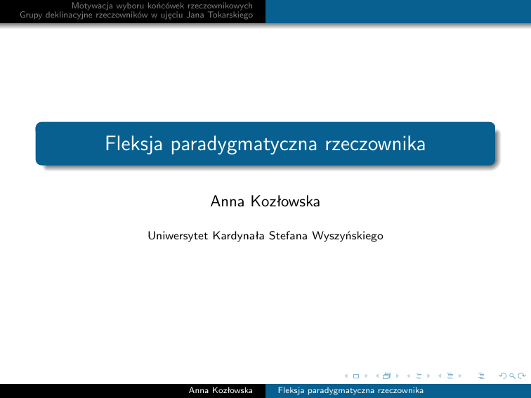 Motywacja wyboru końcówek rzeczownikowych Grupy deklinacyjne rzeczowników w ujęciu Jana Tokarskiego Fleksja paradygmatyczna rzeczownika Anna Kozłowska Uniwersytet Kardynała Stefana Wyszyńskiego Anna Kozłowska Fleksja paradygmatyczna rzeczownika Motywacja wyboru końcówek rzeczownikowych Grupy deklinacyjne rzeczowników w ujęciu Jana Tokarskiego 1 Motywacja wyboru końcówek rzeczownikowych 2 Grupy deklinacyjne rzeczowników w ujęciu Jana Tokarskiego Anna Kozłowska Fleksja paradygmatyczna rzeczownika Motywacja wyboru końcówek rzeczownikowych Grupy deklinacyjne rzeczowników w ujęciu Jana Tokarskiego Główne kryteria repartycji końcówek rzeczownika 1. Kryterium gramatyczne (rodzajowe). Przykłady: dom-∅ – chat-a – mieszkani-e; pan-∅ – pan-i. 2. Kryterium tematowe: spółgłoski miękkie: ć, dź, j, l, ń, ś, ź; spółgłoski stwardniałe: c, dz, cz, dż, sz, ż (rz); spółgłoski twarde: pozostałe spółgłoski. Przykłady: (o) koni-u – (o) chłopc-u – (o) stol-e; zielen-i – władz-y – wodzi-e. Anna Kozłowska Fleksja paradygmatyczna rzeczownika Motywacja wyboru końcówek rzeczownikowych Grupy deklinacyjne rzeczowników w ujęciu Jana Tokarskiego Dodatkowe kryteria repartycji końcówek rzeczownika 3. Kryterium semantyczne. Przykłady: D lp: strach-u ’uczucia’, ale strach-a na wróble, bas-u ’głosu’, ale bas-a ’mężczyzny o takim głosie’. 4. Kryterium leksykalne. Przykłady: D lp: woł-u, bawoł-u, piżmowoł-u. Anna Kozłowska Fleksja paradygmatyczna rzeczownika Motywacja wyboru końcówek rzeczownikowych Grupy deklinacyjne rzeczowników w ujęciu Jana Tokarskiego Łatwe i trudne przypadki deklinacji rzeczownikowej Przypadki łatwe: C lm: -om, B lm: B lm = D lm (mos), B lm = M lm (nmos), N lm: -ami/-mi, Msc lm: -ach/-ech, W lm: W lm = M lm. Przypadki szczególnie trudne: D lp rzeczowników męskich: -a lub -u, D lm rzeczowników męskich: -i/-y lub -ów. Przykłady: długopisu/długopisa, krawatu/krawata, mieczów/mieczy, kloszy/kloszów. Anna Kozłowska Fleksja paradygmatyczna rzeczownika Motywacja wyboru końcówek rzeczownikowych Grupy deklinacyjne rzeczowników w ujęciu Jana Tokarskiego Rzeczowniki męskie I M lp ∅ D lp -a/-u B lp = M/D Msc lp -u M lm -e/-owie D lm -i/-ów B lm = M/D II M lp ∅ D lp -a/-u B lp = M/D Msc lp -u M lm -e/-owie D lm -y/ów B lm = M/D rywal, król, koń, paź, drań, korzeń, metal płacz, pisarz, żołnierz, stolarz, kibic III M lp ∅ D lp -u/-a B lp = M/D Msc lp -u M lm -i/-y D lm -ów B lm = M/D IV M lp ∅ D lp -u/-a B lp = M/D Msc lp -e M lm -y/-i/-owie D lm -ów B lm = M/D V M lp ∅ D lp -a B lp = D Msc lp -e M lm -e D lm -∅/-ów B lm = D skok, biedak, wrzask, kołek, pociąg, targ profesor, notes, zespół, zdun, chleb, traktor łodzianin, salezjanin, chrześcijanin, Amerykanin Anna Kozłowska Fleksja paradygmatyczna rzeczownika Motywacja wyboru końcówek rzeczownikowych Grupy deklinacyjne rzeczowników w ujęciu Jana Tokarskiego Inne typy rzeczowników męskich zakończone na -a M lp -a D lp -y B lp -ę Msc lp -e M lm -i/-y/-owie D lm -ów/-∅ B lm = D poeta, kolega, mężczyzna, karateka zakończone na -o M lp -o D lp -a B lp = D Msc lp -u M lm -e/-owie D lm -ów B lm = D o odmianie przymiotnikowej M lp -y D lp -ego B lp = D Msc lp -ym M lm -i/y D lm -ych B lm = D wujo, Dyzio, Otello, tatulo, Józio uczony, leśniczy, dyżurny, śledczy, woźny Anna Kozłowska Fleksja paradygmatyczna rzeczownika Motywacja wyboru końcówek rzeczownikowych Grupy deklinacyjne rzeczowników w ujęciu Jana Tokarskiego Rzeczowniki żeńskie I M lp -a D lp -i C lp -i Msc lp -i M lm -e D lm -i/-∅ suknia, ciocia, wiśnia, kolacja, rola, linia II M lp -a D lp -y C lp -y Msc lp -y M lm -e D lm -y/-∅ III M lp -a D lp -i/-y C lp -e Msc lp -e M lm -i/-y D lm -∅ kasza, praca, owca, władza, marża droga, książka, rzeka, mucha, matka Anna Kozłowska IV M lp -a D lp -y C lp -e Msc lp -e M lm -y D lm -∅ stopa, skóra, ryba, szansa, trawa, rana V M lp -∅ D lp -i C lp -i Msc lp -i M lm -i/-e D lm -i VI M lp -∅ D lp -y C lp -y Msc lp -y M lm -y/-e D lm -y chęć, pieśń, łódź, sól, dłoń poręcz, mysz, noc, podróż, twarz Fleksja paradygmatyczna rzeczownika Motywacja wyboru końcówek rzeczownikowych Grupy deklinacyjne rzeczowników w ujęciu Jana Tokarskiego Inne typy rzeczowników żeńskich z tematem samogłoskowym M lp -a D lp -i/-y C lp -i Msc lp -i M lm -y/-e D lm -y/-i idea, kamea, statua, stoa z końcówką M lp -i M lp -i D lp -i C lp -i Msc lp -i M lm -e D lm -∅ pani, gospodyni, dozorczyni, kniahini, mistrzyni Anna Kozłowska o odmianie przymiotnikowej M lp -a D lp -ej C lp -ej Msc lp -ej M lm -e D lm -ych woźna, prosta, styczna, trwała z wszystkimi formami synkretycznymi psyche, katharsis, gnu, whisky, pepsi, mate, kakadu, lady Fleksja paradygmatyczna rzeczownika Motywacja wyboru końcówek rzeczownikowych Grupy deklinacyjne rzeczowników w ujęciu Jana Tokarskiego Rzeczowniki nijakie I M lp -e Msc lp -u M lm -a II M lp -o Msc lp -u M lm -a III M lp -o Msc lp -e M lm -a szczęście, słońce, pole, morze, pranie, serce, picie słoniątko, echo, łożysko, jabłko, oko, udko, ucho okno, dłuto, ciało, tarło, wiązadło, lato Anna Kozłowska IV M lp -ę Msc lp -u M lm -(ęt)a dziewczę, kocię, prosię, kurczę, niemowlę V M lp -ę Msc lp -u M lm -(on)a ramię, znamię, imię, ciemię Fleksja paradygmatyczna rzeczownika VI wszystkie formy lp na -um; M lm -a liceum, technikum, forum, muzeum, podium Motywacja wyboru końcówek rzeczownikowych Grupy deklinacyjne rzeczowników w ujęciu Jana Tokarskiego Pozostały typ odmiany rzeczowników nijakich o odmianie przymiotnikowej M lp -e D lp -ego Msc lp -ym M lm -e czesne, znaleźne, Zakopane Anna Kozłowska Fleksja paradygmatyczna rzeczownika Motywacja wyboru końcówek rzeczownikowych Grupy deklinacyjne rzeczowników w ujęciu Jana Tokarskiego Wierszyk mnemotechniczny Marka Świdzińskiego I II III Drwal do kuśnierza rzekł: „Ten konia