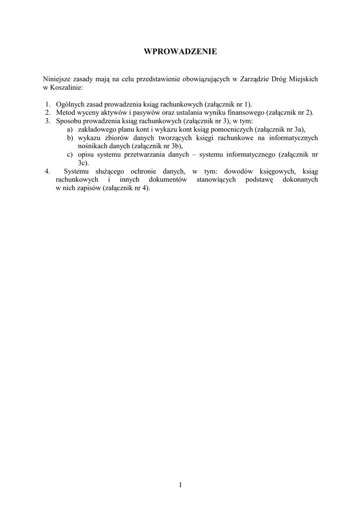 WPROWADZENIE Niniejsze zasady mają na celu przedstawienie obowiązujących w Zarządzie Dróg Miejskich w Koszalinie: 1. Ogólnych zasad prowadzenia ksiąg rachunkowych (załącznik nr 1). 2. Metod wyceny aktywów i pasywów oraz ustalania wyniku finansowego (załącznik nr 2). 3. Sposobu prowadzenia ksiąg rachunkowych (załącznik nr 3), w tym: a) zakładowego planu kont i wykazu kont ksiąg pomocniczych (załącznik nr 3a), b) wykazu zbiorów danych tworzących księgi rachunkowe na informatycznych nośnikach danych (załącznik nr 3b), c) opisu systemu przetwarzania danych – systemu informatycznego (załącznik nr 3c). 4. Systemu służącego ochronie danych, w tym: dowodów księgowych, ksiąg rachunkowych i innych dokumentów stanowiących podstawę dokonanych w nich zapisów (załącznik nr 4). 1 Załącznik nr 1 OGÓLNE ZASADY PROWADZENIA KSIĄG RACHUNKOWYCH 1. Miejsce prowadzenia ksiąg rachunkowych Księgi rachunkowe Zarządu Dróg Miejskich w Koszalinie prowadzone są w siedzibie Zarządu Dróg Miejskich w Koszalinie, Koszalin, ul. Połczyńska 24. 2. Określenie roku obrotowego oraz okresów sprawozdawczych Rokiem obrotowym jest okres roku budżetowego, czyli rok kalendarzowy od 1 stycznia do 31 grudnia. Najkrótszym okresem sprawozdawczym są poszczególne miesiące, w których sporządza się: - deklarację ZUS, - deklarację o podatku dochodowym od osób fizycznych oraz 1. sprawozdania budżetowe na podstawie przepisów rozporządzenia Ministra Finansów z dnia 3 lutego 2010 r. w sprawie sprawozdawczości budżetowej (Dz.U. Nr 20, poz. 103), 2. sprawozdania w zakresie ogółu operacji finansowych, w szczególności w zakresie należności i zobowiązań, w tym państwowego długu publicznego, udzielonych poręczeń i gwarancji na podstawie przepisów rozporządzenia Ministra Finansów z dnia 4 marca 2010 r. w sprawie sprawozdań jednostek sektora finansów publicznych w zakresie operacji finansowych (Dz.U. Nr 43, poz. 247); 3. sprawozdania finansowe na podstawie przepisów rozporządzenia Ministra Finansów z dnia 5 lipca 2010 r. w sprawie szczególnych zasad rachunkowości oraz planów kont dla budżetu państwa, budżetów jednostek samorządu terytorialnego, jednostek budżetowych, samorządowych zakładów budżetowych, państwowych funduszy celowych oraz państwowych jednostek budżetowych mających siedzibę poza granicami Rzeczypospolitej Polskiej (Dz.U. Nr 128, poz. 861); Za okresy miesięczne sporządza się sprawozdania: - sprawozdanie Rb-27S z wykonania planu dochodów budżetowych jednostki samorządu terytorialnego (odrębne dla powiatu i odrębne dla gminy), wzór sprawozdania stanowi załącznik nr 9 do rozporządzenia z poz. 1; - sprawozdanie Rb-28S z wykonania planu wydatków budżetowych jednostki samorządu terytorialnego (odrębne dla powiatu i odrębne dla gminy), wzór sprawozdania stanowi załącznik nr 20 do rozporządzenia z poz. 1; Za okresy kwartalne sporządza się sprawozdania: - sprawozdanie Rb-Z o stanie zobowiązań według tytułów dłużnych oraz poręczeń i gwarancji, wzór sprawozdania stanowi załącznik nr 1 do rozporządzenia z poz. 2; - sprawozdanie Rb-N o stanie należności oraz wybranych aktywów finansowych, wzór sprawozdania stanowi załącznik nr 3 do rozporządzenia z poz. 2. Za rok składa się sprawozdania: - sprawozdanie Rb-27S iRb-28S, wzór sprawozdań stanowią załączniki nr 9 i 20 z rozporządzenia z poz. 1; - sprawozdanie Rb-WSa o wydatkach strukturalnych poniesionych przez jednostki samorządu terytorialnego, wzór sprawozdania stanowi załącznik nr 30 do rozporządzenia z poz. 1; - sprawozdania finansowe obejmujące: 2 1. bilans jednostki budżetowej, wzór stanowi załącznik nr 5 do rozporządzenia z poz. 3, 2. rachunek zysków i strat (wariant porównawczy), wzór stanowi załącznik nr 7 do rozporządzenia z poz. 3; 3. zestawienie zmian w funduszu jednostki, wzór stanowi załącznik nr 8 do rozporządzenia z poz. 3. 3. Technika prowadzenia ksiąg rachunkowych Księgi rachunkowe Zarządu Dróg Miejskich w Koszalinie prowadzone są za pomocą komputera. Księgi rachunkowe obejmują zbiory zapisów księgowych, obrotów i sald, które tworzą: - dziennik, - księgę główną, - księgi pomocnicze, - zestawienia: obrotów i sald księgi głównej oraz sald ksiąg pomocniczych, - wykaz składników aktywów i pasywów (inwentarz). Dziennik prowadzony jest w sposób następujący: - zdarzenia, jakie nastąpiły w danym okresie sprawozdawczym, ujmowane są w nim chronologicznie, - zapisy są kolejno numerowane w okresie roku/miesiąca, co pozwala na ich jednoznaczne powiązanie ze sprawdzonymi i zatwierdzonymi dowodami księgowymi, - sumy zapisów (obroty) liczone są w sposób ciągły, - jego obroty są zgodne z obrotami zestawienia obrotów i sald kont księgi głównej. Dzienniki częściowe prowadzone są dla określonych grup rodzajowych zdarzeń. Na koniec każdego okresu sprawozdawczego sporządzane jest zestawienie obrotów dzienników częściowych. Księga główna (konta syntetyczne) prowadzona jest w sposób spełniający następujące zasady: - podwójnego zapisu, - systematycznego i chronologicznego rejestrowania zdarzeń gospodarczych zgodnie z zasadą memoriałową, z wyjątkiem dochodów i wydatków, które ujmowane są w terminie ich zapłaty (zasada kasowa), - powiązania dokonywanych w niej zapisów z zapisami w dzienniku. Księgi pomocnicze (konta analityczne) stanowią zapisy uszczegóławiające dla wybranych kont księgi głównej. Zapisy na kontach analitycznych dokonywane są zgodnie z zasadą zapisu powtarzanego. Ich forma dostosowywana jest za każdym razem do przedmiotu ewidencji konta głównego. Konta pozabilansowe pełnią funkcję wyłącznie informacyjno – kontrolną. Zdarzenia na nich rejestrowane nie powodują zmian w składnikach aktywów i pasywów. Na kontach pozabilansowych obowiązuje zapis jednokrotny, który nie podlega uzgodnieniu z dziennikiem ani innym urządze