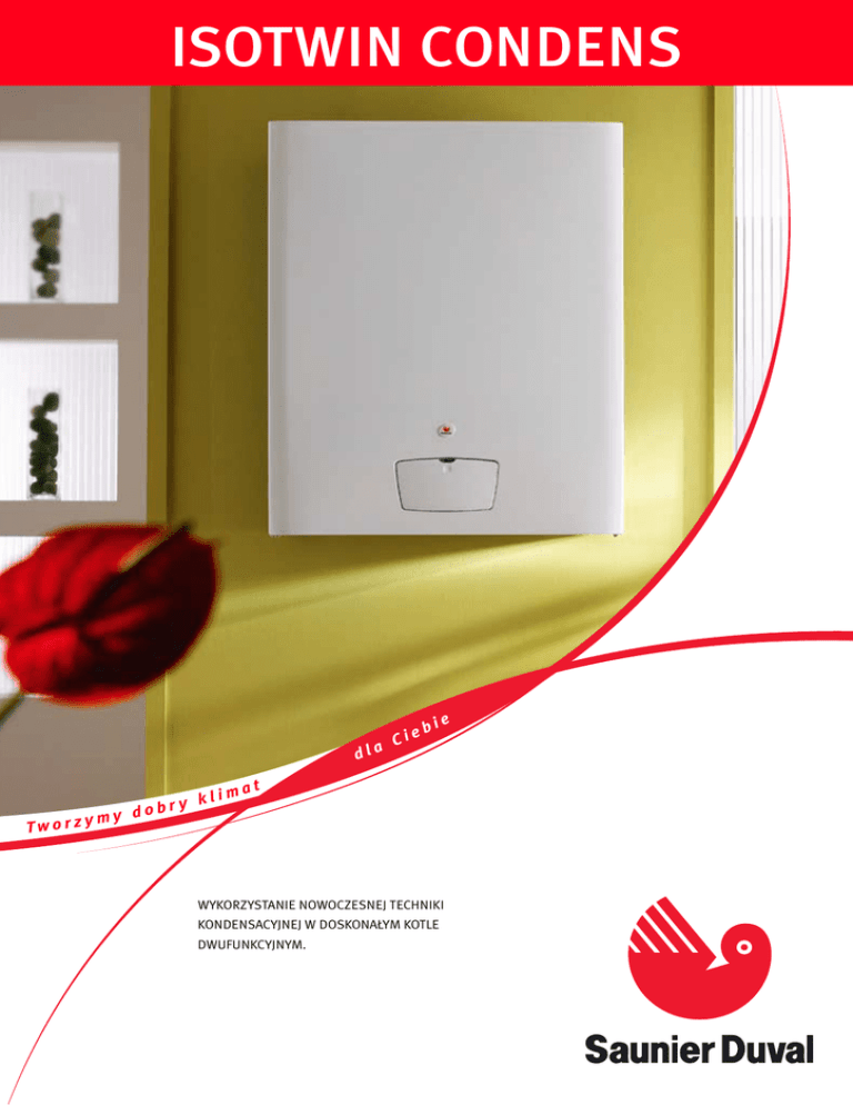 ISOTWIN CONDENS dla Tw o r z y my im y kl dobr b Cie ie at WYKORZYSTANIE NOWOCZESNEJ TECHNIKI KONDENSACYJNEJ W DOSKONA¸YM KOTLE DWUFUNKCYJNYM. ISOTWIN CONDENS F 24/30 E Isotwin Condens wykorzystuje technik´ kondesacyjnà, dzi´ki czemu zu˝ywa znacznie mniej energii w porównaniu z nowoczesnymi kot∏ami konwencjonalnymi. Taka oszcz´dnoÊç gazu w po∏àczeniu z niskà emisjà CO oraz NOx powoduje, ˝e jest przyjazny dla Êrodowiska. Technika kondensacyjna W standardowych kot∏ach woda w wymienniku ciep∏a przejmuje energi´ od spalin, które sch∏adzane sà do okreÊlonej temperatury (np. 120°C). Ta cz´Êç energii nazywana jest w termodynamice „ciep∏em jawnym”. Spaliny zawierajà równie˝ dodatkowe, tzw. „ciep∏o utajone” czyli ciep∏o kondensacji zawarte w parze wodnej, powstajàcej w czasie spalania gazu. Podczas gdy w kot∏ach niekondensacynych energia kondensacji zawarta w parze wodnej uchodzi niewykorzystana wraz ze spalinami do komina, kot∏y kondensacyjne sà w stanie jà wykorzystaç. Jest to zwiàzane z budowà wymiennika ciep∏a, którego powierzchnia wymiany ciep∏a jest znacznie wi´ksza od wymienników w „zwyk∏ych” kot∏ach. Dzi´ki temu w wymienniku ciep∏a po przej´ciu „ciep∏a jawnego” od spalin, ma miejsce dalsze ich sch∏adzanie do temperatury ni˝szej ni˝ temperatura kondensacji pary wodnej. W czasie procesu skraplania pary wodnej uwalniane jest ciep∏o kondensacji i przekazywane wodzie grzewczej w wymienniku ciep∏a. Dzi´ki temu otrzymujemy: • wi´kszà wydajnoÊç • energooszcz´dnoÊç • niskà emisj´ CO Do wspó∏pracy z kot∏ami Isotwin przewidziano termostaty pokojowe Exacontrol. Dzi´ki zastosowaniu termostatów pokojowych mo˝na zoptymalizowaç zu˝ycie gazu, dostosowujàc prac´ urzàdzenia do naszego trybu ˝ycia. Wykorzystujàc Exacontrol 7 radio mamy mo˝liwoÊç swobodnego wyboru miejsca ustawienia termostatu dzi´ki bezprzewodowej (radiowej) komunikacji z kot∏em. EXACONTROL wyÊwietlacz 6 1 5 2 Sonda zewn´trzna reguluje temperatur´ wody c.o. w zale˝noÊci od zmiany temperatury zewn´trznej. Mo˝e pracowaç tylko z instalacjà wyposa˝onà w termostat pokojowy. Sonda powinna byç zamontowana na Êcianie pó∏nocnej lub pó∏nocno-zachodniej. Nale˝y chroniç jà przed nadmiernym dzia∏aniem promieni s∏onecznych. 3 4 1. Aktualna godzina 2. Funkcja c.o. 3. Aktualna temperatura °C 4. Dzienny okres grzania °C 5. Tydzieƒ 6. Wskazanie dnia tygodnia Sk∏ad zestawu: • 1 czujnik • przewód 15 m, 2-˝y∏owy (∏àczàcy czujk´ z p∏ytà g∏ównà) • 1 p∏ytka elektroniczna • 1 wiàzka pod∏àczeniowa Adaptacja pracy uk∏adu odbywa si´ w zale˝noÊci od warunków klimatycznych. Jest mo˝liwoÊç dokonania 11 nastaw za pomocà potencjometru (P1A) znajdujàcego si´ na p∏ytce elektronicznej sondy. Punkt poczàtkowy krzywych (Po) odpowiada temperaturze zasilania c.o. równej 38°C, przy temperaturze zewn´trznej wynoszàcej 18°C. Za pomocà potencjometru P2A znajdujàcego si´ na p∏ytce elektronicznej sondy, mo˝na regulowaç temperatur´ w zakresie +/– 10°C. EXACONTROL 7 radio • Bezprzewodowy tygodniowy termostat pokojowy • 2 programy ustalone + 1 program • modyfikowany + 1 program indywidualny • Tryb wakacyjny • 3 zakresy temperatur • Zasilanie 2 baterie 1,5 V EXTRACONTROL EXTRACONTROL 7 EXTRACONTROL 7 radio Tryb pracy dobowy tygodniowy tygodniowy Programy 1 2 2 TAK TAK TAK Zakresy temperatur 3 3 3 Sterowanie radiowe bezprzewodowe – – TAK Tryb wakacyjny ISOTWIN CONDENS DANE ELEKTRYCZNE Jednostka Isotwin Condens F 24/30 E Napi´cie zasilania Nat´˝enie (V) (A) 230 1,05 Maksymalny pobór mocy Kod bezpieczeƒstwa (W) 241 IPX4D Jednostka Isotwin Condens F 24/30 E (ppm) (%) (ppm) (°C) 86 9,2 23,3 68 Jednostka Isotwin Condens F 24/30 E (m) (m) 3 (m /h) (g/s) od 0,5 do 10 m od 0,5 do 16 m 37 13,2 Jednostka Isotwin Condens F 24/30 E (mm) 3 (m /h) 3 (m /h) 3 (m /h) 3 (m /h) 5,65 2,43 1,59 0,68 3,10 Jednostka Isotwin Condens F 24/30 E (mm) (kg/h) (kg/h) (kg/h) (kg/h) 5,65 1,78 1,16 0,55 2,27 EMISJA SPALIN Sk∏ad spalin przy mocy maksymalnej dla GZ 50 CO CO2 NOx Temperatura spalin przy mocy max. ODPROWADZENIE SPALIN D∏ugoÊç odprowadzenia pozimego (Ø 60/100) D∏ugoÊç odprowadzenia pionowego (Ø 80/125) Wydatek powietrza (1013 mbar – 0°C) Wydatek odprowadzanych spalin Charakterystyka gazu GZ 50 Ø dysza palnika Maksymalne zu˝ycie gazu w funkcji c.o. Zu˝ycie gazu przy mocy 15 kW (ustawienie fabryczne) Minimalne zu˝ycie gazu w funkcji c.o. i c.w.u. Maksymalne zu˝ycie gazu w funkcji c.w.u. PROPAN Ø dysza palnika Maksymalne zu˝ycie gazu w funkcji c.o. Zu˝ycie gazu przy mocy 15 kW (ustawienie fabryczne) Minimalne zu˝ycie gazu w funkcji c.o. i c.w.u. Maksymalne zu˝ycie gazu w funkcji c.w.u. Charakterystyka techniczna CENTRALNE OGRZEWANIE Jednostka Isotwin Condens F 24/30 E Moc SprawnoÊç Temperatura c.o. PojemnoÊç naczynia wzbiorczego Maksymalna pojemnoÊç instalacji c.o. (kW) (%) (°C) (l) (l) 6,8 – 24,6 107 22 – 80 12 255 Maksymalne ciÊnienie zaworu bezpieczeƒstwa (bar) 3 Jednostka Isotwin Condens F 24/30 E (kW) (°C) 6,8 – 28,9 36 – 80 Przep∏yw nominalny dla ∆T 30°C Minimalne ciÊnienie zasilania (l/min) (bar) 18,5 0,7 Maksymalne ciÊnienie zasilania (bar) 10 CIEP¸A WODA U˚YTKOWA Moc Temperatura c.w.u. Saunier Duval Al. Krakowska 106 02-256 Warszawa Tel.: + 48 22 323 01 00 Fax: + 48 22 323 01 13 [email protected] www.saunierduval.pl infolinia: 0 801 806 666