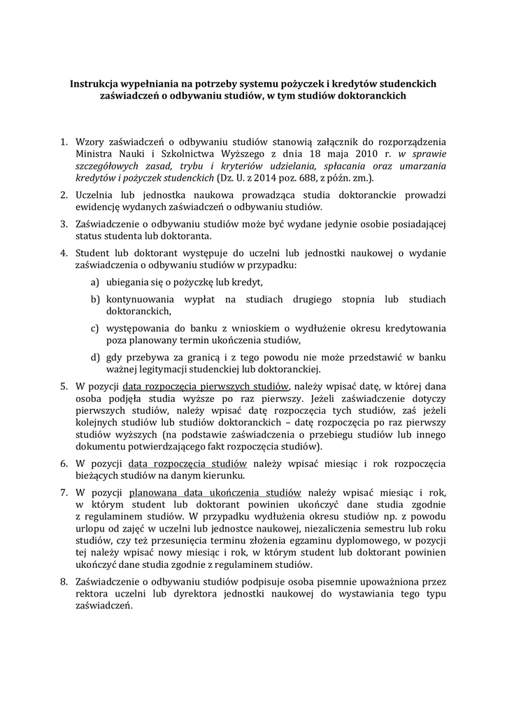 Instrukcja wypełniania na potrzeby systemu pożyczek i kredytów studenckich zaświadczeń o odbywaniu studiów, w tym studiów doktoranckich 1. Wzory zaświadczeń o odbywaniu studiów stanowią załącznik do rozporządzenia Ministra Nauki i Szkolnictwa Wyższego z dnia 18 maja 2010 r. w sprawie szczegółowych zasad, trybu i kryteriów udzielania, spłacania oraz umarzania kredytów i pożyczek studenckich (Dz. U. z 2014 poz. 688, z późn. zm.). 2. Uczelnia lub jednostka naukowa prowadząca studia doktoranckie prowadzi ewidencję wydanych zaświadczeń o odbywaniu studiów. 3. Zaświadczenie o odbywaniu studiów może być wydane jedynie osobie posiadającej status studenta lub doktoranta. 4. Student lub doktorant występuje do uczelni lub jednostki naukowej o wydanie zaświadczenia o odbywaniu studiów w przypadku: a) ubiegania się o pożyczkę lub kredyt, b) kontynuowania doktoranckich, wypłat na studiach drugiego stopnia lub studiach c) występowania do banku z wnioskiem o wydłużenie okresu kredytowania poza planowany termin ukończenia studiów, d) gdy przebywa za granicą i z tego powodu nie może przedstawić w banku ważnej legitymacji studenckiej lub doktoranckiej. 5. W pozycji data rozpoczęcia pierwszych studiów, należy wpisać datę, w której dana osoba podjęła studia wyższe po raz pierwszy. Jeżeli zaświadczenie dotyczy pierwszych studiów, należy wpisać datę rozpoczęcia tych studiów, zaś jeżeli kolejnych studiów lub studiów doktoranckich – datę rozpoczęcia po raz pierwszy studiów wyższych (na podstawie zaświadczenia o przebiegu studiów lub innego dokumentu potwierdzającego fakt rozpoczęcia studiów). 6. W pozycji data rozpoczęcia studiów należy wpisać miesiąc i rok rozpoczęcia bieżących studiów na danym kierunku. 7. W pozycji planowana data ukończenia studiów należy wpisać miesiąc i rok, w którym student lub doktorant powinien ukończyć dane studia zgodnie z regulaminem studiów. W przypadku wydłużenia okresu studiów np. z powodu urlopu od zajęć w uczelni lub jednostce naukowej, niezaliczenia semestru lub roku studiów, czy też przesunięcia terminu złożenia egzaminu dyplomowego, w pozycji tej należy wpisać nowy miesiąc i rok, w którym student lub doktorant powinien ukończyć dane studia zgodnie z regulaminem studiów. 8. Zaświadczenie o odbywaniu studiów podpisuje osoba pisemnie upoważniona przez rektora uczelni lub dyrektora jednostki naukowej do wystawiania tego typu zaświadczeń.