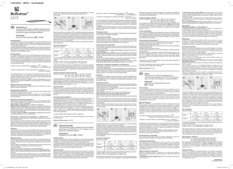 # 485 (2010) - DXO-LI - Frau Veselovski Reflotron GGT ® ES Finalidad de uso Test para la determinación cuantitativa de gamma-glutamiltransferasa (γ-GT; GGT; EC 2.3.2.2) en sangre, suero o plasma con equipos de medición Reflotron. Presentación Envase de 30 portarreactivos, 5() 1 0745081 Aspectos clínicos La γ-glutamiltransferasa sirve para el diagnóstico y la evaluación del desarrollo de enfermedades del hígado y de las vías biliares. La actividad enzimática, frecuentemente el único parámetro elevado, es uno de los indicadores más sensibles de una enfermedad hepática-biliar. La gamma-glutamiltransferasa es utilizada además como screening-test sensitivo para la detección de un alcoholismo oculto. En pacientes bajo medicación prolongada de p.ej. fenobarbital y fenitoína también se encuentran frecuentemente actividades de GGT elevadas en suero. Principio del test1 En el presente Reflotron GGT Test la muestra aplicada fluye a través de la zona de aplicación, realizándose la separación de los eritrocitos, al interior de la zona reactiva. A causa del efecto catalítico de la γ-GT, la γ-glutamil-3-carboxi-1,4fenilendiamina reacciona con glicilglicina formando glutamilglicilglicina y 3-carboxi1,4-fenilendiamina+γ-glutamilglicilglicina, la cual en una reacción secundaria de potasio hexacianoferrato(III) es oxidado en presencia de ácido N-metilantranílico en un colorante verde-azul: γ-GT γ-gutamil-3-carboxi-1,4-fenilendiamina + glicilglicina õõõú 3-carboxi1,4-fenilendiamina + γ-glutamilglicilglicina 3-carboxi-1,4-fenilendiamina + ácido 2-metilantranílico + 6 [Fe(CN) 6]3- õõõú colorante + 6 [Fe(CN) 6]4A una temperatura de 37 °C se observa en una medición cinética a 642 nm la formación del colorante como medida de la actividad enzimática de la γ-GT y se visualiza el resultado al cabo de aprox. 120 segundos según el ajuste del aparato para 37°C, 30°C resp. 25°C en U/l o µkat/l. Componentes por zona reactiva: g-glutamil-3-carboxi-1,4-fenilendiamina: 15,6 µg; glicilglicina: 180 µg; ácido N-metilantranílico: 39 µg; K3[Fe(CN) 6]: 72 µg; K4[Fe(CN) 6]: 108 µg; tampón. Medidas de precaución y advertencias Diagnóstico in vitro. Observar las medidas de precaución habituales en la manipulación de reactivos de laboratorio. Almacenamiento y estabilidad Estabilidad y almacenamiento a +2°C - +30°C hasta la fecha de caducidad indicada en el estuche, respectivamente en el tubo. Después de la extracción de una tira reactiva se debe a cerrar el tubo inmediatamente para evitar que la exposición al polvo, la humedad, etc., vuelvan inutilizables a las tiras reactivas. Obtención de las muestras y preparación2,3 Sangre capilar, sangre completa extraída con los tubos convencionales de extracción de muestras estándar, el suero obtenido de ella; sangre con EDTA y heparinizada o plasma con EDTA y heparinizado. Sangre capilar o venosa fresca debe ser utilizada inmediatamente. Sangre con EDTA o heparinizada conservada en un recipiente cerrado debe ser utilizada en el plazo de 8 horas. Después de la sedimentación de las fracciones celulares se puede utilizar el plasma sobrenadante si se evita agitar la muestra. Al utilizar pipetas capilares o recipientes desechables recubiertos se deben observar las indicaciones del fabricante. Para suero y plasma con EDTA y heparinizado, la estabilidad de la muestra en un recipiente cerrado a +4°C - +25°C es de 7 días. Observaciones; restricciones del procedimiento – interferencias2,4,5 El paracetamol ya puede conducir en concentración terapéutica a un descenso de los valores de γ-GT. No se comprobó una influencia ejercida sobre el resultado de los tests sobre las siguientes sustancias en los intervalos de concentración examinados (criterio: recuperación ± 10 % del valor inicial): hematócrito hasta el 55 %, hemólisis hasta el 1 %, lipemia, ácido ascórbico, bilirrubina, creatinina, cisteína, glutatión, glucosa, urea, lactato así como 26 principios activos medicamentosos más examinados. Calibración La determinación de la curva funcional del Reflotron GGT para la conversión de valores de reflexión en concentraciones se realiza de forma específica para el lote utilizando el método γ-GT liquid, IFCC de Roche Diagnostics a 37°C. Los datos son transmitidos automáticamente al aparato durante la realización del test gracias a la információn contenida en la banda magnética del portarreactivos. Realización del test Material necesario adicionalmente (no suministrado con el equipo): Reflotron Instrument; Reflotron Pipette y puntas de pipetas, respectivamente pipeta capilar, capilares, materiales de control, equipo normal de laboratorio para la extracción de sangre. Antes de realizar la determinación, leer atentamente las instrucciones para el uso del equipo Reflotron y familiarizarse con la función del aparato. Conectar el aparato. Al aparecer el mensaje „LISTO”, extraer un portarreactivos del tubo. Volver a cerrar el tubo inmediatamente con el tapón de agente desecante. Retirar la lámina de protección del portarreactivos (a), evitando doblar el portarreactivos. Absorber el material de muestra sin formar burbujas, p.ej. con una Reflotron Pipette, y aplicarlo en localización central sobre la parte roja de la zona de aplicación (xx) – sin tocar ésta con la punta de la pipeta – en forma de gota (b); volumen de aplicación necesario: muestra de 30 µl (ver la ilustración). En el plazo de 15 segundos introducir el portarreactivos horizontalmente, con la tapa abierta, en la ranura provista hasta que encaje perceptiblemente (c). Cerrar la tapa. (b) (a) (c) γ-GT γ-glutamil–3–carboxi-1,4–fenilenodiamina + glicilglicina õõõú 3-carboxi1,4 fenilenodiamina + γ-glutamilglicilglicina 3–carboxi-1,4–fenilenodiamina +2 ácido metilantranílico + 6 [Fe(CN) 6]3- õõú corante + 6 [Fe(CN) 6]4A uma temperatura de 37°C a formação do corante é medido cineticamente a 642 nm como uma 