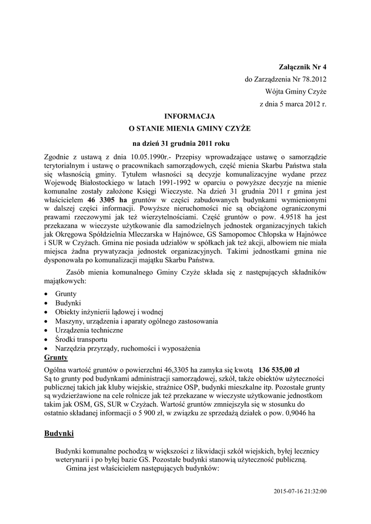 informacja o stanie mienia komunalnego gminy czyże na dzień 31
