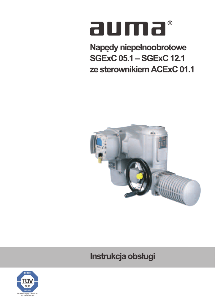 Napêdy niepe³noobrotowe SGExC 05.1 – SGExC 12.1 ze sterownikiem ACExC 01.1 Instrukcja obs³ugi Nr rejestracyjny certyfikatu 12 100/104 4269 Napêdy niepe³noobrotowe SGExC 05.1 – SGExC 12.1 AUMATIC ACExC 01.1 Wa¿noœæ tej instrukcji: Instrukcja obs³ugi Niniejsza instrukcja obowi¹zuje dla napêdów niepe³noobrotowych z zabezpieczeniem przeciwwybuchowym typu SGExC 05.1 – SGExC 12.1, po³¹czonych ze sterownikiem AUMATIC ACExC 01.1. Instrukcja ta wa¿na jest tylko dla „zamykania prawoskrêtnego”, to znaczy napêdzany wa³ obraca siê zgodnie z kierunkiem ruchu wskazówek zegara, aby zamkn¹æ armaturê. Prosimy uwzglêdniæ, ¿e ze wzglêdu na ochronê patentow¹ sterownik AUMATIC ze z³¹czem na podczerwieñ na panelu sterowania lokalnego nie mo¿e byæ dostarczany do Anglii i Japonii. Wersja bez z³¹cza na podczerwieñ nie narusza ¿adnych praw patentowych i mo¿e byæ dostarczana do obydwu krajów. Inhaltsverzeichnis 1. Wskazówki bezpieczeñstwa . . . . . . . . . . . . . . 1.1 Zakres zastosowania . . . . . . . . . . . . . . . . 1.2 Uruchamianie (pod³¹czanie zasilania elektrycznego) . 1.3 Konserwacja . . . . . . . . . . . . . . . . . . . . 1.4 Wskazówki i ostrze¿enia . . . . . . . . . . . . . . 1.5 Pozosta³e informacje . . . . . . . . . . . . . . . . . . . . . . . . . . . . . . . . . . . . . . . . . . . . . . . . . . . . . . . . . . . . . . . . . . . . . . . . . . . . . . . . . . . . . . . . . . . . . . . . . . . . . . . . . . . . . . . . . . . . . . . . . . . . . . . . . . . . . . . . . . . . . . . . . . . . . . . . . . . . . . . . . . . . . . . . . . . . . . . . . . 4 4 4 4 4 4 2. Krótki opis techniczny . . . . . . . . . . . . . . . . . . . . . . . . . . . . . . . . . . . . . . . . . . . . 4 3. Dane techniczne . . . . . . . . . . . . . . . . . . . . . 3.1 Napêd niepe³noobrotowy SGExC 05.1 – SGExC 12.1 . 3.2 Sterownik AUMATIC . . . . . . . . . . . . . . . . . 3.3 Wersje oprogramowania AUMATIC . . . . . . . . . . 4. Transport i przechowywanie . . . . . . . . . . . . . . . 5. Monta¿ pokrêt³a rêcznego z uchwytem/ Obs³uga rêczna 5.1 Monta¿ pokrêt³a rêcznego z uchwytem . . . . . . . . 5.2 Obs³uga rêczna . . . . . . . . . . . . . . . . . . . . . . . . . . . . . . . . . . . . . . . . . . . . . . . . . . . . . . . . . . . . . . . . . . . . . . . . . . . . . . . . . . . . . . . . . . . . . . . . . . . . . . . . . . . . . . . . . . . . . . . . . . . . . . . . . . . . . . . . . . . . . . . . . . . . . . . . . . . . . . . . . . . . . . . . . . . . . . . . . . . . . . . . . . . . . . . . . . . . . . . . . . . . . . . . . . . . . . . . . . . . . . . . . . . 5 5 7 9 9 9 9 9 6. Monta¿ na armaturze . . . . . . . . . . . . . . . . . . . . . . . . . . . . . . . . . . . . . . . . . . . . 10 7. Ustawianie zderzaków krañcowych i wy³¹cznika drogowegodla napêdów niepe³noobrotowych na klapach11 7.1 Ustawianie zderzaka krañcowego zamykania CLOSE . . . . . . . . . . . . . . . . . . . . . . . . . . 11 7.2 Ustawianie wy³¹cznika drogowego zamykania CLOSE . . . . . . . . . . . . . . . . . . . . . . . . . . 11 7.3 Ustawianie zderzaka krañcowego otwierania OPEN . . . . . . . . . . . . . . . . . . . . . . . . . . . 12 7.4 Ustawianie wy³¹cznika drogowego otwierania OPEN . . . . . . . . . . . . . . . . . . . . . . . . . . . 12 8. Ustawianie zderzaków krañcowych i wy³¹cznika drogowego dla napêdów niepe³noobrotowych na zaworach kulkowych . . . . . . . . . . . . . . . . . . . . . . . . . . . . . . . . . . . . . 8.1 Ustawianie zderzaka krañcowego otwierania OPEN . . . . . . . . . . . . . . . . . . . . . . 8.2 Ustawianie wy³¹cznika drogowego otwierania OPEN . . . . . . . . . . . . . . . . . . . . . . 8.3 Ustawianie zderzaka krañcowego zamykania CLOSE . . . . . . . . . . . . . . . . . . . . . 8.4 Ustawianie wy³¹cznika drogowego zamykania CLOSE . . . . . . . . . . . . . . . . . . . . . 9. Ustawianie k¹ta wychylenia . . . . . . . . . . . . . . . . . . . . . . . . . . . . . . . . . . . 9.1 Zwiêkszanie k¹ta wychylenia . . . . . . . . . . . . . . . . . . . . . . . . . . . . . . . . . 9.2 Zmniejszanie k¹ta wychylenia . . . . . . . . . . . . . . . . . . . . . . . . . . . . . . . . . 10. Ustawianie wy³¹cznika momentowego . . . . . . . . . . . . . . . . . . . . . . . . . . . . . . 10.1 Ustawianie . . . . . . . . . . . . . . . . . . . . . . . . . . . . . . . . . . . . . . . . . . 10.2 Kontrola wy³¹cznika momentowego . . . . . . . . . . . . . . . . . . . . . . . . . . . . . . 11. Pod³¹czanie do zasilania elektrycznego . . . . . . . . . . . . . . . . . . . . . . . . . . . . . 11.1 Pod³¹czanie za pomoc¹ wtyczki przeciwwybuchowej Ex z p³ytk¹ zaciskow¹ . . . . . . . . . . . 11.2 Listwa po³¹czeniowa skrêcana Ex . . . . . . . . . . . . . . . . . . . . . . . . . . . . . . . 11.3 Grza³ka . . . . . . . . . . . . . . . . . . . . . . . . . . . . . . . . . . . . . . . . . . . . 11.4 PóŸniejszy monta¿ sterownika . . . . . . . . . . . . . . . . . . . . . . . . . . . . . . . . . 11.5 Rodzaj wy³¹czenia . . . . . . . . . . . . . . . . . . . . . . . . . . . . . . . . . . . . . . 11.6 Zak³adanie pokrywy wtyczki . . . . . . . . . . . . . . . . . . . . . . . . . . . . . . . . . . 12. Rozruch próbny . . . . . . . . . . . . . . . . . . . . . . . . . . . . . . . . . . . . . . . . . 12.1 Kontrola kierunku obrotów w silnikach indukcyjnych trójfazowych . . . . . . . . . . . . . . . . 12.2 Sprawdziæ, czy wybrany wy³¹cznik jest w³aœciwie ustawiony. . . . . . . . . . . . . . . . . . . 12.3 Regulacja czasu pracy . . . . . . . . . . . . . . . . . . . . . . . . . . . . . . . . . . . . 13. Mechaniczny wskaŸnik po³o¿enia . . . . . . . . . . . . . . . . . . . . . . . . . . . . . . . . 14. Ustawianie potencjometru (opcja) . . . . . . . . . . . . . . . . . . . . . . . . . . . . . . . . 15. Elektroniczny Ustawianie elektronicznego nadajnika sygna³u po³o¿enia RWG (opcja) . . . . . 15.1 Ustawianie systemu 4-przewodowego 4 – 20 mA. . . . . . . . . . . . . . . . . . . . . .