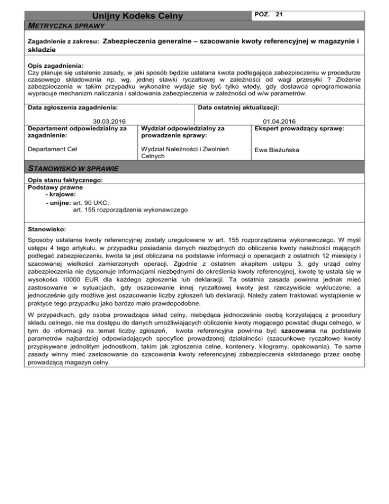 POZ. 21 Unijny Kodeks Celny METRYCZKA SPRAWY Zagadnienie z zakresu: Zabezpieczenia generalne – szacowanie kwoty referencyjnej w magazynie i składzie Opis zagadnienia: Czy planuje się ustalenie zasady, w jaki sposób będzie ustalana kwota podlegająca zabezpieczeniu w procedurze czasowego składowania np. wg. jednej stawki ryczałtowej w zależności od wagi przesyłki ? Złożenie zabezpieczenia w takim przypadku wykonalne wydaje się być tylko wtedy, gdy dostawca oprogramowania wypracuje mechanizm naliczania i saldowania zabezpieczenia w zależności od w/w parametrów. Data zgłoszenia zagadnienia: 30.03.2016 Departament odpowiedzialny za zagadnienie: Departament Ceł Data ostatniej aktualizacji: Wydział odpowiedzialny za prowadzenie sprawy: Wydział Należności i Zwolnień Celnych 01.04.2016 Ekspert prowadzący sprawę: Ewa Bieżuńska STANOWISKO W SPRAWIE Opis stanu faktycznego: Podstawy prawne - krajowe: - unijne: art. 90 UKC, art. 155 rozporządzenia wykonawczego Stanowisko: Sposoby ustalania kwoty referencyjnej zostały uregulowane w art. 155 rozporządzenia wykonawczego. W myśl ustępu 4 tego artykułu, w przypadku posiadania danych niezbędnych do obliczenia kwoty należności mających podlegać zabezpieczeniu, kwota ta jest obliczana na podstawie informacji o operacjach z ostatnich 12 miesięcy i szacowanej wielkości zamierzonych operacji. Zgodnie z ostatnim akapitem ustępu 3, gdy urząd celny zabezpieczenia nie dysponuje informacjami niezbędnymi do określenia kwoty referencyjnej, kwotę tę ustala się w wysokości 10000 EUR dla każdego zgłoszenia lub deklaracji. Ta ostatnia zasada powinna jednak mieć zastosowanie w sytuacjach, gdy oszacowanie innej ryczałtowej kwoty jest rzeczywiście wykluczone, a jednocześnie gdy możliwe jest oszacowanie liczby zgłoszeń lub deklaracji. Należy zatem traktować wystąpienie w praktyce tego przypadku jako bardzo mało prawdopodobne. W przypadkach, gdy osoba prowadząca skład celny, niebędąca jednocześnie osobą korzystającą z procedury składu celnego, nie ma dostępu do danych umożliwiających obliczenie kwoty mogącego powstać długu celnego, w tym do informacji na temat liczby zgłoszeń, kwota referencyjna powinna być szacowana na podstawie parametrów najbardziej odpowiadających specyfice prowadzonej działalności (szacunkowe ryczałtowe kwoty przypisywane jednolitym jednostkom, takim jak zgłoszenia celne, kontenery, kilogramy, opakowania). Te same zasady winny mieć zastosowanie do szacowania kwoty referencyjnej zabezpieczenia składanego przez osobę prowadzącą magazyn celny.