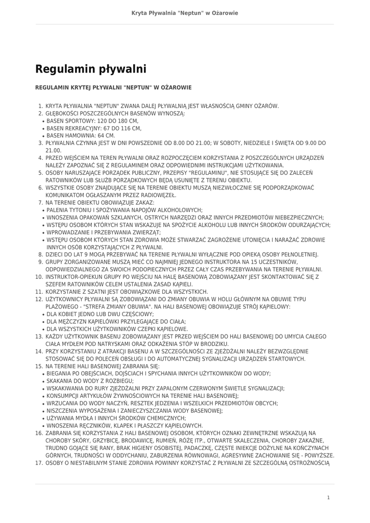Regulamin pływalni - Kryta Pływalnia Neptun w Ożarowie