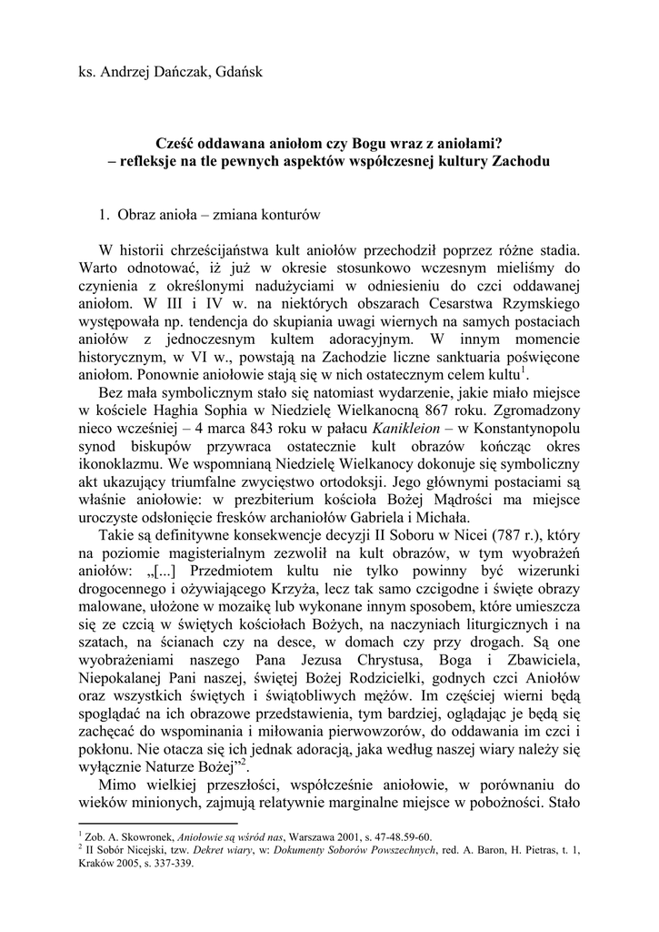 ks. Andrzej Dańczak, Gdańsk Cześć oddawana aniołom czy Bogu wraz z aniołami? – refleksje na tle pewnych aspektów współczesnej kultury Zachodu 1. Obraz anioła – zmiana konturów W historii chrześcijaństwa kult aniołów przechodził poprzez różne stadia. Warto odnotować, iż już w okresie stosunkowo wczesnym mieliśmy do czynienia z określonymi nadużyciami w odniesieniu do czci oddawanej aniołom. W III i IV w. na niektórych obszarach Cesarstwa Rzymskiego występowała np. tendencja do skupiania uwagi wiernych na samych postaciach aniołów z jednoczesnym kultem adoracyjnym. W innym momencie historycznym, w VI w., powstają na Zachodzie liczne sanktuaria poświęcone aniołom. Ponownie aniołowie stają się w nich ostatecznym celem kultu1. Bez mała symbolicznym stało się natomiast wydarzenie, jakie miało miejsce w kościele Haghia Sophia w Niedzielę Wielkanocną 867 roku. Zgromadzony nieco wcześniej – 4 marca 843 roku w pałacu Kanikleion – w Konstantynopolu synod biskupów przywraca ostatecznie kult obrazów kończąc okres ikonoklazmu. We wspomnianą Niedzielę Wielkanocy dokonuje się symboliczny akt ukazujący triumfalne zwycięstwo ortodoksji. Jego głównymi postaciami są właśnie aniołowie: w prezbiterium kościoła Bożej Mądrości ma miejsce uroczyste odsłonięcie fresków archaniołów Gabriela i Michała. Takie są definitywne konsekwencje decyzji II Soboru w Nicei (787 r.), który na poziomie magisterialnym zezwolił na kult obrazów, w tym wyobrażeń aniołów: „[...] Przedmiotem kultu nie tylko powinny być wizerunki drogocennego i ożywiającego Krzyża, lecz tak samo czcigodne i święte obrazy malowane, ułożone w mozaikę lub wykonane innym sposobem, które umieszcza się ze czcią w świętych kościołach Bożych, na naczyniach liturgicznych i na szatach, na ścianach czy na desce, w domach czy przy drogach. Są one wyobrażeniami naszego Pana Jezusa Chrystusa, Boga i Zbawiciela, Niepokalanej Pani naszej, świętej Bożej Rodzicielki, godnych czci Aniołów oraz wszystkich świętych i świątobliwych mężów. Im częściej wierni będą spoglądać na ich obrazowe przedstawienia, tym bardziej, oglądając je będą się zachęcać do wspominania i miłowania pierwowzorów, do oddawania im czci i pokłonu. Nie otacza się ich jednak adoracją, jaka według naszej wiary należy się wyłącznie Naturze Bożej”2. Mimo wielkiej przeszłości, współcześnie aniołowie, w porównaniu do wieków minionych, zajmują relatywnie marginalne miejsce w pobożności. Stało 1 Zob. A. Skowronek, Aniołowie są wśród nas, Warszawa 2001, s. 47-48.59-60. II Sobór Nicejski, tzw. Dekret wiary, w: Dokumenty Soborów Powszechnych, red. A. Baron, H. Pietras, t. 1, Kraków 2005, s. 337-339. 2 się to m. in. za przyczyną debaty nad rolą i miejscem aniołów w teologii, jaka miała miejsce w XX w. Teologia katolicka podjęła kwestie związane z istnieniem aniołów podczas wielkiej dyskusji lat 60. i 70. minionego stulecia. Dla wielu postacie aniołów, także na poziomie tekstów biblijnych, stały się wówczas tylko symbolami, zaś sama ich obecność w źródłach pierwszych wieków zapożyczeniem wynikającym z kulturowych uwarunkowań starożytnego Bliskiego Wschodu. Wydawały się anioły także stanowić przeszkodę na drodze możliwie racjonalnego przedstawiania chrześcijaństwa, stanowiąc baśniową ideę w oczach współczesnego człowieka – adresata myśli chrześcijańskiej3. Przełom hermeneutyczny i łącząca się z nim demitologizacja na polu teologii postawiły problem odniesienia tematu aniołów do depozytu wiary, przy jednoczesnym bardzo częstym stwierdzeniu, iż eliminacja aniołów pozostawia ten depozyt nienaruszonym. Próbowano także wyjaśnić przyczynę obecności aniołów w Objawieniu i późniejszej teologii jako rezultatu stosowania kategorii przestrzennych, w jakich wcześniej rozumiano relacje miedzy Bogiem a światem i człowiekiem. Źródłem mówienia o aniołach miałaby być idea przebycia pewnej przestrzeni, odległości. Aniołowie w tym kontekście mieliby być symbolami mówienia o przekazie pochodzącym od Boga, Jego miłości itp. Dzisiaj jednak sytuacja dość nieoczekiwanie zmieniła się. Regres obecności aniołów należy do przeszłości. Ale stało się to bez szczególnego udziału chrześcijaństwa. Racjonalna brzytwa współczesnej kultury zadziałała inaczej niż wcześniej myślano. Wprawdzie proces sekularyzacji postąpił szybciej niż wielu przewidywało, ale jednocześnie nastąpiły w nim nieoczekiwane „nieregularności”. Współczesna zsekularyzowana kultura Zachodu praktycznie wyeliminowała elementy i motywy religijne ze swojego krajobrazu, lecz właśnie jedynym chyba wyjątkiem są postacie aniołów. Tutaj nie tylko nie mamy do czynienia ze zmierzchem, ale, wręcz przeciwnie, z prawdziwym renesansem ich obecności. Jest to widoczne w bardzo wielu kontekstach. Aniołowie są umieszczani np. na niezliczonych kartkach z życzeniami, stali się symbolem świąt Bożego Narodzenia, zajmują poczesne miejsce w domach jako figury ozdobne a także poza nim np. w ogrodach. Mamy do czynienia z prawdziwą ich obfitością w literaturze i filmie. Stają się protagonistami spotów reklamowych; motyw aniołów pojawia się na T-shirtach itp. Są oponadto obecni powszechnie w muzyce pop. Jest paradoksem, iż owa „kulturowa obecność” ma miejsce dzięki przede wszystkim popularnej kulturze amerykańskiej o charakterze protestanckim. Zastanawia funkcja, jaką przybrały postacie aniołów dla współczesnego człowieka. Z pewnością nie jest to już funkcja, jaką odgrywały one w systemie chrześcijańskim. Pozostaje otwartym pytanie, czy stanowią one pewnego rodzaju odesłanie. Jeśli tak, to dokąd? do czego? Z pewnością czasami nie jest 3 Jako charakterystyczną można tutaj wspomnieć książkę C. Westermanna, Gottes Engel brauchen keine Flűgel, Stuttgart 1978. to