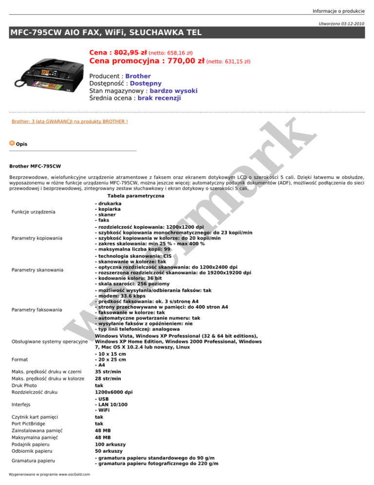 Informacje o produkcie Utworzono 03-12-2010 MFC-795CW AIO FAX, WiFi, SŁUCHAWKA TEL Cena : 802,95 zł (netto: 658,16 zł) Cena promocyjna : 770,00 zł (netto: 631,15 zł) Producent : Brother Dostępność : Dostępny Stan magazynowy : bardzo wysoki Średnia ocena : brak recenzji Opis Brother MFC-795CW er m ar k Brother: 3 lata GWARANCJI na produkty BROTHER ! Bezprzewodowe, wielofunkcyjne urządzenie atramentowe z faksem oraz ekranem dotykowym LCD o szerokości 5 cali. Dzięki łatwemu w obsłudze, wyposażonemu w różne funkcje urządzeniu MFC-795CW, można jeszcze więcej: automatyczny podajnik dokumentów (ADF), możliwość podłączenia do sieci przewodowej i bezprzewodowej, zintegrowany zestaw słuchawkowy i ekran dotykowy o szerokości 5 cali. Tabela parametryczna Funkcje urządzenia Parametry kopiowania at Parametry skanowania - drukarka - kopiarka - skaner - faks - rozdzielczość kopiowania: 1200x1200 dpi - szybkość kopiowania monochromatycznego: do 23 kopii/min - szybkość kopiowania w kolorze: do 20 kopii/min - zakres skalowania: min 25 % - max 400 % - maksymalna liczba kopii: 99 - technologia skanowania: CIS - skanowanie w kolorze: tak - optyczna rozdzielczość skanowania: do 1200x2400 dpi - rozszerzona rozdzielczość skanowania: do 19200x19200 dpi - kodowanie koloru: 36 bit - skala szarości: 256 poziomy - możliwość wysyłania/odbierania faksów: tak - modem: 33.6 kbps - prędkość faksowania: ok. 3 s/stronę A4 - strony przechowywane w pamięci: do 400 stron A4 - faksowanie w kolorze: tak - automatyczne powtarzanie numeru: tak - wysyłanie faksów z opóźnieniem: nie - typ linii telefoniczej: analogowa Windows Vista, Windows XP Professional (32 & 64 bit editions), Windows XP Home Edition, Windows 2000 Professional, Windows 7, Mac OS X 10.2.4 lub nowszy, Linux - 10 x 15 cm - 20 x 25 cm - A4 35 str/min 28 str/min tak 1200x6000 dpi - USB - LAN 10/100 - WiFi tak tak 48 MB 48 MB 100 arkuszy 50 arkuszy - gramatura papieru standardowego do 90 g/m - gramatura papieru fotograficznego do 220 g/m w Parametry faksowania Obsługiwane systemy operacyjne Format Maks. prędkość druku w czerni Maks. prędkość druku w kolorze Druk Photo Rozdzielczość druku Interfejs Czytnik kart pamięci Port PictBridge Zainstalowana pamięć Maksymalna pamięć Podajnik papieru Odbiornik papieru Gramatura papieru Wygenerowano w programie www.oscGold.com er m ar k Obsługiwane rodzaje nośników: - papier zwykły - papier błyszczący - folie Obsługiwane formaty nośników: - A4 - A5 - A6 - EXE - LTR - LGL Nośniki - JISB5 - Photo 10 x 15cm - 89 x 127mm - 127 x 178mm - Postcard 100 x 148mm - 148 x 200mm - Index card 127 x 203mm - C5 Envelopes - COM 10 - DL - JE4 - Envelope Druk dwustronny ręczny Wymiary 460 x 375 x 180 mm Waga 8.7 kg Informacje o gwarancji 24 miesiące Materiały eksploatacyjne oryginalne LC-1100BK, LC-1100C, LC-1100M, LC-1100Y w at 3 lata gwarancji