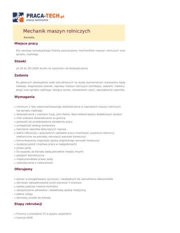 Mechanik maszyn rolniczych Kanada, Miejsce pracy Dla naszego kanadyjskiego Klienta poszukujemy mechaników maszyn rolniczych oraz sprzętu ciężkiego. Stawki od 30 do 39 CAD/h brutto (w zależności od doświadczenia) Zadania Do głównych obowiązków osób zatrudnionych na wyżej wymienionym stanowisku będą należały: diagnostyka usterek, naprawy maszyn rolniczych (kombajny, sadzarki, traktory, pługi) oraz sprzętu ciężkiego, bieżący serwis, zamawianie części, sporządzanie raportów. Wymagania ● ● ● ● ● ● ● ● ● ● ● ● ● ● minimum 2 lata udokumentowanego doświadczenia w naprawach maszyn rolniczych lub sprzętu ciężkiego doświadczenie z markami Case, John Deere, New Holland będzie dodatkowym atutem mile widziane doświadczenie za granicą gotowość do przedstawienia świadectw pracy umiejętność obsługi komputera tworzenie raportów dotyczących napraw dobre referencje z poprzednich zakładów pracy (możliwość uzyskania referencji telefonicznie na potrzeby rekrutacji) warunek konieczny! komunikatywna znajomość języka angielskiego warunek konieczny! dyspozycyjność (możliwa praca w nadgodzinach) prawo jazdy Do wyjazdu do Kanady będą potrzebne między innymi: paszport biometryczny międzynarodowe prawo jazdy zaświadczenie o niekaralności Oferujemy ● ● ● ● ● ● pomoc w przygotowaniu życiorysu i niezbędnych do zatrudnienia dokumentów darmowe zakwaterowanie przez pierwsze 3 miesiące opiekę podczas trwania kontraktu ubezpieczenie zdrowotne i dodatkową opiekę medyczną płatne urlopy darmowy przelot do Kanady Etapy rekrutacji ● ● Prosimy o przesłanie CV w języku angielskim licencja 4440 Nazwa firmy: LSJ Branża:Przemysł motoryzacyjny Lokalizacja:Mechanik Zamieszczono:2012-07-03 00:00:00 Oferta ważna do:2012-10-03 00:00:00 Ilość wyświetleń:985