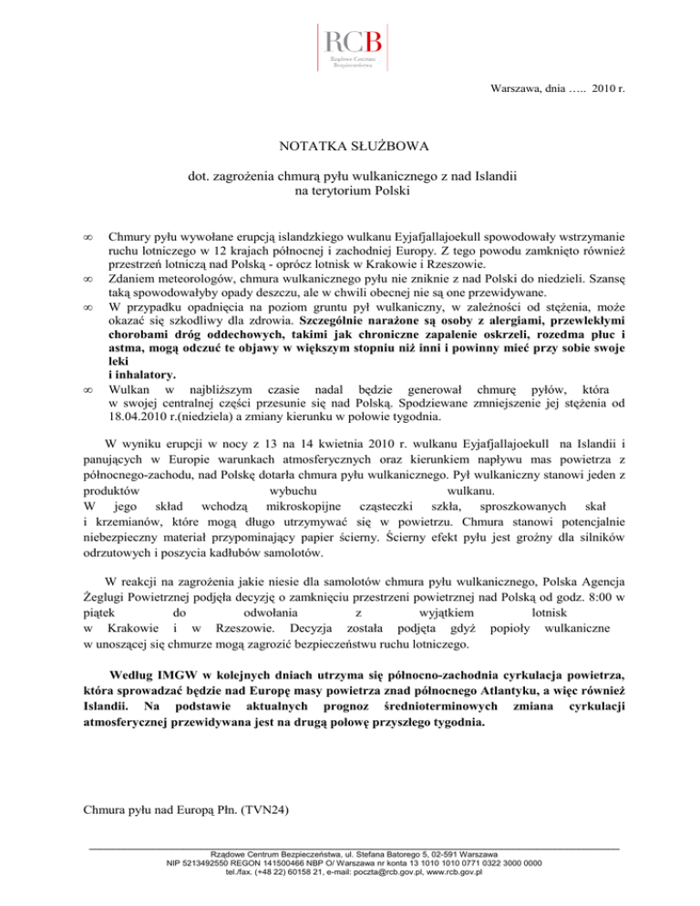 NOTATKA SŁUŻBOWA dot. zagrożenia chmurą pyłu