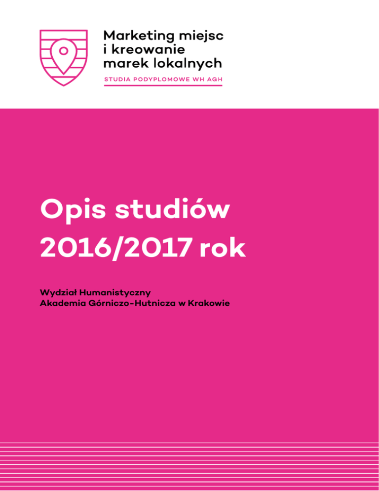 Opis studiów 2016/2017 rok Wydział Humanistyczny Akademia Górniczo-Hutnicza w Krakowie Czas trwania: 180 godzin, 2 semestry (od X 2016 r. do VI 2017 r.) Maksymalna liczba miejsc: 30 Opłaty: Całość studiów: 4 600 zł (płatność możliwa w dwóch ratach, po 2300 zł) Termin zgłoszeń: do 30.09.2016 r. lub do wyczerpania limitu miejsc Adres www kierunku: www.marketingmiejsc.pledu.pl Strona na Facebooku kierunku: www.facebook.com/studiamarketingmiejsc W zrost konkurencyjności miejsc stawia przed społecznościami wiele wyzwań gospodarczych, kulturowych i społecznych. Dostrzegamy coraz ostrzejszą konkurencję o zasoby: o tworzenie miejsc przyjaznych dla inwestycji zagranicznych biznesu, dla turystów, a także dla samych mieszkańców. By sprostać wymogom konkurencji i przyciągnąć pożądane grupy docelowe konieczne jest sięgnięcie do najnowszych praktyk z zakresu marketingu miejsca. Celem studiów podyplomowych Marketing miejsc i kreowanie lokalnych marek jest zaprezentowanie nowego podejścia do marketingu miejsc i poszukiwania unikatowych wymiarów tego rodzaju praktyk. Czerpiąc z doświadczeń w marketingu organizacji non-profit, marketingu społecznego i marketingu terytorialnego oraz w oparciu o nowe możliwości promocyjne oferowane przez nowe technologie i media cyfrowe, stworzyliśmy interdyscyplinarny program studiów. Nasz program nastawiony jest na praktykę i konkretne zagadnienia. Współpracują z nami czołowi specjaliści i dydaktycy w kraju, którzy pokażą Ci, jak - dzięki konkretnym kanałom komunikacji - zarządzać marką miejsca i sprawić, by wszyscy odbiorcy o niej wiedzieli. Misją studiów jest wykształcenie specjalistów zarządzania markami miejsc i lokalnymi produktami oraz ekspertów w zakresie budowy wizerunku miejsc oraz silnych produktów lokalnych i regionalnych. W ramach studiów podyplomowych koncentrujemy się na działaniach związanych z: • • kreowaniem marki miejsca i produktu, wskazując m.in., na co-branding produktu i miejsca, zarządzaniem marką miejsca - skupiamy się na procesach tworzenia rozpoznawalnej tożsamości miejsca i późniejszego wykorzystania tej tożsamości do innych procesów: finansowych, społecznych (zmiany w zachowaniu użytkowników i mieszkańców) oraz generowania kapitału społeczno – politycznego. Proponujemy całościowe podejście do budowy marki miejsca. Szczególny nacisk położony zostanie na przekazanie konkretnej, aktualnej wiedzy, pozwalającej rozwinąć kluczowe umiejętności u osoby odpowiedzialnej za marketing w administracji publicznej, agencji kreatywnej, czy zakorzenionym lokalnie biznesie. Mamy świadomość, że stworzenie kompleksowej „opowieści” o miejscu wymaga dokładnej analizy, którego bazą jest łączenie gamy produktów i elementów z różnych dziedzin, począwszy od wykreowania lokalnego produktu, a kończąc na jego promocji. Program studiów (180 godzin): Moduł 1: Badania i strategia • Strategia marketingowa w marketingu miejsc - Adam Mikołajczyk • Marketing miejsc – wprowadzenie - dr Jacek Pogorzelski • Konsultacje społeczne w praktyce - Ewelina Romuzga • Precyzyjna segmentacja kryterium skutecznej strategii marketingowej w warunkach globalnej nadprodukcji - czyli KTO TO kupi. - Jacek Smit Kowalski • Narzędzia internetowe przydatne w poznaniu mieszkańców - Marcin Pluskota • Badania marketingowe w strategicznym budowaniu marki miejsca - dr Jarosław Górski • WARSZTAT MODUŁOWY**: Plan marketingowy rozwoju atrakcji regionalnych - na bazie gry strategicznej TOURIST ATTRACTIONS - Michał Dziekoński Moduł 2: Tożsamość marki miejsca • Tożsamość marki miejsca – wprowadzenie - Magdalena Morawiec • Storytelling w marketingu miejsc - Adrian Gamoń • Antropologia miejsca - dr hab. Jacek Gądecki • Tworzenie identyfikacji wizualnej marki miejsca - Marcin Wolny • WARSZTAT MODUŁOWY: Budowanie tożsamości marki miejsca - Grzegorz Kosson Moduł 3: Projektowanie miejsc • Od miasta kreatywnego do miasta szczęśliwego - dr hab. Jacek Gądecki • Rewitalizacja miejsc - Wiktoria Czarnecka • Placemaking - Grzegorz Kosson • Kreowanie efektu pochodzenia - budowa produktu lokalnego i turystycznego - Piotr Lutek • WARSZTAT MODUŁOWY: design thinking - projektowanie marki miejsca - dr Seweryn Rudnicki Moduł 4: Zarządzanie marką miejsca • Zarządzanie marką lokalną - metody i narzędzia pobudzania marek miejsc - Piotr Lutek • Doktryna jakości - o skutecznym zarządzaniu - prof. Andrzej Blikle • WARSZTAT MODUŁOWY: Zarządzanie doświadczeniem klienta w marketingu miejsc - dr Jacek Pogorzelski Moduł 5: Media i promocja • Marketing internetowy - reklama w sieci - Jakub Oleksy • Marketing internetowy - social media i content marketing - Dagmara Pakulska • Nowoczesne Media Relations - Łukasz Majewski • Wybrane media: radio, TV, outdoor - Robert Stępowski • Event marketing - Robert Stępowski • O odwadze w marketingu miejsc, czyli niestandardowe działania promocyjne – Marcin Gajownik • Promocja na rynkach zagranicznych - Daria Głownia • WARSZTAT MODUŁOWY: Strategia komunikacji marki - Adrian Gamoń Moduł 6: Kursy uzupełniające • • • • Sztuka wystąpień publicznych i prezentacji - Adrian Gamoń Wprowadzenie do programu studiów, ćwiczenia integracyjne i podsumowanie - dr hab. Jacek Gądecki, Adrian Gamoń Po dwóch stronach biurka, czyli praktyczne aspekty realizacji działań w marketingu miejsc - Marcin Gajownik Cross-marketing i dual branding w promocji miejsc - Monika Dziekońska ** Każdy z modułów kończy się dodatkowym 4-8 godzinnym warsztatem podsumowującym doświadczenia, wiedzę i umiejętności pozyskane w ramach kursów modułowych. 4 warsztaty modułowe pozwolą na opracowanie w grupach całościowych strategii budowy marki miejsc i produktów oraz na zaliczenie całości studiów. Sylwetka absolwenta: Studenci, którzy ukończą pełny cykl nauki, zdobędą interdy