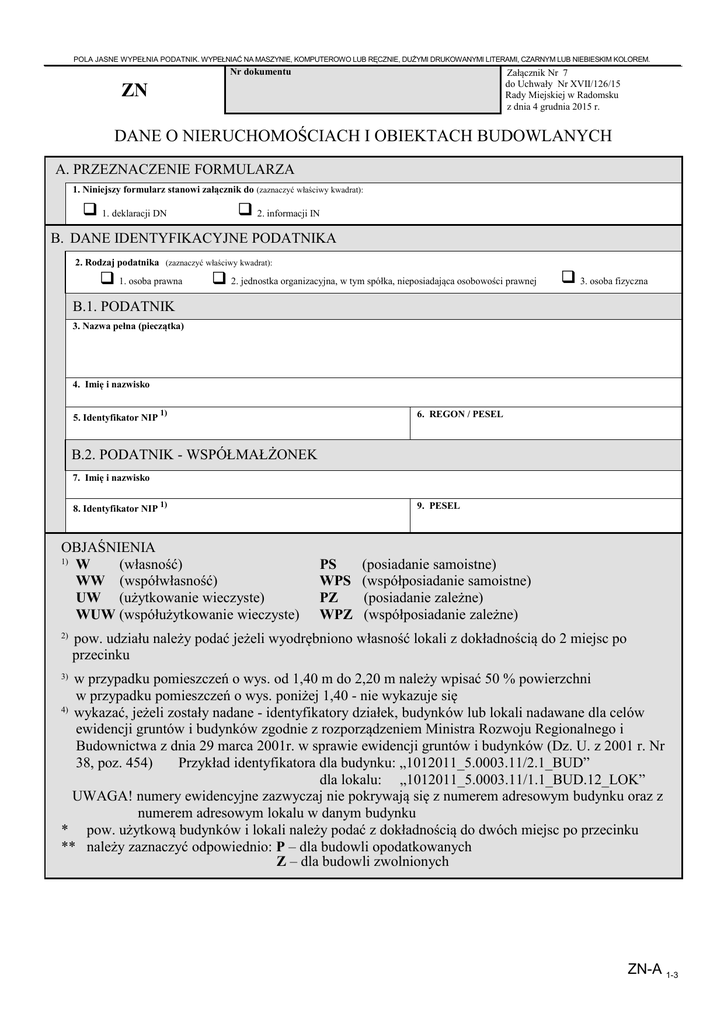 POLA JASNE WYPEŁNIA PODATNIK. WYPEŁNIAĆ NA MASZYNIE, KOMPUTEROWO LUB RĘCZNIE, DUŻYMI DRUKOWANYMI LITERAMI, CZARNYM LUB NIEBIESKIM KOLOREM. Nr dokumentu Załącznik Nr 7 do Uchwały Nr XVII/126/15 Rady Miejskiej w Radomsku z dnia 4 grudnia 2015 r. ZN DANE O NIERUCHOMOŚCIACH I OBIEKTACH BUDOWLANYCH A. PRZEZNACZENIE FORMULARZA 1. Niniejszy formularz stanowi załącznik do (zaznaczyć właściwy kwadrat): 1. deklaracji DN 2. informacji IN B. DANE IDENTYFIKACYJNE PODATNIKA 2. Rodzaj podatnika (zaznaczyć właściwy kwadrat): 1. osoba prawna 2. jednostka organizacyjna, w tym spółka, nieposiadająca osobowości prawnej 3. osoba fizyczna B.1. PODATNIK 3. Nazwa pełna (pieczątka) 4. Imię i nazwisko 5. Identyfikator NIP 1) 6. REGON / PESEL B.2. PODATNIK - WSPÓŁMAŁŻONEK 7. Imię i nazwisko 8. Identyfikator NIP 1) OBJAŚNIENIA 1) W (własność) WW (współwłasność) UW (użytkowanie wieczyste) WUW (współużytkowanie wieczyste) 2) 9. PESEL PS WPS PZ WPZ (posiadanie samoistne) (współposiadanie samoistne) (posiadanie zależne) (współposiadanie zależne) pow. udziału należy podać jeżeli wyodrębniono własność lokali z dokładnością do 2 miejsc po przecinku 3) w przypadku pomieszczeń o wys. od 1,40 m do 2,20 m należy wpisać 50 % powierzchni w przypadku pomieszczeń o wys. poniżej 1,40 - nie wykazuje się 4) wykazać, jeżeli zostały nadane - identyfikatory działek, budynków lub lokali nadawane dla celów ewidencji gruntów i budynków zgodnie z rozporządzeniem Ministra Rozwoju Regionalnego i Budownictwa z dnia 29 marca 2001r. w sprawie ewidencji gruntów i budynków (Dz. U. z 2001 r. Nr 38, poz. 454) Przykład identyfikatora dla budynku: „1012011_5.0003.11/2.1_BUD” dla lokalu: „1012011_5.0003.11/1.1_BUD.12_LOK” UWAGA! numery ewidencyjne zazwyczaj nie pokrywają się z numerem adresowym budynku oraz z numerem adresowym lokalu w danym budynku * pow. użytkową budynków i lokali należy podać z dokładnością do dwóch miejsc po przecinku ** należy zaznaczyć odpowiednio: P – dla budowli opodatkowanych Z – dla budowli zwolnionych ZN-A 1-3 D.1. WYKAZ BUDOWLI PODLEGAJĄCYCH OPODATKOWANIU LUB ZWOLNIENIU W PODATKU OD NIERUCHOMOŚCI Lp. Wartość określona na podstawie art. 4 ust. 1 pkt 3 i ust. 3-6 Nazwa budowli Numer inwentarzowy położenie P/Z** P R A Z E M Z UWAGA! W razie większej liczby budowli należy załączyć kolejną stronę ZN-A 2-3 według ustalonego wzoru ZN-A 2-3 D.2. DANE O NIERUCHOMOŚCIACH PODLEGAJĄCYCH OPODATKOWANIU LUB ZWOLNIENIU W PODATKU OD NIERUCHOMOŚCI Budynki * - pow. użytkowa3) Grunty Położenie (ulica, nr) 1 tytuł obręb nr prawny1) 2 działka nr pow. działki wysokość tytuł lub funkcja 1) prawny 1,40-2,20 pow. 2,20 rodzaj udziału2) identyfikator geodezyjny 3 4 4) 5 identyfikator geodezyjny 6 7 Księga wieczysta pomieszczenia przynależne wysokość gruntu lokal/e udział w częściach wspólnych 1,40-2,20 pow. 2,20 1,40-2,20 pow. 2,20 1,40-2,20 pow. 2,20 4) 8 Lokale*- pow. użytkowa3) 9 identyfikator geodezyjny4) 10 budynku -lokalu 11 12 UWAGA! W razie większej liczby nieruchomości należy załączyć kolejną stronę ZN-A 3-3 według ustalonego wzoru ZN-A 3-3