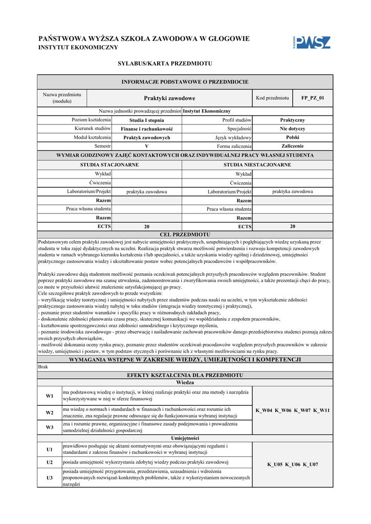 PAŃSTWOWA WYŻSZA SZKOŁA ZAWODOWA W GŁOGOWIE INSTYTUT EKONOMICZNY SYLABUS/KARTA PRZEDMIOTU INFORMACJE PODSTAWOWE O PRZEDMIOCIE Nazwa przedmiotu (modułu) Praktyki zawodowe Kod przedmiotu FP_PZ_01 Nazwa jednostki prowadzącej przedmiot Instytut Ekonomiczny Poziom kształcenia Studia I stopnia Kierunek studiów Finanse i rachunkowość Moduł kształcenia Praktyk zawodowych Język wykładowy Polski V Forma zaliczenia Zaliczenie Semestr Profil studiów Praktyczny Specjalność Nie dotyczy WYMIAR GODZINOWY ZAJĘĆ KONTAKTOWYCH ORAZ INDYWIDUALNEJ PRACY WŁASNEJ STUDENTA STUDIA STACJONARNE STUDIA NIESTACJONARNE Wykład Wykład Ćwiczenia Laboratorium/Projekt Ćwiczenia praktyka zawodowa Laboratorium/Projekt Razem Razem Praca własna studenta Praca własna studenta Razem ECTS praktyka zawodowa Razem 20 ECTS 20 CEL PRZEDMIOTU Podstawowym celem praktyki zawodowej jest nabycie umiejętności praktycznych, uzupełniających i pogłębiających wiedzę uzyskaną przez studenta w toku zajęć dydaktycznych na uczelni. Realizacja praktyk stwarza możliwość potwierdzenia i rozwoju kompetencji zawodowych studenta w ramach wybranego kierunku kształcenia i/lub specjalności, a także uzyskania wiedzy ogólnej i dziedzinowej, umiejętności praktycznego zastosowania wiedzy i ukształtowanie postaw wobec potencjalnych pracodawców i współpracowników. Praktyki zawodowe dają studentom możliwość poznania oczekiwań potencjalnych przyszłych pracodawców względem pracowników. Student poprzez praktyki zawodowe ma szansę utrwalenia, zademonstrowania i zweryfikowania swoich umiejętności, a także prezentacji chęci do pracy, co może w przyszłości ułatwić znalezienie satysfakcjonującej go pracy. Cele szczegółowe praktyk zawodowych to przede wszystkim: - weryfikację wiedzy teoretycznej i umiejętności nabytych przez studentów podczas nauki na uczelni, w tym wykształcenie zdolności praktycznego zastosowania wiedzy nabytej w toku studiów (integracja wiedzy teoretycznej i praktycznej), - poznanie przez studentów warunków i specyfiki pracy w różnorodnych zakładach pracy, - doskonalenie zdolności planowania czasu pracy, skutecznej komunikacji we współdziałaniu z zespołem pracowników, - kształtowanie spostrzegawczości oraz zdolności samodzielnego i krytycznego myślenia, - poznanie środowiska zawodowego - przez obserwację i naśladowanie zachowań pracowników danego przedsiębiorstwa studenci poznają zakres swoich przyszłych obowiązków, - możliwość dokonania oceny rynku pracy, poznanie przez studentów oczekiwań pracodawców względem przyszłych pracowników w zakresie wiedzy, umiejętności i postaw, w tym podstaw etycznych i porównanie ich z własnymi możliwościami na rynku pracy. WYMAGANIA WSTĘPNE W ZAKRESIE WIEDZY, UMIEJĘTNOŚCI I KOMPETENCJI Brak EFEKTY KSZTAŁCENIA DLA PRZEDMIOTU Wiedza W1 ma podstawową wiedzę o instytucji, w której realizuje praktyki oraz zna metody i narzędzia wykorzystywane w niej w sferze finansowej W2 ma wiedzę o normach i standardach w finansach i rachunkowości oraz rozumie ich znaczenie, zna regulacje prawne odnoszące się do funkcjonowania wybranej instytucji W3 zna i rozumie prawne, organizacyjne i finansowe zasady podejmowania i prowadzenia samodzielnej działalności gospodarczej U1 prawidłowo posługuje się aktami normatywnymi oraz obowiązującymi regułami i standardami z zakresu finansów i rachunkowości w wybranej instytucji U2 posiada umiejętność wykorzystania zdobytej wiedzy podczas praktyki zawodowej U3 posiada umiejętność przygotowania, przedstawienia, uzasadnienia i wdrożenia proponowanych rozwiązań konkretnych problemów, także z wykorzystaniem nowoczesnych narzędzi K_W04 K_W06 K_W07 K_W11 Umiejętności K_U05 K_U06 K_U07 Kompetencje społeczne K1 potrafi współdziałać w grupie i potrafi rozwiązywać problemy z zakresu rachunkowości i finansów w ramach zespołu K2 umie uczestniczyć w tworzeniu różnych projektów, wykorzystując wiedzę nabytą podczas studiów, partycypuje w działaniach publicznych, interesuje się lokalnym życiem gospodarczym K3 potrafi myśleć i działać w sposób kreatywny i przedsiębiorczy K_K02 K_K05 K_K07 NARZĘDZIA DYDAKTYCZNE Zapoznanie z miejscem, formami pracy i dokumentacją właściwymi dla danej instytucji. Obserwacja funkcjonowania instytucji Wykonanie zleconych zadań indywidualnie lub w zespole. Analiza i udoskonalanie planu praktyki w porozumieniu z opiekunem. TREŚCI KSZTAŁCENIA (PROGRAMOWE) I LICZBA GODZIN KONTAKTOWYCH Temat W ST C L /P W NST C L /P Poznanie specyfiki działania podmiotu, w którym student odbywa praktykę, poprzez analizę statutów, rozporządzeń etc. Poznanie przepisów z zakresu bezpieczeństwa i higieny pracy, identyfikacja problemów związanych z zarządzaniem finansami, zarządzania zmianami, zarządzania logistycznego i zasobami ludzkimi, itp. Poznanie struktury organizacyjnej podmiotu, zapoznanie się z zasadami kultury organizacyjnej jednostki, stylami zarządzania, zapoznanie się z EFC (Efficient Consumer Response) z doświadczeniem branż FMCG i JST Poznanie budowy i struktury systemu informacyjnego podmiotu, w którym student odbywa praktykę, zapoznanie się z otoczeniem zewnętrznym jednostki organizacyjnej, zapoznanie z zasadami ochrony danych osobowych i mienia Zrozumienie zasad związanych z organizacją oraz przeprowadzanie wywiadów z osobami odpowiedzialnymi za system informacyjny podmiotu, w którym student odbywa praktykę WERYFIKACJA EFEKTÓW KSZTAŁCENIA Egzamin Kolokwium Kod Opis W1 ma podstawową wiedzę o instytucji, w której realizuje praktyki oraz zna metody i narzędzia wykorzystywane w niej w sferze finansowej W2 ma wiedzę o normach i standardach w finansach i rachunkowości oraz rozumie ich znaczenie, zna regulacje prawne odnoszące się do funkcjonowania wybranej instytucji W3 zna i rozumie prawne, organizacyjne i finansowe zasady podejmowania i prowadzenia samodzielnej działalności gospo