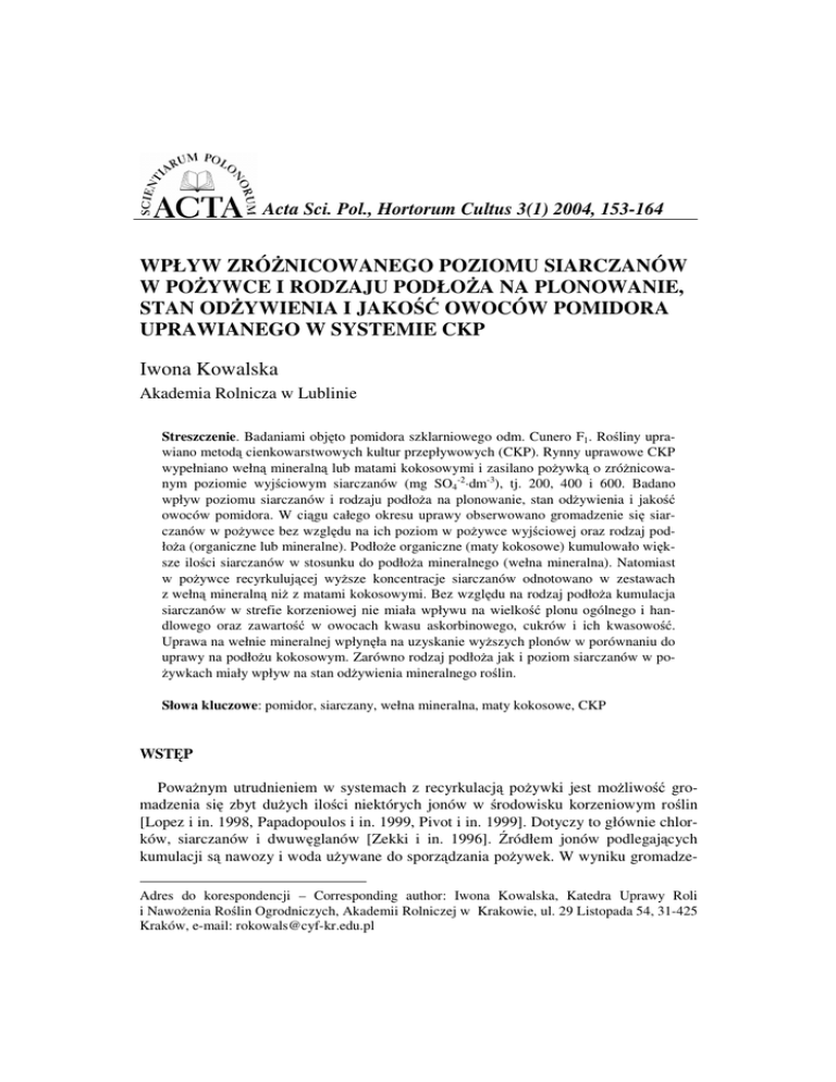 Acta Sci. Pol., Hortorum Cultus 3(1) 2004, 153-164 WPŁYW ZRÓĩNICOWANEGO POZIOMU SIARCZANÓW W POĩYWCE I RODZAJU PODŁOĩA NA PLONOWANIE, STAN ODĩYWIENIA I JAKOĝû OWOCÓW POMIDORA UPRAWIANEGO W SYSTEMIE CKP Iwona Kowalska Akademia Rolnicza w Lublinie Streszczenie. Badaniami objĊto pomidora szklarniowego odm. Cunero F1. RoĞliny uprawiano metodą cienkowarstwowych kultur przepływowych (CKP). Rynny uprawowe CKP wypełniano wełną mineralną lub matami kokosowymi i zasilano poĪywką o zróĪnicowanym poziomie wyjĞciowym siarczanów (mg SO4-2·dm-3), tj. 200, 400 i 600. Badano wpływ poziomu siarczanów i rodzaju podłoĪa na plonowanie, stan odĪywienia i jakoĞü owoców pomidora. W ciągu całego okresu uprawy obserwowano gromadzenie siĊ siarczanów w poĪywce bez wzglĊdu na ich poziom w poĪywce wyjĞciowej oraz rodzaj podłoĪa (organiczne lub mineralne). PodłoĪe organiczne (maty kokosowe) kumulowało wiĊksze iloĞci siarczanów w stosunku do podłoĪa mineralnego (wełna mineralna). Natomiast w poĪywce recyrkulującej wyĪsze koncentracje siarczanów odnotowano w zestawach z wełną mineralną niĪ z matami kokosowymi. Bez wzglĊdu na rodzaj podłoĪa kumulacja siarczanów w strefie korzeniowej nie miała wpływu na wielkoĞü plonu ogólnego i handlowego oraz zawartoĞü w owocach kwasu askorbinowego, cukrów i ich kwasowoĞü. Uprawa na wełnie mineralnej wpłynĊła na uzyskanie wyĪszych plonów w porównaniu do uprawy na podłoĪu kokosowym. Zarówno rodzaj podłoĪa jak i poziom siarczanów w poĪywkach miały wpływ na stan odĪywienia mineralnego roĞlin. Słowa kluczowe: pomidor, siarczany, wełna mineralna, maty kokosowe, CKP WSTĉP PowaĪnym utrudnieniem w systemach z recyrkulacją poĪywki jest moĪliwoĞü gromadzenia siĊ zbyt duĪych iloĞci niektórych jonów w Ğrodowisku korzeniowym roĞlin [Lopez i in. 1998, Papadopoulos i in. 1999, Pivot i in. 1999]. Dotyczy to głównie chlorków, siarczanów i dwuwĊglanów [Zekki i in. 1996]. ħródłem jonów podlegających kumulacji są nawozy i woda uĪywane do sporządzania poĪywek. W wyniku gromadzeAdres do korespondencji – Corresponding author: Iwona Kowalska, Katedra Uprawy Roli i NawoĪenia RoĞlin Ogrodniczych, Akademii Rolniczej w Krakowie, ul. 29 Listopada 54, 31-425 Kraków, e-mail: [email protected] 154 I. Kowalska nia siĊ jonów moĪe dochodziü do ich antagonizmów czy reakcji uwsteczniania siĊ składników pokarmowych poprzez tworzenie siĊ par jonów w roztworze pokarmowym [Adams 1971]. Procesy te mogą mieü wpływ na pobieranie składników pokarmowych przez roĞliny, a takĪe stanowiü utrudnienie w eksploatacji systemów doprowadzających poĪywkĊ (zatykanie emiterów). WielkoĞü i tempo gromadzenia siĊ siarczanów w strefie korzeniowej zaleĪy prawdopodobnie od wielu czynników (w tym od gatunku roĞliny, jej fazy rozwojowej, temperatury, jakoĞci wody) [Zekki i in. 1996, Michałojü i Nowak 1998]. WaĪny jest takĪe rodzaj podłoĪa, chociaĪ zagadnienie interakcji pomiĊdzy rodzajem podłoĪa a tempem akumulacji siarczanów nie jest jeszcze w pełni wyjaĞnione [Komosa i Gapys 1996]. Celem doĞwiadczenia było okreĞlenie wpływu zróĪnicowanego poziomu siarczanów w poĪywce (200, 400 i 600 mg·dm-3) i rodzaju podłoĪa (maty kokosowe i wełna mineralna) w uprawie pomidora w systemie CKP na tempo gromadzenia siĊ siarczanów w poĪywce i podłoĪu oraz plonowanie, stan odĪywienia i jakoĞü owoców pomidora. MATERIAŁ I METODY Badaniami objĊto roĞliny pomidora szklarniowego (Lycopersicon esculentum Mill.) odm. Cunero F1 uprawiane metodą cienkowarstwowych kultur przepływowych (CKP). Rynny uprawowe zestawów CKP wypełniano wełną mineralną Master (3 zestawy; I, II i III) lub matami kokosowymi Ceres (3 zestawy; IA, IIA i IIIA) i zasilano poĪywką o zróĪnicowanym poziomie wyjĞciowym siarczanów (mg SO4-2·dm-3), tj. zestaw I i IA – 200, zestaw II i IIA – 400 i zestaw III i IIIA – 600. Przez pierwsze 3 tygodnie uprawy w zestawach z matami kokosowymi (IA, IIA i IIIA) obniĪono poziom siarczanów i pozostałych składników w poĪywce w stosunki do poĪywek zasilających zestawy z wełną mineralną o 30%, tj. do 170, 280 i 420 mg SO4-2·dm-3. Wynikało to z naturalnej obecnoĞci makroskładników w podłoĪu kokosowym (tab. 1). NajniĪszy poziom siarczanów w poĪywce (zestawy I i IA) otrzymano poprzez zastosowanie nawozu wieloskładnikowego Superba Czerwona. Pozostałe poĪywki przygotowano na bazie nawozów pojedynczych i kwasu. PoĪywki nie róĪniły siĊ koncentracją podstawowych makroi mikroskładników (z wyjątkiem okresu pierwszych trzech tygodni), które utrzymywane były na poziomie zgodnym z zaleceniami Wysockiej-Owczarek [2001] dla poszczególnych faz wzrostu pomidora w uprawie na wełnie mineralnej. Odczyn poĪywki we wszystkich zestawach ustalano do poziomu pH 5,5–6,0 za pomocą kwasu azotowego, ortofosforowego lub siarkowego. W okresie uprawy roĞlin kontrolowano skład oraz odczyn poĪywek i korygowano za pomocą odpowiednich nawozów i kwasów. Tabela 1. Skład chemiczny podłoĪa kokosowego przed rozpoczĊciem uprawy Table 1. Chemical composition of coconut fiber before cultivation pHKCl pHH2O StĊĪenie soli Salt concentration g KCl·dm-3 5,74 6,30 0,93 N-NH4 N-NO3 P K Ca Mg S-SO4 Na 196 42,7 25 mg·dm-3 10,5 38,5 63 246 435 _____________________________________________________________________________________________________________________________________________ Acta Sci. Pol. Wpływ zróĪnicowanego poziomu siarczanów w poĪywce i rodzaju podłoĪa... 155 Dodatkowo w odstĊpach 7–14-dniowych z kaĪdego zestawu pobierano z kapilar poĪywkĊ i analizowano na zwartoĞü siarczanów. W chwili likwidacji uprawy wykonano analizĊ podłoĪa z mat kokosowych na zawartoĞü siarczanów. Stan odĪywienia roĞlin oceniano na podstawie zawartoĞci makro- oraz mikroelementów w blaszkach liĞciowych czwartego od góry w pełni wyroĞniĊtego liĞcia. M