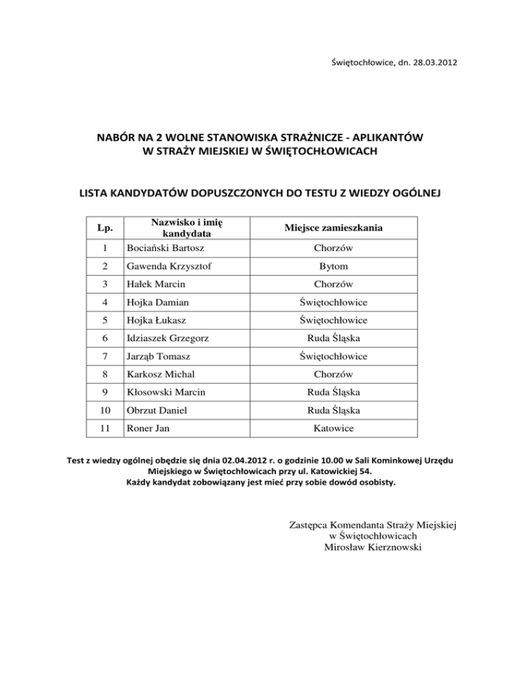 Świętochłowice, dn. 28.03.2012 NABÓR NA 2 WOLNE STANOWISKA STRAŻNICZE - APLIKANTÓW W STRAŻY MIEJSKIEJ W ŚWIĘTOCHŁOWICACH LISTA KANDYDATÓW DOPUSZCZONYCH DO TESTU Z WIEDZY OGÓLNEJ Lp. Nazwisko i imię kandydata Miejsce zamieszkania 1 Bociański Bartosz Chorzów 2 Gawenda Krzysztof 3 Hałek Marcin Chorzów 4 Hojka Damian Świętochłowice 5 Hojka Łukasz Świętochłowice 6 Idziaszek Grzegorz 7 Jarząb Tomasz Świętochłowice 8 Karkosz Michal Chorzów 9 Kłosowski Marcin Ruda Śląska 10 Obrzut Daniel Ruda Śląska 11 Roner Jan Bytom Ruda Śląska Katowice Test z wiedzy ogólnej obędzie się dnia 02.04.2012 r. o godzinie 10.00 w Sali Kominkowej Urzędu Miejskiego w Świętochłowicach przy ul. Katowickiej 54. Każdy kandydat zobowiązany jest mieć przy sobie dowód osobisty. Zastępca Komendanta Straży Miejskiej w Świętochłowicach Mirosław Kierznowski