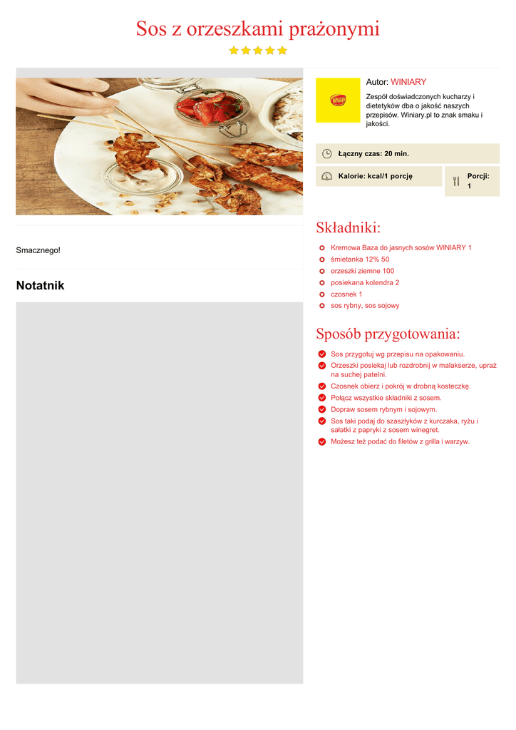 Sos z orzeszkami prażonymi Autor: WINIARY Zespół doświadczonych kucharzy i dietetyków dba o jakość naszych przepisów. Winiary.pl to znak smaku i jakości. Łączny czas: 20 min. Kalorie: kcal/1 porcję Porcji: 1 Składniki: Smacznego! Kremowa Baza do jasnych sosów WINIARY 1 śmietanka 12% 50 orzeszki ziemne 100 Notatnik posiekana kolendra 2 czosnek 1 sos rybny, sos sojowy Sposób przygotowania: Sos przygotuj wg przepisu na opakowaniu. Orzeszki posiekaj lub rozdrobnij w malakserze, upraż na suchej patelni. Czosnek obierz i pokrój w drobną kosteczkę. Połącz wszystkie składniki z sosem. Dopraw sosem rybnym i sojowym. Sos taki podaj do szaszłyków z kurczaka, ryżu i sałatki z papryki z sosem winegret. Możesz też podać do filetów z grilla i warzyw.