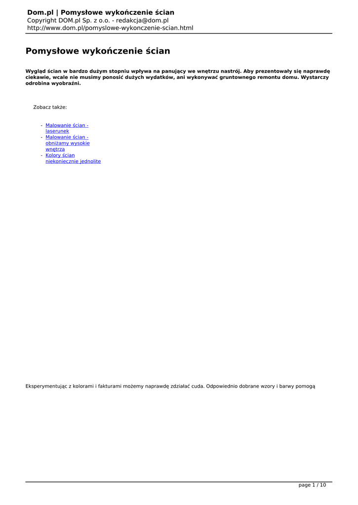 Dom.pl | Pomysłowe wykończenie ścian Copyright DOM.pl Sp. z o.o. - [email protected] http://www.dom.pl/pomyslowe-wykonczenie-scian.html Pomysłowe wykończenie ścian Wygląd ścian w bardzo dużym stopniu wpływa na panujący we wnętrzu nastrój. Aby prezentowały się naprawdę ciekawie, wcale nie musimy ponosić dużych wydatków, ani wykonywać gruntownego remontu domu. Wystarczy odrobina wyobraźni. Zobacz także: - Malowanie ścian laserunek - Malowanie ścian obniżamy wysokie wnętrza - Kolory ścian niekoniecznie jednolite Eksperymentując z kolorami i fakturami możemy naprawdę zdziałać cuda. Odpowiednio dobrane wzory i barwy pomogą page 1 / 10 Dom.pl | Pomysłowe wykończenie ścian Copyright DOM.pl Sp. z o.o. - [email protected] http://www.dom.pl/pomyslowe-wykonczenie-scian.html optycznie zmienić rozmiary wnętrza, a nawet skorygować jego kształt. page 2 / 10 Dom.pl | Pomysłowe wykończenie ścian Copyright DOM.pl Sp. z o.o. - [email protected] http://www.dom.pl/pomyslowe-wykonczenie-scian.html page 3 / 10 Dom.pl | Pomysłowe wykończenie ścian Copyright DOM.pl Sp. z o.o. - [email protected] http://www.dom.pl/pomyslowe-wykonczenie-scian.html page 4 / 10 Dom.pl | Pomysłowe wykończenie ścian Copyright DOM.pl Sp. z o.o. - [email protected] http://www.dom.pl/pomyslowe-wykonczenie-scian.html page 5 / 10 Dom.pl | Pomysłowe wykończenie ścian Copyright DOM.pl Sp. z o.o. - [email protected] http://www.dom.pl/pomyslowe-wykonczenie-scian.html (fot. archiwum DOM.pl) Fantazyjne wzory Jak najlepiej ożywić ścianyw naszym mieszkaniu? Popularne rozwiązanie stanowią stemple. Wcale nie musimy kupować w sklepie specjalistycznego zestawu. Jeśli zależy nam na ciekawym, artystycznym efekcie, możemy użyć gąbki lub nawet zgniecionego papieru. Granicą w takim wypadku jest tylko nasza wyobraźnia. Pamiętajmy tylko, by cała kompozycję wcześniej dobrze przemyśleć – spontaniczność może dać efekty, których będziemy później żałować. Bardzo ważne jest tez zabezpieczenie pozostałych ścian, oraz mebli. Innym pomysłem może być użycie szablonów i stworzenie za ich pomocą ciekawych wzorów na ścianach. Możemy postawić na tradycyjne (na przykład kwiatowe) wzory, lub zdecydować się na coś bardziej awangardowego. page 6 / 10 Dom.pl | Pomysłowe wykończenie ścian Copyright DOM.pl Sp. z o.o. - [email protected] http://www.dom.pl/pomyslowe-wykonczenie-scian.html Interesującą propozycją może być odwzorowanie na ścian obić mebli. Taka aranżacja wnętrza jest jednak trochę ryzykowna i sprawdzi się tylko, jeśli nie planujemy w najbliższym czasie gruntownej zmiany kolorystyki obić. Szablony to także świetny pomysł, jeśli chodzi o wystrój pokoju dziecka. Dzięki nim możemy w prosty sposób zapełnić ściany wizerunkami bohaterów bajek, czy innym lubianym przez pociechę motywem. Dla najlepszego efektu warto użyć płaskiej gąbki lub pędzla. Maczamy narzędzie w odrobinie farby a następnie pokrywamy przyłożony do ściany szablon. page 7 / 10 Dom.pl | Pomysłowe wykończenie ścian Copyright DOM.pl Sp. z o.o. - [email protected] http://www.dom.pl/pomyslowe-wykonczenie-scian.html (fot. archiwum DOM.pl) Pamiętajmy, by przed nałożeniem farby na ścianę otrzeć gąbkę lub pędzel z nadmiaru farby. W przeciwnym razie powstaną nieestetyczne, trudne do usunięcia ślady. Pamiętajmy, by odpowiednio rozplanować rozmieszczenie wzorów – najpierw nanosimy duże wzory, potem dodajemy mniejsze. Wygląd ścian w bardzo dużym stopniu wpływa na panujący we wnętrzu nastrój. Aby prezentowały się naprawdę ciekawie, wcale nie musimy ponosić dużych wydatków, ani wykonywać gruntownego remontu domu. Wystarczy odrobina wyobraźni. Odpowiednia kolorystyka O tym, jak istotne dla końcowego efektu są kolory ścian, nikomu nie trzeba przypominać. Zmiana kolorystyki może wpłynąć nie tylko na atmosferę wnętrza, ale także na naszą formę i samopoczucie. Powszechnie wiadomo, że jasne kolory powiększają wnętrze, zaś ciemne sprawiają, ze wydaje się ono większe. Nie oznacza to jednak, że ściany w małym pomieszczeniu musza być jednolite – jak najbardziej możemy na nich umieścić akcenty w intensywnych kolorach. Jeśli jednak urządzamy małe wnętrze, postawmy na delikatne ornamenty. Duże i krzykliwe wzory mogą bowiem sprawić, że aranżacja stanie się przytłaczająca. page 8 / 10 Dom.pl | Pomysłowe wykończenie ścian Copyright DOM.pl Sp. z o.o. - [email protected] http://www.dom.pl/pomyslowe-wykonczenie-scian.html (Fot. archiwum DOM.pl) Koloru nie należy się bać – warto go oswoić. Jeśli marzy nam się nietypowe połączenie - na przykład zieleni z czerwienią – być może to jest właśnie odpowiedni moment na realizację tego marzenia. Takie zestawienia lepiej sprawdzą się jednak w pokoju dziennym. Aranżacja sypialni z kolei to idealne miejsce na użycie pastelowych barw. Jak za pomocą kolorów modelować kształt pomieszczenia? Przykładowo, jasny sufit sprawi, ze niskie pomieszczenie wyda się wyższe. Nie musi być on koniecznie biały – wystarczy, że będzie o kilka tonów jaśniejszy niż ściany boczne. Podobnie zadziała sztuczka polegająca na namalowaniu na styku ścian z sufitem kilkucentymetrowego paska w tym samym kolorze, co sufit (tak, aby kolor „przechodził” na ściany). Efekt naprawdę może zadziwić! Eksperymenty z fakturą Jeśli chcemy wzbogacić nasz wystrój wnętrzao coś naprawdę oryginalnego, warto pobawić się trochę fakturą ścian. Wbrew pozorom, wcale nie jest to trudne. Zaczynamy od nałożenia farby podkładowej za pomocą wałka. Następnie nałożonej powierzchni nadajemy strukturę, na przykład za pomocą zwiniętego kawałka materiału, który toczymy po ścianie. page 9 / 10 Dom.pl | Pomysłowe wykończenie ścian Copyright DOM.pl Sp. z o.o. - [email protected] http://www.dom.pl/pomyslowe-wykonczenie-scian.html Zwinięty materiał możemy też nasącz