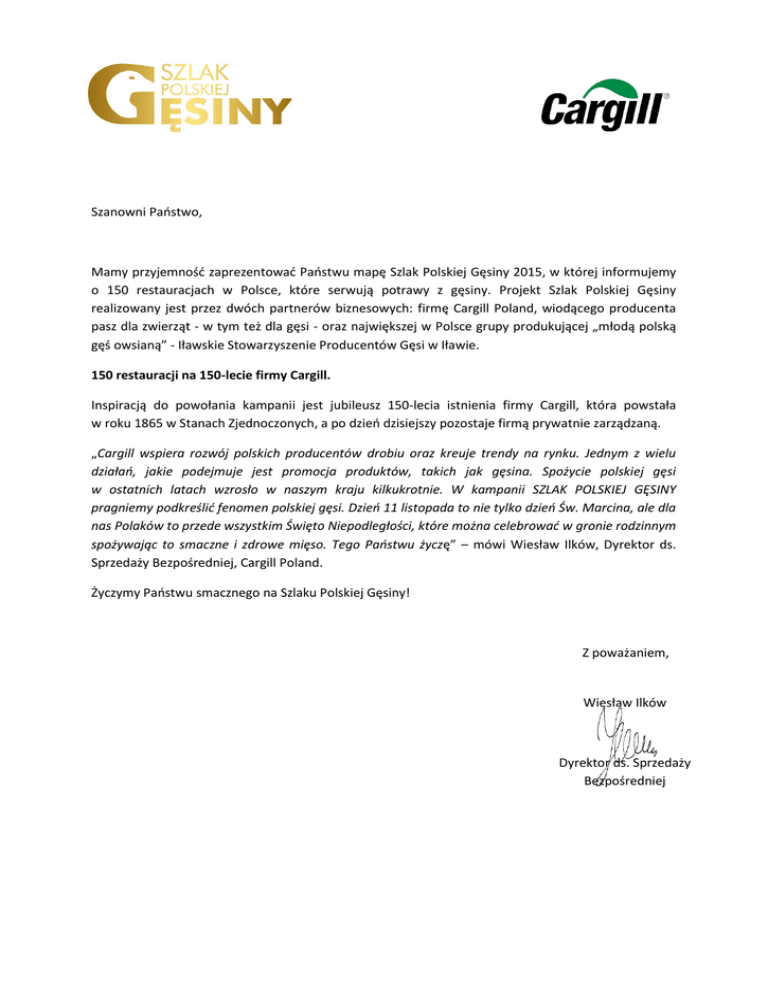 Szanowni Państwo, Mamy przyjemność zaprezentować Państwu mapę Szlak Polskiej Gęsiny 2015, w której informujemy o 150 restauracjach w Polsce, które serwują potrawy z gęsiny. Projekt Szlak Polskiej Gęsiny realizowany jest przez dwóch partnerów biznesowych: firmę Cargill Poland, wiodącego producenta pasz dla zwierząt - w tym też dla gęsi - oraz największej w Polsce grupy produkującej „młodą polską gęś owsianą” - Iławskie Stowarzyszenie Producentów Gęsi w Iławie. 150 restauracji na 150-lecie firmy Cargill. Inspiracją do powołania kampanii jest jubileusz 150-lecia istnienia firmy Cargill, która powstała w roku 1865 w Stanach Zjednoczonych, a po dzień dzisiejszy pozostaje firmą prywatnie zarządzaną. „Cargill wspiera rozwój polskich producentów drobiu oraz kreuje trendy na rynku. Jednym z wielu działań, jakie podejmuje jest promocja produktów, takich jak gęsina. Spożycie polskiej gęsi w ostatnich latach wzrosło w naszym kraju kilkukrotnie. W kampanii SZLAK POLSKIEJ GĘSINY pragniemy podkreślić fenomen polskiej gęsi. Dzień 11 listopada to nie tylko dzień Św. Marcina, ale dla nas Polaków to przede wszystkim Święto Niepodległości, które można celebrować w gronie rodzinnym spożywając to smaczne i zdrowe mięso. Tego Państwu życzę” – mówi Wiesław Ilków, Dyrektor ds. Sprzedaży Bezpośredniej, Cargill Poland. Życzymy Państwu smacznego na Szlaku Polskiej Gęsiny! Z poważaniem, Wiesław Ilków Dyrektor ds. Sprzedaży Bezpośredniej