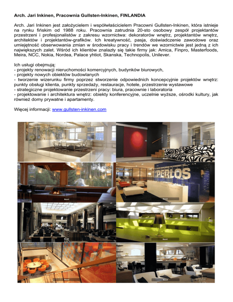 Arch. Jari Inkinen, Pracownia Gullsten-Inkinen, FINLANDIA Arch. Jari Inkinen jest założycielem i współwłaścicielem Pracowni Gullsten-Inkinen, która istnieje na rynku fińskim od 1988 roku. Pracownia zatrudnia 20-sto osobowy zespół projektantów przestrzeni i profesjonalistów z zakresu wzornictwa: dekoratorów wnętrz, projektantów wnętrz, architektów i projektantów-grafików. Ich kreatywność, pasja, doświadczenie zawodowe oraz umiejętność obserwowania zmian w środowisku pracy i trendów we wzornictwie jest jedną z ich największych zalet. Wśród ich klientów znalazły się takie firmy jak: Amica, Finpro, Masterfoods, Meira, NCC, Nokia, Nordea, Palace yhtiot, Skanska, Technopolis, Unilever. Ich usługi obejmują: - projekty renowacji nieruchomości komercyjnych, budynków biurowych, - projekty nowych obiektów budowlanych - tworzenie wizerunku firmy poprzez stworzenie odpowiednich koncepcyjnie projektów wnętrz: punkty obsługi klienta, punkty sprzedaży, restauracje, hotele, przestrzenie wystawowe - strategiczne projektowanie przestrzeni pracy: biura, pracownie i laboratoria - projektowanie i architektura wnętrz: obiekty konferencyjne, uczelnie wyższe, ośrodki kultury, jak również domy prywatne i apartamenty. Więcej informacji: www.gullsten-inkinen.com