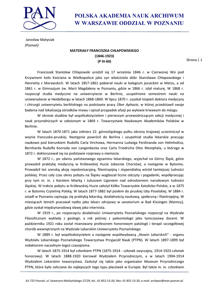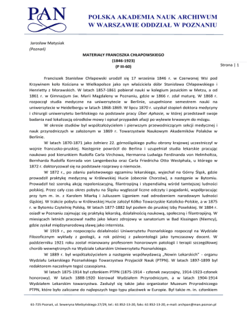 POLSKA AKADEMIA NAUK ARCHIWUM W WARSZAWIE ODDZIAŁ W POZNANIU Jarosław Matysiak (Poznań) MATERIAŁY FRANCISZKA CHŁAPOWSKIEGO (1846-1923) (P III-60) Franciszek Stanisław Chłapowski urodził się 17 września 1846 r. w Czerwonej Wsi pod Krzywinem koło Kościana w Wielkopolsce jako syn właściciela dóbr Stanisława Chłapowskiego i Henrietty z Morawskich. W latach 1857-1861 pobierał nauki w kolegium jezuickim w Metzu, a od 1861 r. w Gimnazjum św. Marii Magdaleny w Poznaniu, gdzie w 1866 r. zdał maturę. W 1868 r. rozpoczął studia medyczne na uniwersytecie w Berlinie, uzupełnione semestrem nauki na uniwersytecie w Heidelbergu w latach 1868-1869. W lipcu 1870 r. uzyskał stopień doktora medycyny i chirurgii uniwersytetu berlińskiego na podstawie pracy Über Aphasie, w której przedstawił swoje badania nad lokalizacją ośrodków mowy i opisał przypadek afazji po wylewie krwawym do mózgu. W okresie studiów był współzałożycielem i pierwszym przewodniczącym sekcji medycznej i nauk przyrodniczych w założonym w 1869 r. Towarzystwie Naukowym Akademików Polaków w Berlinie. W latach 1870-1871 jako żołnierz 22. górnośląskiego pułku obrony krajowej uczestniczył w wojnie francusko-pruskiej. Następnie powrócił do Berlina i uzupełniał studia lekarskie pracując naukowo pod kierunkiem Rudolfa Carla Virchowa, Hermanna Ludwiga Ferdinanda von Helmholtza, Bernharda Rudolfa Konrada von Langenbecka oraz Carla Friedricha Otto Westphala, u którego w 1872 r. doktoryzował się na podstawie rozprawy o niemocie. W 1872 r., po zdaniu państwowego egzaminu lekarskiego, wyjechał na Górny Śląsk, gdzie prowadził praktykę medyczną w Królewskiej Hucie (obecnie Chorzów), a następnie w Bytomiu. Prowadził też szeroką akcję repolonizacyjną, filantropijną i stypendialną wśród tamtejszej ludności polskiej. Przez cały czas okres pobytu na Śląsku wygłaszał liczne odczyty i pogadanki, współpracując przy tym m. in. z Karolem Miarką i Juliuszem Ligoniem nad odrodzeniem narodowym ludności śląskiej. W trakcie pobytu w Królewskiej Hucie założył Kółko Towarzyskie Katolicko-Polskie, a w 1875 r. w Bytomiu Czytelnię Polską. W latach 1877-1882 był posłem do pruskiej Izby Poselskiej. W 1884 r. osiadł w Poznaniu zajmując się praktyką lekarską, działalnością naukową, społeczną i filantropijną. W miesiącach letnich pracował nadto jako lekarz zdrojowy w sanatorium w Bad Kissingen (Niemcy), gdzie zyskał międzynarodową sławę jako internista. W 1919 r., po rozpoczęciu działalności Uniwersytetu Poznańskiego rozpoczął na Wydziale Filozoficznym wykłady z geologii, a rok później z paleontologii jako tymczasowy docent. W październiku 1921 roku został mianowany profesorem honorowym patologii i terapii szczegółowej chorób wewnętrznych na Wydziale Lekarskim Uniwersytetu Poznańskiego. W 1889 r. był współzałożycielem a następnie współwydawcą „Nowin Lekarskich” - organu Wydziału Lekarskiego Poznańskiego Towarzystwa Przyjaciół Nauk (PTPN). W latach 1897-1899 był redaktorem naczelnym tegoż czasopisma. W latach 1875-1914 był członkiem PTPN (1875-1914 - członek zwyczajny, 1914-1923-członek honorowy). W latach 1888-1920 kierował Wydziałem Przyrodniczym, a w latach 1904-1914 Wydziałem Lekarskim towarzystwa. Zasłużył się także jako organizator Muzeum Przyrodniczego PTPN, które było zaliczane do najlepszych tego typu placówek w Europie. Był także m. in. członkiem 61-725 Poznań, ul. Seweryna Mielżyńskiego 27/29, tel.: 61 852-13-20, faks: 61 852-13-20, e-mail: [email protected] Strona | 1 POLSKA AKADEMIA NAUK ARCHIWUM W WARSZAWIE ODDZIAŁ W POZNANIU Akademii Nauk Lekarskich w Warszawie (1920), członkiem honorowym Lubelskiego Towarzystwa Lekarskiego (1914), Towarzystwa Lekarskiego Warszawskiego (1914), członkiem honorowym Polskiego Towarzystwa Przyrodników im. Kopernika (1922) oraz członkiem Komisji Fizjograficznej Akademii Umiejętności. Władze pruskie, jako jednemu z niewielu Polaków lekarzy przyznały mu tytuł radcy sanitarnego (Sanitätsrat). Franciszek Chłapowski opublikował przeszło 100 oryginalnych rozpraw m. in. z zakresu Strona | 2 fizjologii, patologii i terapii chorób przewodu pokarmowego, m. in. O rozpoznawaniu niektórych zboczeń w położeniu jelit i o zapobieganiu ich skutkom (1889), neurologii, patologii, gruźlicy, m. in. Teleologiczne znaczenie zmian patologicznych występujących w gruźlicy i wynikające stąd wskazówki leczenia jej (1891), higieny m. in. Higiena rzemiosł (1875), O zdrojowiskach i stacyach kąpielowych i klimatycznych w Polsce (1895), zoologii, m. in. O nachodzeniu kilku gatunków słonia w niżu północnoniemieckim i polskim (1905), botaniki. Żonaty od 1877 r. z Marią Ireną Teresą z Łubieńskich. Małżeństwo miało czworo dzieci: trzy córki i syna. Franciszek Chłapowski zmarł 10 kwietnia 1923 r. w Żegocinie koło Witaszyc pod Pleszewem. Pochowany został na nieistniejącym już cmentarzu parafii św. Marcina przy ul. Towarowej w Poznaniu. Grób następnie przeniesiono na Cmentarz Zasłużonych Wielkopolan znajdujący się na Wzgórzu Św. Wojciecha w Poznaniu. Materiały Franciszka Chłapowskiego zostały zakupione przez Polską Akademię Nauk Archiwum w Warszawie w 1976 roku od pani Jolanty Stasiak (ks. nab. „B” 47 ). Spuścizna została uporządkowana i zinwentaryzowana przez Jarosława Matysiaka w roku 2014. Rozmiar zespołu wynosi 0, 08 mb. Spuścizna zawiera materiały z lat 1847-1938. Została podzielona na 4 zasadnicze grupy zgodnie z metodami porządkowania przyjętymi w Polskiej Akademii Nauk Archiwum w Warszawie. W grupie I, znajduje się tylko 1 jednostka archiwalna zawierająca fragment artykułu lub pracy O przesądzie w medycynie oraz notatki dotyczące zjawisk atmosferycznych. Grupa II, licząca 6 jednostek, zawiera materiały biograficzne i rodzinne z lat 1847-1883. Są to m. in. zeszyty szkolne, wiersze oraz notatki z okresu nauki