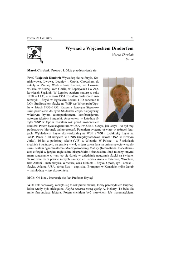 FOTON 89, Lato 2005 51 Wywiad z Wojciechem Dindorfem Marek Chrobak Uczeń Marek Chrobak: Proszę o krótkie przedstawienie się. Prof. Wojciech Dindorf: Wywodzę się ze Stryja, Stanisławowa, Lwowa, Legnicy i Opola. Chodziłem do szkoły w Zimnej Wodzie koło Lwowa, we Lwowie, w Jaśle, w Łużnej koło Gorlic, w Ropczycach i w Ząbkowicach Śląskich. W Legnicy zdałem maturę w roku 1950 w I LO, a w roku 1951 zostałem profesorem matematyki i fizyki w legnickim liceum TPD (obecnie II LO). Studiowałem fizykę na WSP we Wrocławiu/Opolu w latach 1953–1957. Razem z Ignacym Stępniowskim powołałem do życia Studencki Zespół Satyryczny, w którym byłem akompaniatorem, konferansjerem, autorem tekstów i muzyki. Asystentem w katedrze fizyki WSP w Opolu zostałem rok przed skończeniem studiów. Potem było stypendium w USA i w ZSRR. Uczyć, jak uczyć – to był mój podstawowy kierunek zainteresowań. Poznałem systemy oświaty w różnych krajach. Wykładałem fizykę doświadczalną na WSP i WSI i dydaktykę fizyki na WSP. Przez 6 lat uczyłem w UNIS (międzynarodowa szkoła ONZ w Nowym Jorku), 16 lat w podobnej szkole (VIS) w Wiedniu. W Polsce – w 7 szkołach średnich i wyższych, za granicą – w 4, w tym cztery lata na uniwersytecie wiedeńskim. Jestem egzaminatorem Międzynarodowej Matury (International Baccalaureate) z fizyki w języku angielskim, hiszpańskim i francuskim. Stąd miedzy innymi mam rozeznanie w tym, co się dzieje w dziedzinie nauczania fizyki na świecie. W rodzinie mam prawie samych nauczycieli: siostra Anna – fortepian, Wrocław, brat Antoni – matematyka, Wrocław, żona Elżbieta – fizyka, Opole, syn Tomasz – fizyka, Atlanta, USA, córka Ewa – anglistka, Brampton w Kanadzie, tylko Jakub – najmłodszy – jest ekonomistą. MCh: Od kiedy interesuje się Pan Profesor fizyką? WD: Tak naprawdę, zaczęło się to rok przed maturą, kiedy przeczytałem książkę, która wtedy była nielegalna, Fizyka stwarza nową epokę A. Piekary. To była dla mnie fascynująca lektura. Potem chciałem być muzykiem lub matematykiem. 52 FOTON 89, Lato 2005 Studia fizyczne wybrałem po dwóch latach nauczania fizyki w liceum. Potrzebowałem więcej wiedzieć, by uczyć. MCh: Ile książek Pan Profesor wydał? WD: Dziesięć. MCh: Nad czym Pan Profesor pracuje obecnie? WD: Nad śpiewnikiem. Uzbierałem z pamięci ponad 1200 tekstów starych (sprzed 1960 roku), piosenek – większość znanych jeszcze przed wojną. Chcę pokazać: 1. Ile człowiek może zapamiętać; 2. Jak ważne były w życiu piosenki i jak łatwo teksty śpiewane wchodziły do głowy. MCh: Co Profesor uważa za przełomowe wydarzenie w dziedzinie fizyki? WD: Było takich kilkadziesiąt, ale jeśli miałbym ograniczyć się do trzech, to uznałbym za przełomowe urodziny Newtona (1642), Faradaya (1791) oraz Einsteina (1879). MCh: Słyszałem, że redaguje Profesor internetowe czasopismo Moja Fizyka. WD: Przewodniczący Polskiego Towarzystwa Fizycznego prof. dr hab. Maciej Kolwas był chyba inicjatorem i został „patronem” tego pisma, i to on mi zaproponował, bym był naczelnym redaktorem. Tytuł ja wybrałem. MCh: Dziękuję za wyczerpujące odpowiedzi. Życzę miłego dnia. WD: Do widzenia.