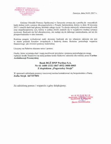 Gm i n n y o ś r o d e k POMOCY SPOŁECZNEJ 38-530 ZARSZYN . woj. podkarpackie OA1_ Zarszyn, dnia 24.01.2017 r. 00401156! Gminny Ośrodek Pomocy Społecznej w Zarszynie zwraca się z prośbą do wszystkich ludzi dobrej woli o pomoc dla pogorzelców z Posady Jaćmierskiej, którzy w dniu 18 stycznia 2017 r stracili dach nad głową, dorobek całego życia. To dwoje starszych, schorowanych osób oraz niepełnosprawny syn, którzy w jednej chwili znaleźli się w wyjątkowo trudnej sytuacji życiowej. Budynek nie był ubezpieczony, nie nadaje się do dalszego zamieszkania, ani też do przeprowadzenia w nim remontu. Rodzina pragnie wybudować mały skromny budynek ale we własnym zakresie nie jest w stanie ponieść kosztów związanych z budową domu. Rodzina potrzebuje wsparcia finansowego jak również pomocy materialnej Liczymy na Państwa okazane serce i pomoc. Osoby, które wyrażają chęć i mają możliwość przyjścia z pomocą potrzebującym mogą wpłacać środki finansowe na niżej podane konto bankowe założone dla rodziny przez Caritas Archidiecezji Przemyskiej Bank BGŻ BNP Paribas S.A. Nr 61 1600 1332 1847 4932 3000 0003 Z dopiskiem „Pogorzelcy Stręk” W sprawach udzielania pomocy rzeczowej można kontaktować się bezpośrednio z Panią Zofia Stręk 667337851 Za udzieloną pomoc i wsparcie z góry dziękujemy. KIEROWNIK G m in n e g o O ś t ó f t K f f o m o cy S potocznej yMZhk&ynte Beata Stankiewicz
