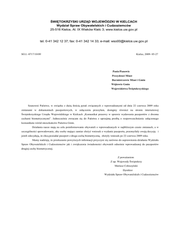 ŚWIĘTOKRZYSKI URZĄD WOJEWÓDZKI W KIELCACH Wydział Spraw Obywatelskich i Cudzoziemców 25-516 Kielce, Al. IX Wieków Kielc 3; www.kielce.uw.gov.pl tel. 0-41 342 12 37; fax: 0-41 342 14 33; e-mail: [email protected] SO.I.–0717/10/09 Kielce, 2009- 05-27 Panie/Panowie Prezydenci Miast Burmistrzowie Miast i Gmin Wójtowie Gmin Województwa Świętokrzyskiego Szanowni Państwo, w związku z duŜą ilością pytań związanych z wprowadzanymi od dnia 22 czerwca 2009 roku zmianami w dokumentach paszportowych, w załączeniu przesyłam, dostępny równieŜ na stronie internetowej Świętokrzyskiego Urzędu Wojewódzkiego w Kielcach „Komunikat prasowy w sprawie wydawania paszportów z dwoma cechami biometrycznymi”. Jednocześnie zwracam się do Państwa z uprzejmą prośbą o rozpowszechnienie załączonego komunikatu wśród mieszkańców Państwa Gmin. Działania nasze mają na celu poinformowanie obywateli o wprowadzanych w najbliŜszym czasie zmianach, a w szczególności spowodowanie, aby osoby mające zamiar złoŜyć wniosek o wydanie paszportu, przemyślały swoją decyzję i jeŜeli zdecydują, Ŝe chcą posiadać paszport z druga cechą biometryczną, złoŜyły wniosek po 22 czerwca 2009 roku. Mamy nadzieję, Ŝe przekazanie powyŜszych informacji przyczyni się zarówno do usprawnienia działania Wydziału Spraw Obywatelskich i Cudzoziemców jak i zwiększenia świadomości obywateli odnośnie wprowadzanej do paszportów drugiej cechy biometrycznej. Z powaŜaniem Z up. Wojewody Świętokrzy Mariusz Cołoszyński Dyrektor Wydziału Spraw Obywatelskich i Cudzoziemców Komunikat w sprawie wydawania paszportów z dwoma cechami biometrycznymi Od 29 czerwca 2009 r. wydawane w Polsce paszporty zawierać będą drugą cechę biometryczną, tj. obok obrazu twarzy, zapis odcisków palców. Polska rozpoczęła wydawanie paszportów biometrycznych, do tej pory z jedną cechą, 28 sierpnia 2006 r. Obowiązek taki nałoŜyło na kraje członkowskie Unii Europejskiej Rozporządzenie Rady (WE) nr 2252/2004 z dnia 13 grudnia 2004 r. w sprawie norm dotyczących zabezpieczeń i danych biometrycznych w paszportach i dokumentach podróŜy wydawanych przez Państwa Członkowskie . Paszporty biometryczne w sposób wiarygodny określają związek pomiędzy dokumentem a jego posiadaczem, dzięki czemu ograniczają przestępczość związaną z kradzieŜą toŜsamości i fałszerstwami dokumentów. JuŜ od 22 czerwca br. w kraju, a nie później niŜ od 29 czerwca br. - poza granicami , kaŜda osoba składająca w punkcie paszportowym wniosek o wydanie paszportu, będzie zobowiązana do złoŜenia odcisków dwóch palców, polegającego na przyłoŜeniu palców do urządzenia elektronicznego (czytnika). Urządzenia słuŜące do pobierania odcisków palców są nowoczesne, niebrudzące i łatwe w obsłudze. Punkty paszportowe zostaną wyposaŜone w krótkie instrukcje tekstowe oraz, w miarę moŜliwości, instrukcje audiowizualne. Odpowiednio przeszkoleni pracownicy organów paszportowych będą udzielać wszelkich niezbędnych informacji i słuŜyć pomocą, aby zapewnić sprawną i szybką obsługę osób aplikujących o paszport. Procedura poboru odcisków palców oraz weryfikacji danych zawartych w paszporcie podczas jego odbioru jest prosta i tylko nieznacznie wydłuŜy załatwianie sprawy paszportowej. Odciski palców będą zakodowane w warstwie elektronicznej paszportu jako element identyfikacji i nie będą odwzorowane graficznie w dokumencie (nie będą widoczne). Odciski palców nie będą gromadzone w ewidencjach paszportowych. Czas oczekiwania na wydanie paszportu oraz opłaty za jego wydanie nie ulegną zmianie Wszystkie paszporty wydane przed 29 czerwca 2009 r. - bez względu na ich rodzaj - zachowają waŜność do terminów w nich określonych, np. paszport wydany w 2000 r. utraci, waŜność dopiero w 2010 r., paszport wydany w 2007 r. będzie waŜny do 2017r. Wobec wprowadzenia do paszportów drugiej cechy biometrycznej w konsulatach RP będzie zainstalowany teleinformatyczny system obsługi spraw paszportowych, który wpłynie na skrócenie czasu oczekiwania na paszport przez osoby wnioskujące o jego wydanie poza granicami kraju